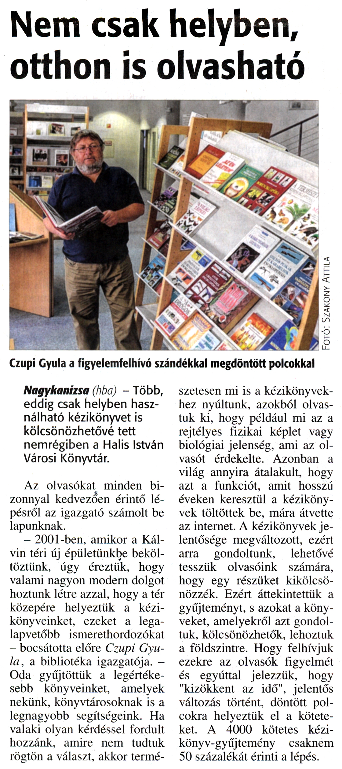 Nyilvános 1992 | 3749 | Zalai Hírlap 2015. december 8. 287. szám 5. oldal | Nem csak helyben, otthon is olvasható Czupi Gyula a figyelemfelhívó szándékkal megdöntött polcokkal Nagykanizsa (hba) - Több, eddig csak helyben használható kézikönyvet is kölcsönözhetővé tett nemrégiben a Halis István Városi Könyvtár. Az olvasókat minden bizonnyal kedvezően érintő lépésről az igazgató számolt be lapunknak. - 2001-ben, amikor a Kálvin téri új épületünkbe beköltöztünk, úgy éreztük, hogy valami nagyon modern dolgot hoztunk létre azzal, hogy a tér közepére helyeztük a kézikönyveinket, ezeket a legalapvetőbb ismerethordozókat - bocsátotta előre Czupi Gyula, a bibliotéka igazgatója. -Oda gyűjtöttük a legértékesebb könyveinket, amelyek nekünk, könyvtárosoknak is a legnagyobb segítségeink. Ha valaki olyan kérdéssel fordult hozzánk, amire nem tudtuk rögtön a választ, akkor természetesen mi is a kézikönyvekhez nyúltunk, azokból olvastuk ki, hogy például mi az a rejtélyes fizikai képlet vagy biológiai jelenség, ami az olvasót érdekelte. Azonban a világ annyira átalakult, hogy azt a funkciót, amit hosszú éveken keresztül a kézikönyvek töltöttek be, mára átvette az internet. A kézikönyvek jelentősége megváltozott, ezért arra gondoltunk, lehetővé tesszük olvasóink számára, hogy egy részüket kikölcsönözzék. Ezért áttekintettük a gyűjteményt, s azokat a könyveket, amelyekről azt gondoltuk, kölcsönözhetők, lehoztuk a földszintre. Hogy felhívjuk ezekre az olvasók figyelmét és egyúttal jelezzük, hogy "kizökkent az idő", jelentős változás történt, döntött polcokra helyeztük el a köteteket. A 4000 kötetes kézikönyv-gyűjtemény csaknem 50 százalékát érinti a lépés. |