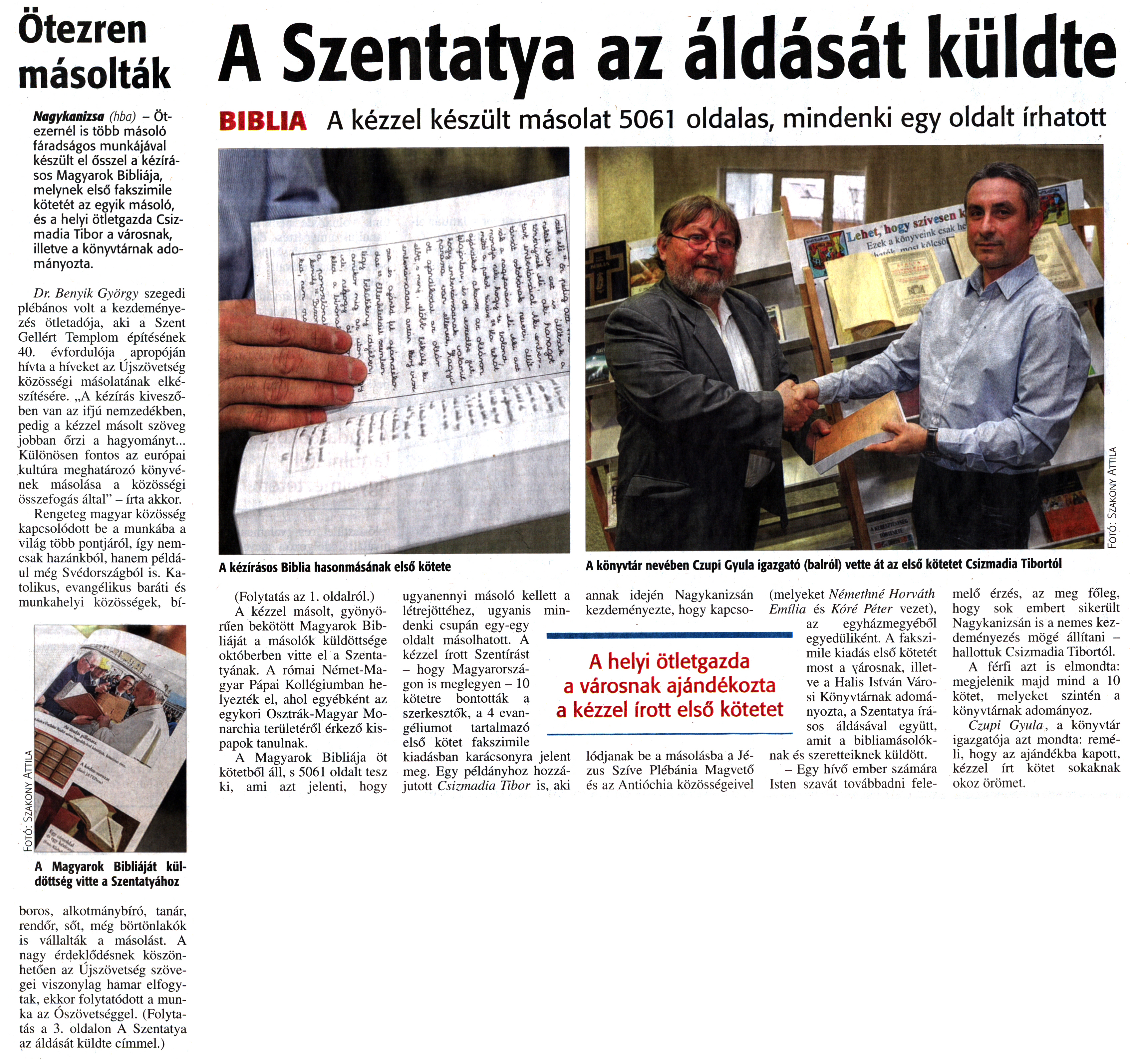Nyilvános 2074 | 3922 | Zalai Hírlap 2016. január 6. 4. szám 1, 3. oldal - Ötezren másolták - A Szentatya az áldását küldte | Ötezren másolták Nagykanizsa (hba) - Ötezernél is több másoló fáradságos munkájával készült el ősszel a kézírásos Magyarok Bibliája, melynek első fakszimile kötetét az egyik másoló, és a helyi ötletgazda Csizmadia Tibor a városnak, illetve a könyvtárnak adományozta. Dr. Benyik György szegedi plébános volt a kezdeményezés ötletadója, aki a Szent Gellért Templom építésének 40. évfordulója apropóján hívta a híveket az Újszövetség közösségi másolatának elkészítésére. „A kézírás kiveszőben van az ifjú nemzedékben, pedig a kézzel másolt szöveg jobban őrzi a hagyományt... Különösen fontos az európai kultúra meghatározó könyvének másolása a közösségi összefogás által" - írta akkor. Rengeteg magyar közösség kapcsolódott be a munkába a világ több pontjáról, így nemcsak hazánkból, hanem például még Svédországból is. Katolikus, evangélikus baráti és munkahelyi közösségek, bíboros, alkotmánybíró, tanár, rendőr, sőt, még börtönlakók is vállalták a másolást. A nagy érdeklődésnek köszönhetően az Újszövetség szövegei viszonylag hamar elfogytak, ekkor folytatódott a munka az Ószövetséggel. (Folytatás a 3. oldalon A Szentatya az áldását küldte címmel.) A Szentatya az áldását küldte BIBLIA A kézzel készült másolat 5061 oldalas, mindenki egy oldalt írhatott A kézírásos Biblia hasonmásának első kötete A könyvtár nevében Czupi Gyula igazgató (balról) vette át az első kötetet Csizmadia Tibortól (Folytatás az 1. oldalról.) A kézzel másolt, gyönyörűen bekötött Magyarok Bibliáját a másolók küldöttsége októberben vitte el a Szentatyának. A római Német-Magyar Pápai Kollégiumban helyezték el, ahol egyébként az egykori Osztrák-Magyar Monarchia területéről érkező kispapok tanulnak. A Magyarok Bibliája öt kötetből áll, s 5061 oldalt tesz ki, ami azt jelenti, hogy ugyanennyi másoló kellett a létrejöttéhez, ugyanis mindenki csupán egy-egy oldalt másolhatott. A kézzel írott Szentírást - hogy Magyarországon is meglegyen - 10 kötetre bontották a szerkesztők, a 4 evangéliumot tartalmazó első kötet fakszimile kiadásban karácsonyra jelent meg. Egy példányhoz hozzájutott Csizmadia Tibor is, aki annak idején Nagykanizsán kezdeményezte, hogy kapcsolódjanak be a másolásba a Jézus Szíve Plébánia Magvető és az Antióchia közösségeivel (melyeket Némethné Horváth Emília és Kóré Péter vezet), az egyházmegyéből egyedüliként. A fakszimile kiadás első kötetét most a városnak, illetve a Halis István Városi Könyvtárnak adományozta, a Szentatya írásos áldásával együtt, amit a bibliamásolóknak és szeretteiknek küldött. - Egy hívő ember számára Isten szavát továbbadni felemelő érzés, az meg főleg, hogy sok embert sikerült Nagykanizsán is a nemes kezdeményezés mögé állítani - hallottuk Csizmadia Tibortól. A férfi azt is elmondta: megjelenik majd mind a 10 kötet, melyeket szintén a könyvtárnak adományoz. Czupi Gyula, a könyvtár igazgatója azt mondta: reméli, hogy az ajándékba kapott, kézzel írt kötet sokaknak okoz örömet. |