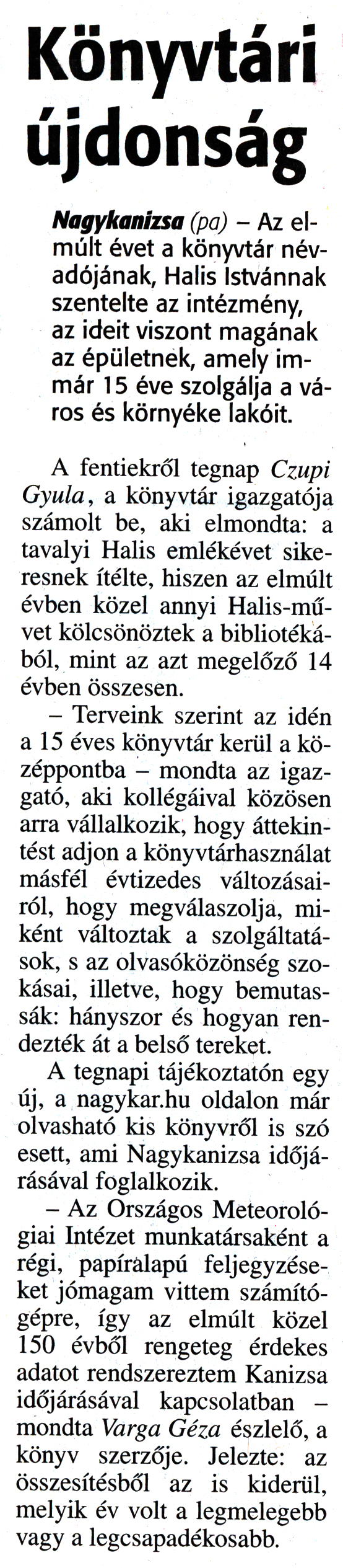 Nyilvános 2144 | 3947 | Zalai Hírlap 2016. január 6. 4. szám 3. oldal - Könyvtári újdonság | Könyvtári újdonság Nagykanizsa (pa) - Az elmúlt évet a könyvtár névadójának, Halis Istvánnak szentelte az intézmény, az ideit viszont magának az épületnek, amely immár 15 éve szolgálja a város és környéke lakóit. A fentiekről tegnap Czupi Gyula, a könyvtár igazgatója számolt be, aki elmondta: a tavalyi Halis emlékévet sikeresnek ítélte, hiszen az elmúlt évben közel annyi Halis-művet kölcsönöztek a bibliotékából, mint az azt megelőző 14 évben összesen. - Terveink szerint az idén a 15 éves könyvtár kerül a középpontba - mondta az igazgató, aki kollégáival közösen arra vállalkozik, hogy áttekintést adjon a könyvtárhasználat másfél évtizedes változásairól, hogy megválaszolja, miként változtak a szolgáltatások, s az olvasóközönség szokásai, illetve, hogy bemutassák: hányszor és hogyan rendezték át a belső tereket. A tegnapi tájékoztatón egy új, a nagykar.hu oldalon már olvasható kis könyvről is szó esett, ami Nagykanizsa időjárásával foglalkozik. - Az Országos Meteorológiai Intézet munkatársaként a régi, papíralapú feljegyzéseket jómagam vittem számítógépre, így az elmúlt közel 150 évből rengeteg érdekes adatot rendszereztem Kanizsa időjárásával kapcsolatban - mondta Varga Géza észlelő, a könyv szerzője. Jelezte: az összesítésből az is kiderül, melyik év volt a legmelegebb vagy a legcsapadékosabb. |
