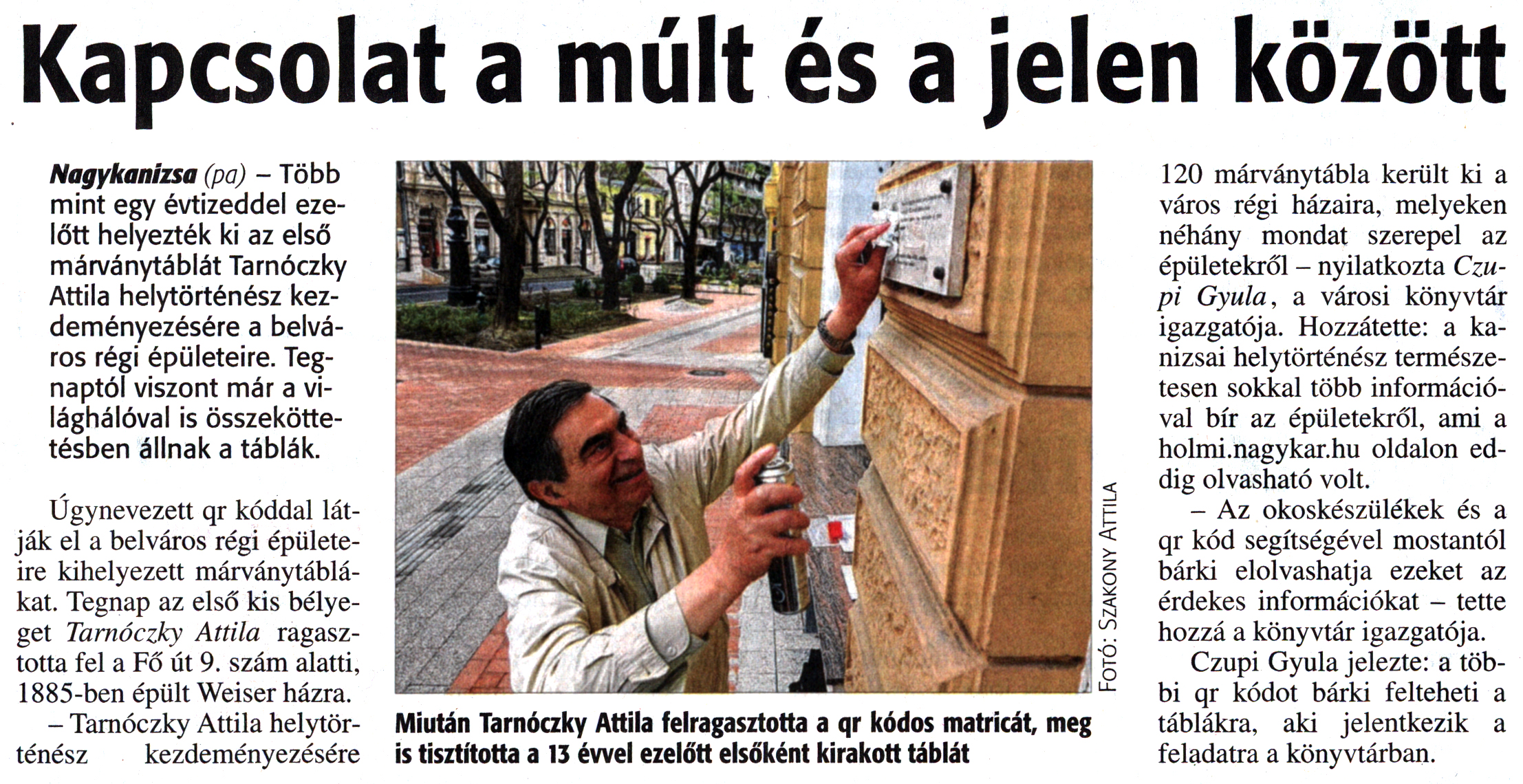 Nyilvános 1528 | 2719 | Zalai Hírlap 2016. április 15. 72. szám 2. oldal | Kapcsolat a múlt és a jelen között Nagykanizsa (pa) - Több mint egy évtizeddel ezelőtt helyezték ki az első márványtáblát Tarnóczky Attila helytörténész kezdeményezésére a belváros régi épületeire. Tegnaptól viszont már a világhálóval is összeköttetésben állnak a táblák. Úgynevezett qr kóddal látják el a belváros régi épületeire kihelyezett márványtáblákat. Tegnap az első kis bélyeget Tarnóczky Attila ragasztotta fel a Fő út 9. szám alatti, 1885-ben épült Weiser házra. - Tarnóczky Attila helytörténész kezdeményezésére Miután Tarnóczky Attila felragasztotta a qr kódos matricát, meg is tisztította a 13 évvel ezelőtt elsőként kirakott táblát 120 márványtábla került ki a város régi házaira, melyeken néhány mondat szerepel az épületekről - nyilatkozta Czupi Gyula, a városi könyvtár igazgatója. Hozzátette: a kanizsai helytörténész természetesen sokkal több információval bír az épületekről, ami a holmi.nagykar.hu oldalon eddig olvasható volt. - Az okoskészülékek és a qr kód segítségével mostantól bárki elolvashatja ezeket az érdekes információkat - tette hozzá a könyvtár igazgatója. Czupi Gyula jelezte: a többi qr kódot bárki felteheti a táblákra, aki jelentkezik a feladatra a könyvtárban. |