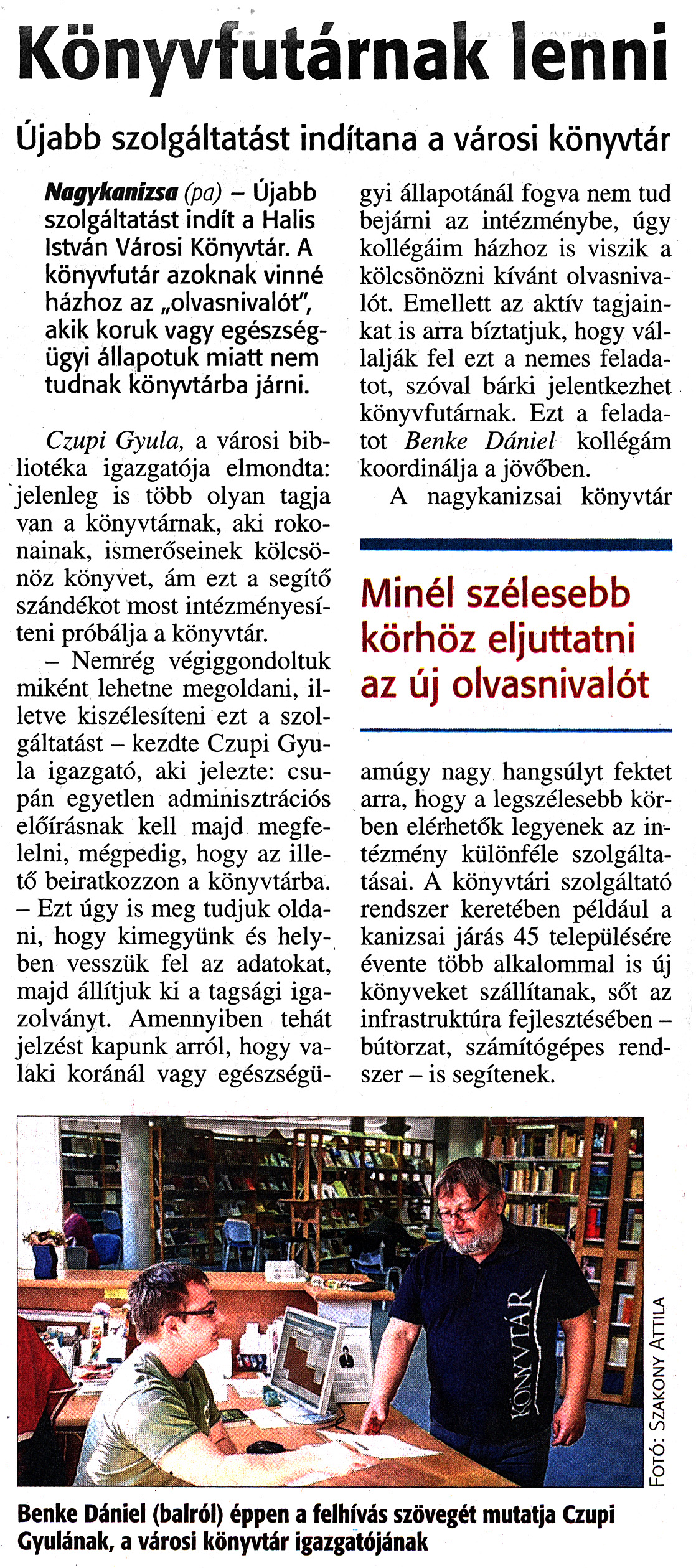 Nyilvános 1799 | 3252 | Zalai Hírlap 2017. március 16. 63. szám 4. oldal | Könyvfutárnak lenni Újabb szolgáltatást indítana a városi könyvtár Nagykanizsa (pa) - Újabb szolgáltatást indít a Halis István Városi Könyvtár. A könyvfutár azoknak vinné házhoz az „olvasnivalót", akik koruk vagy egészségügyi állapotuk miatt nem tudnak könyvtárba járni. Czupi Gyula, a városi bibliotéka igazgatója elmondta: jelenleg is több olyan tagja van a könyvtárnak, aki rokonainak, ismerőseinek kölcsönöz könyvet, ám ezt a segítő szándékot most intézményesíteni próbálja a könyvtár. - Nemrég végiggondoltuk miként lehetne megoldani, illetve kiszélesíteni ezt a szolgáltatást - kezdte Czupi Gyula igazgató, aki jelezte: csupán egyetlen adminisztrációs előírásnak kell majd megfelelni, mégpedig, hogy az illető beiratkozzon a könyvtárba. - Ezt úgy is meg tudjuk oldani, hogy kimegyünk és helyben vesszük fel az adatokat, majd állítjuk ki a tagsági igazolványt. Amennyiben tehát jelzést kapunk arról, hogy valaki koránál vagy egészségügyi állapotánál fogva nem tud bejárni az intézménybe, úgy kollégáim házhoz is viszik a kölcsönözni kívánt olvasnivalót. Emellett az aktív tagjainkat is arra bíztatjuk, hogy vállalják fel ezt a nemes feladatot, szóval bárki jelentkezhet könyvfutárnak. Ezt a feladatot Benke Dániel kollégám koordinálja a jövőben. A nagykanizsai könyvtár Minél szélesebb körhöz eljuttatni az új olvasnivalót amúgy nagy hangsúlyt fektet arra, hogy a legszélesebb körben elérhetők legyenek az intézmény különféle szolgáltatásai. A könyvtári szolgáltató rendszer keretében például a kanizsai járás 45 településére évente több alkalommal is új könyveket szállítanak, sőt az infrastruktúra fejlesztésében -bútorzat, számítógépes rendszer - is segítenek. Benke Dániel (balról) éppen a felhívás szövegét mutatja Czupi Gyulának, a városi könyvtár igazgatójának |