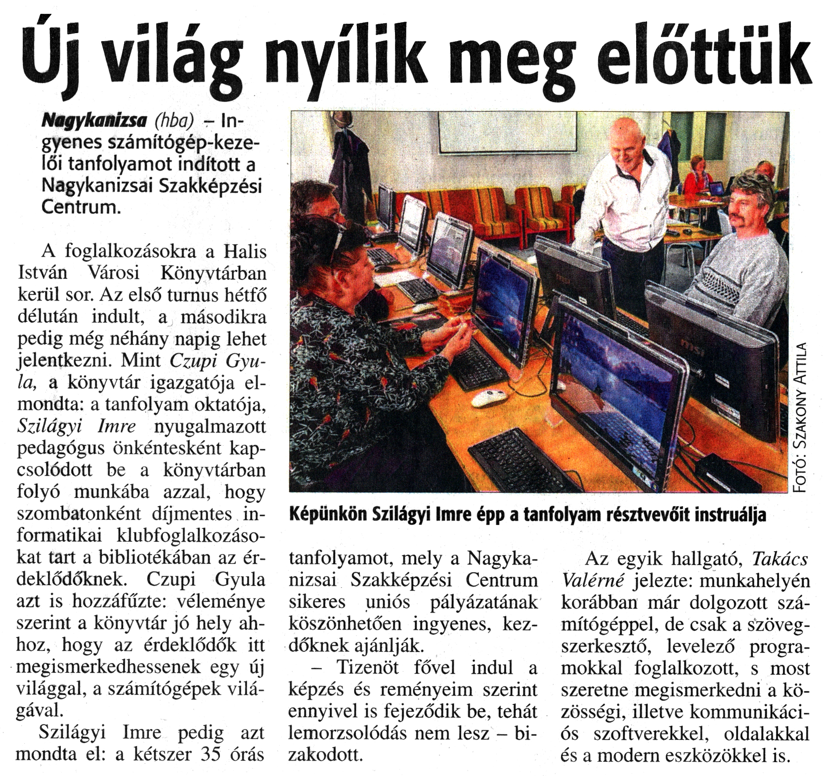 Nyilvános 1745 | 3426 | Zalai Hírlap 2017. március 17. 64. szám 3. oldal | Új világ nyílik meg előttük Nagykanizsa (hba) - Ingyenes számítógép-kezelői tanfolyamot indított a Nagykanizsai Szakképzési Centrum. A foglalkozásokra a Halis István Városi Könyvtárban kerül sor. Az első turnus hétfő délután indult, a másodikra pedig még néhány napig lehet jelentkezni. Mint Czupi Gyula, a könyvtár igazgatója elmondta: a tanfolyam oktatója, Szilágyi Imre nyugalmazott pedagógus önkéntesként kapcsolódott be a könyvtárban folyó munkába azzal, hogy szombatonként díjmentes informatikai klubfoglalkozásokat tart a bibliotékában az érdeklődőknek. Czupi Gyula azt is hozzáfűzte: véleménye szerint a könyvtár jó hely ahhoz, hogy az érdeklődők itt megismerkedhessenek egy új világgal, a számítógépek világával. Szilágyi Imre pedig azt mondta el: a kétszer 35 órás tanfolyamot, mely a Nagykanizsai Szakképzési Centrum sikeres uniós pályázatának köszönhetően ingyenes, kezdőknek ajánlják. - Tizenöt fővel indul a képzés és reményeim szerint ennyivel is fejeződik be, tehát lemorzsolódás nem lesz - bizakodott. Az egyik hallgató, Takács Valérné jelezte: munkahelyén korábban már dolgozott számítógéppel, de csak a szövegszerkesztő, levelező programokkal foglalkozott, s most szeretne megismerkedni a közösségi, illetve kommunikációs szoftverekkel, oldalakkal és a modern eszközökkel is. Képünkön Szilágyi Imre épp a tanfolyam résztvevőit instruálja |