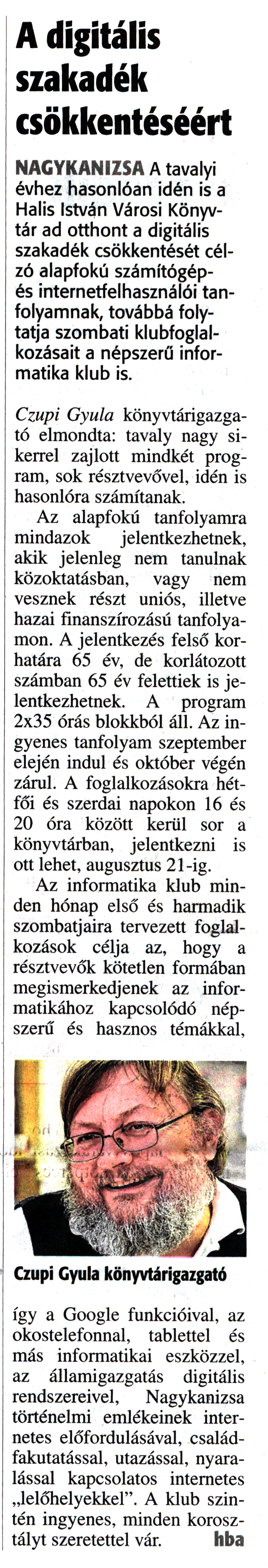 Nyilvános 1636 | 3206 | Zalai Hírlap 2017. augusztus 10. 185. szám 4. oldal | A digitális szakadék csökkentéséért NAGYKANIZSA A tavalyi évhez hasonlóan idén is a Halis István Városi Könyvtár ad otthont a digitális szakadék csökkentését célzó alapfokú számítógép-és internetfelhasználói tanfolyamnak, továbbá folytatja szombati klubfoglalkozásait a népszerű informatika klub is. Czupi Gyula könyvtárigazgató elmondta: tavaly nagy sikerrel zajlott mindkét program, sok résztvevővel, idén is hasonlóra számítanak. Az alapfokú tanfolyamra mindazok jelentkezhetnek, akik jelenleg nem tanulnak közoktatásban, vagy nem vesznek részt uniós, illetve hazai finanszírozású tanfolyamon. A jelentkezés felső korhatára 65 év, de korlátozott számban 65 év felettiek is jelentkezhetnek. A program 2x35 órás blokkból áll. Az ingyenes tanfolyam szeptember elején indul és október végén zárul. A foglalkozásokra hétfői és szerdai napokon 16 és 20 óra között kerül sor a könyvtárban, jelentkezni is ott lehet, augusztus 21-ig. Az informatika klub minden hónap első és harmadik szombatjaira tervezett foglalkozások célja az, hogy a résztvevők kötetlen formában megismerkedjenek az informatikához kapcsolódó népszerű és hasznos témákkal, így a Google funkcióival, az okostelefonnal, tablettel és más informatikai eszközzel, az államigazgatás digitális rendszereivel, Nagykanizsa történelmi emlékeinek internetes előfordulásával, családfakutatással, utazással, nyaralással kapcsolatos internetes „lelőhelyekkel". A klub szintén ingyenes, minden korosztályt szeretettel vár. hba |