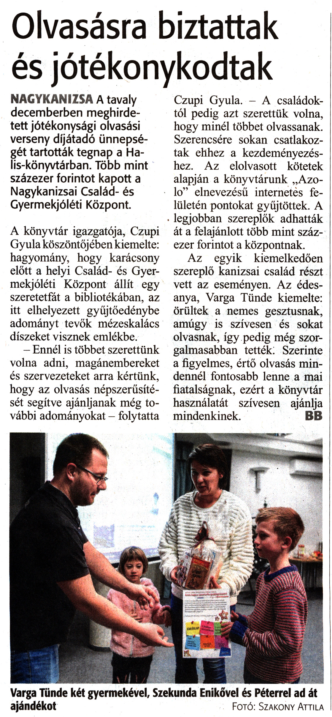 Nyilvános 1483 | 2583 | Zalai Hírlap 2020. január 7. 5. szám 4. oldal | Olvasásra biztattak és jótékonykodtak NAGYKANIZSA A tavaly decemberben meghirdetett jótékonysági olvasási verseny díjátadó ünnepségét tartották tegnap a Halis-könyvtárban. Több mint százezer forintot kapott a Nagykanizsai Család- és Gyermekjóléti Központ. A könyvtár igazgatója, Czupi Gyula köszöntőjében kiemelte: hagyomány, hogy karácsony előtt a helyi Család- és Gyermekjóléti Központ állít egy szeretetfát a bibliotékában, az itt elhelyezett gyűjtőedénybe adományt tevők mézeskalács díszeket visznek emlékbe. - Ennél is többet szerettünk volna adni, magánembereket és szervezeteket arra kértünk, hogy az olvasás népszerűsítését segítve ajánljanak még további adományokat - folytatta Czupi Gyula. - A családoktól pedig azt szerettük volna, hogy minél többet olvassanak. Szerencsére sokan csatlakoztak ehhez a kezdeményezéshez. Az elolvasott kötetek alapján a könyvtárunk „Azolo" elnevezésű internetes felületén pontokat gyűjtöttek. A legjobban szereplők adhatták át a felajánlott több mint százezer forintot a központnak. Az egyik kiemelkedően szereplő kanizsai család részt vett az eseményen. Az édesanya, Varga Tünde kiemelte: örültek a nemes gesztusnak, amúgy is szívesen és sokat olvasnak, így pedig még szorgalmasabban tették: Szerinte a figyelmes, értő olvasás mindennél fontosabb lenne a mai fiatalságnak, ezért a könyvtár használatát szívesen ajánlja mindenkinek. BB Varga Tünde két gyermekével, Szekunda Enikővel és Péterrel ad át ajándékot Fotó: Szakony Attila |
