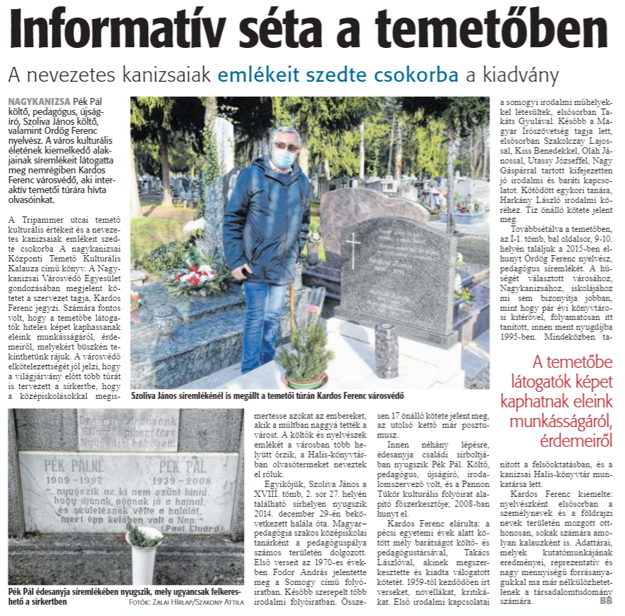 Nyilvános 1538 | 2030 | Informatív séta a temetőben | A nevezetes kanizsaiak emlékeit szedte csokorba a kiadvány NAGYKANIZSA Pék Pál költő, pedagógus, újságíró, Szoliva János költő, valamint Ördög Ferenc nyelvész. A város kulturális életének kiemelkedő alakjainak síremlékeit látogatta meg nemrégiben Kardos Ferenc városvédő, aki interaktív temetői túrára hívta olvasóinkat. A Tripammer utcai temető kulturális értékeit és a nevezetes kanizsaiak emlékeit szedte csokorba A nagykanizsai Központi Temető Kulturális Kalauza cimü könyv. A Nagykanizsai Városvédő Egyesület gondozásában megjelent kötetet a szervezet tagja, Kardos Ferenc jegyzi. Számára fontos volt, hogy a temetőbe látogatók hiteles képet kaphassanak eleink munkásságáról, érdemeiről, melyekért büszkén tekinthetünk rájuk. A városvédő elkötelezettségét jól jelzi, hogy a világjárvány előtt több túrát is tervezett a sírkertbe, hogy a középiskolásokkal megismertesse azokat az embereket, akik a múltban naggyá tették a várost. A költők és nyelvészek emlékét a városban több helyütt őrzik, a Halis-könyvtárban olvasótermeket neveztek el róluk. Egyikőjük, Szoliva János a XVIII. tömb, 2. sor 27. helyén található sírhelyen nyugszik 2014. december 29-én bekövetkezett halála óta. Magyarpedagógia szakos középiskolai tanárként a pedagóguspálya számos területén dolgozott. Első verseit az 1970-es években Fodor András jelentette meg a Somogy című folyóiratban. Később szerepelt több irodalmi folyóiratban. Összesen 17 önálló kötete jelent meg, az utolsó kettő már posztumusz. Innen néhány lépésre, édesanyja családi sírboltjában nyugszik Pék Pál. Költő, pedagógus, újságíró, irodalomszervező volt, és a Pannon Tükör kulturális folyóirat alapító főszerkesztője; 2008-ban hunyt el. Kardos Ferenc elárulta: a pécsi egyetemi évek alatt kötött mély barátságot költő- és pedagógustársával, Takács Lászlóval, akinek megszerkesztette és kiadta válogatott kötetét. 1959-tól kezdődően írt verseket, novellákat, kritikákat. Első irodalmi kapcsolatai a somogyi irodalmi műhelyekkel létesültek, elsősorban Takáts Gyulával. Később a Magyar Írószövetség tagja lett, elsősorban Szakolczay Lajossal, Kiss Benedekkel, Oláh Jánossal, Utassy Józseffel, Nagy Gáspárral tartott kifejezetten jó irodalmi és baráti kapcsolatot. Kötődött egykori tanára, Harkány László irodalmi köréhez. Tíz önálló kötete jelent meg. Továbbsétálva a temetőben, az I-1. tömb, bal oldalsor, 9-10. helyén találjuk a 2015-ben elhunyt Ördög Ferenc nyelvész, pedagógus síremlékét. A hűségét választott városához, Nagykanizsához, iskolájához mi sem bizonyítja jobban, mint hogy pár évi könyvtárosi kitérővel, folyamatosan itt tanított, innen ment nyugdíjba 1995-ben. Mindeközben tanított a felsőoktatásban, és a kanizsai Halis-könyvtár munkatársa lett. Kardos Ferenc kiemelte: nyelvészként elsősorban a személynevek és a földrajzi nevek területén mozgott otthonosan, sokak számára amolyan kalauzként is. Adattárai, melyek kutatómunkájának eredményei, reprezentatív és nagy mennyiségű forrásanyagukkal ma már nélkülözhetetlenek a társadalomtudomány számára. |