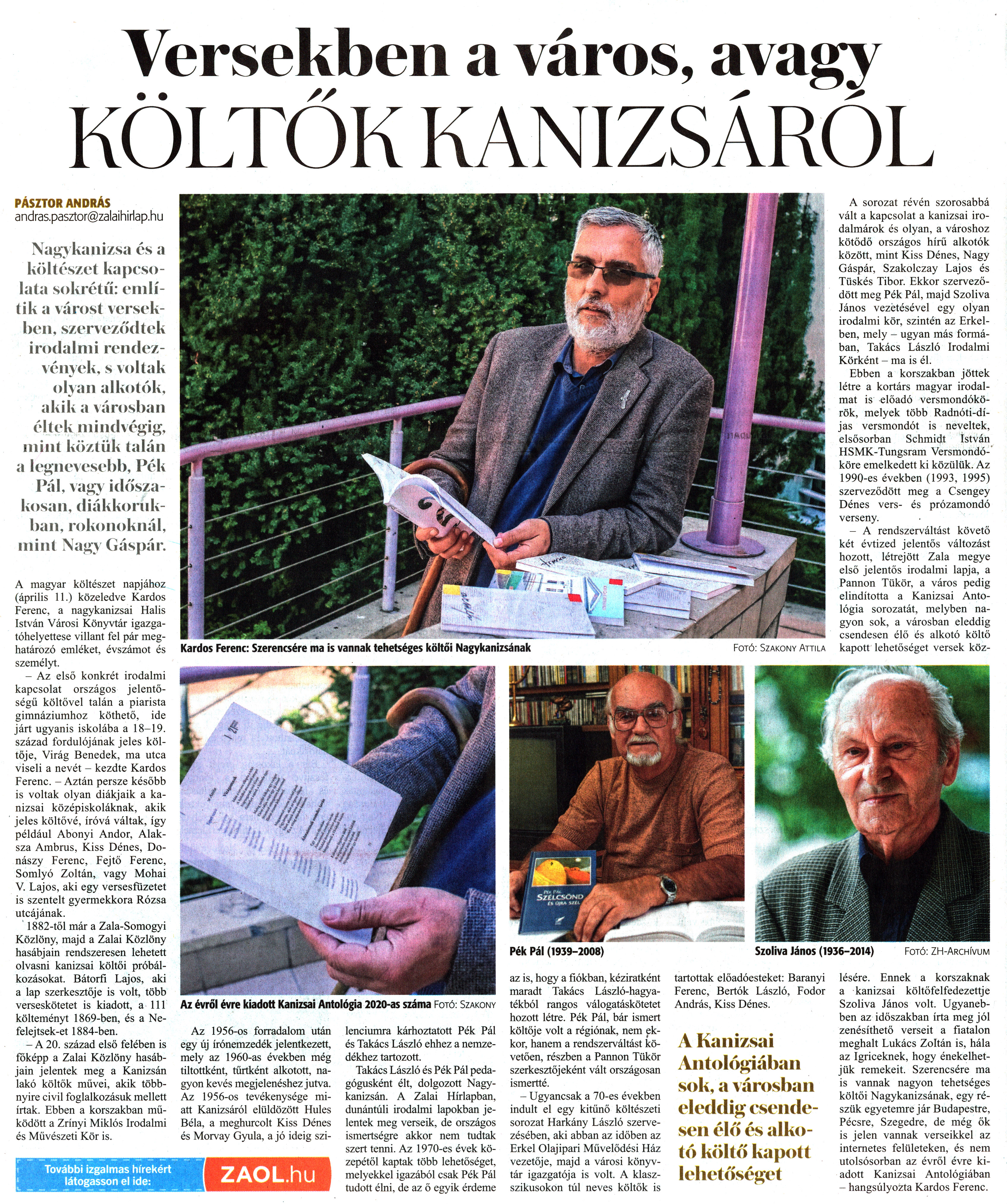 Nyilvános 1671 | 2134 | Zalai Hírlap 2021. április 10. 82. szám 9. oldal | Versekben a város, avagy KÖLTŐK KANIZSÁRÓL PÁSZTOR ANDRÁS andras.pasztor@zalaihirlap.hu Nagykanizsa és a költészet kapcsolata sokrétű: említik a várost versekben, szerveződtek irodalmi rendezvények, s voltak olyan alkotók, akik a városban éltek mindvégig, mint köztük talán a legnevesebb, Pék Pál, vagy időszakosan, diákkorukban, rokonoknál, mint Nagy Gáspár. A magyar költészet napjához (április 11.) közeledve Kardos Ferenc, a nagykanizsai Halis István Városi Könyvtár igazgatóhelyettese villant fel pár meghatározó emléket, évszámot és személyt. - Az első konkrét irodalmi kapcsolat országos jelentőségű költővel talán a piarista gimnáziumhoz köthető, ide járt ugyanis iskolába a 18-19. század fordulójának jeles költője, Virág Benedek, ma utca viseli a nevét - kezdte Kardos Ferenc. - Aztán persze később is voltak olyan diákjaik a kanizsai középiskoláknak, akik jeles költővé, íróvá váltak, így például Abonyi Andor, Alaksza Ambrus, Kiss Dénes, Donászy Ferenc, Fejtő Ferenc, Somlyó Zoltán, vagy Mohai V. Lajos, aki egy versesfüzetet is szentelt gyermekkora Rózsa utcájának. 1882-től már a Zala-Somogyi Közlöny, majd a Zalai Közlöny hasábjain rendszeresen lehetett olvasni kanizsai költői próbálkozásokat. Bátorfi Lajos, aki a lap szerkesztője is volt, több verseskötetet is kiadott, a 111 költeményt 1869-ben, és a Nefelejtsek-et 1884-ben. - A 20. század első felében is főképp a Zalai Közlöny hasábjain jelentek meg a Kanizsán lakó költők müvei, akik többnyire civil foglalkozásuk mellett írtak. Ebben a korszakban működött a Zrínyi Miklós Irodalmi és Művészeti Kör is. Az 1956-os forradalom után egy új írónemzedék jelentkezett, mely az 1960-as években még tiltottként, tűrtként alkotott, nagyon kevés megjelenéshez jutva. Az 1956-os tevékenysége miatt Kanizsáról elüldözött Hules Béla, a meghurcolt Kiss Dénes és Morvay Gyula, a jó ideig szilenciumra kárhoztatott Pék Pál és Takács László ehhez a nemzedékhez tartozott. Takács László és Pék Pál pedagógusként élt, dolgozott Nagykanizsán. A Zalai Hírlapban, dunántúli irodalmi lapokban jelentek meg verseik, de országos ismertségre akkor nem tudtak szert tenni. Az 1970-es évek közepétől kaptak több lehetőséget, melyekkel igazából csak Pék Pál tudott élni, de az ő egyik érdeme az is, hogy a fiókban, kéziratként maradt Takács László-hagyatékból rangos válogatáskötetet hozott létre. Pék Pál, bár ismert költője volt a régiónak, nem ekkor, hanem a rendszerváltást követően, részben a Pannon Tükör szerkesztőjeként vált országosan ismertté. - Ugyancsak a 70-es években indult el egy kitűnő költészeti sorozat Harkány László szervezésében, aki abban az időben az Erkel Olajipari Művelődési Ház vezetője, majd a városi könyvtár igazgatója is volt. A klasz-szikusokon túl neves költők is tartottak előadóesteket: Bárányi Ferenc, Bertók László, Fodor András, Kiss Dénes. A Kanizsai Antológiában sok, a városban eleddig'' csendesen élő és alkotó költő kapott lehetőséget A sorozat révén szorosabbá vált a kapcsolat a kanizsai irodalmárok és olyan, a városhoz kötődő országos hírű alkotók között, mint Kiss Dénes, Nagy Gáspár, Szakolczay Lajos és Tüskés Tibor. Ekkor szerveződött meg Pék Pál, majd Szoliva János vezetésével egy olyan irodalmi kör, szintén az Erkelben, mely - ugyan más formában, Takács László Irodalmi Körként - ma is él. Ebben a korszakban jöttek létre a kortárs magyar irodalmat is előadó versmondókörök, melyek több Radnóti-díjas versmondót is neveltek, elsősorban Schmidt István HSMK-Tungsram Versmondóköre emelkedett ki közülük. Az 1990-es években (1993, 1995) szerveződött meg a Csengey Dénes vers- és prózamondó verseny. - A rendszerváltást követő két évtized jelentős változást hozott, létrejött Zala megye első jelentős irodalmi lapja, a Pannon Tükör, a város pedig elindította a Kanizsai Antológia sorozatát, melyben nagyon sok, a városban eleddig csendesen élő és alkotó költő kapott lehetőséget versek közlésére. Ennek a korszaknak a kanizsai költőfelfedezettje Szoliva János volt. Ugyanebben az időszakban írta meg jól zenésíthető verseit a fiatalon meghalt Lukács Zoltán is, hála az Igriceknek, hogy énekelhetjük remekeit. Szerencsére ma is vannak nagyon tehetséges költői Nagykanizsának, egy részük egyetemre jár Budapestre, Pécsre, Szegedre, de még ők is jelen vannak verseikkel az internetes felületeken, és nem utolsósorban az évről évre kiadott Kanizsai Antológiában - hangsúlyozta Kardos Ferenc. Szoliva János (1936-2014) Fotó: ZH-Archívum Kardos Ferenc: Szerencsére ma is vannak tehetséges költői Nagykanizsának Fotó: Szakony Attila Az évről évre kiadott Kanizsai Antológia 2020-as száma Fotó: Szakony |