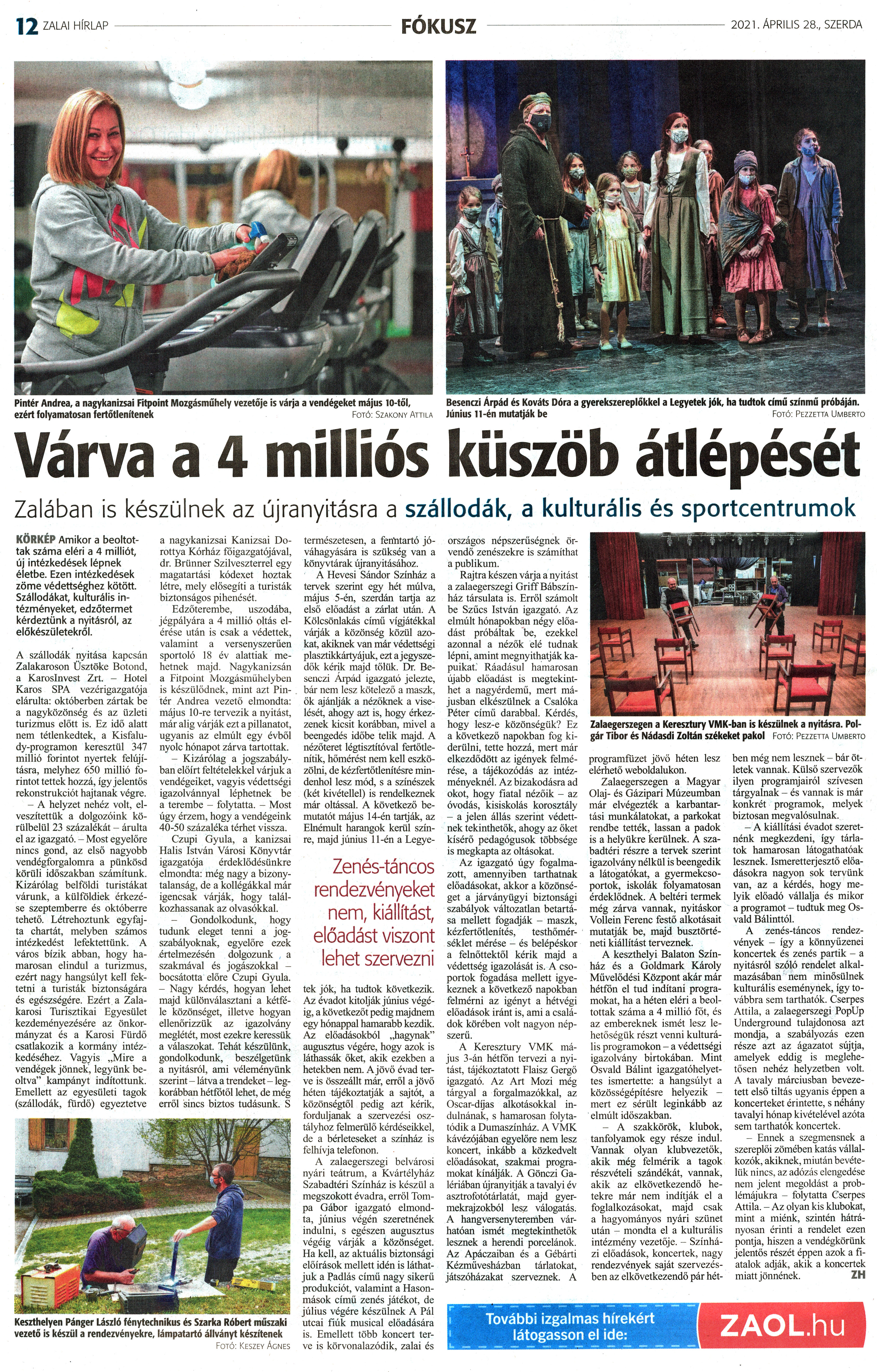 Nyilvános 1748 | 2438 | Zalai Hírlap 2021. április 28. 97. szám 12. oldal | Várva a 4 milliós küszöb átlépését Zalában is készülnek az újranyitásra a szállodák, a kulturális és sportcentrumok KÖRKÉP Amikor a beoltottak száma eléri a 4 milliót, új intézkedések lépnek életbe. Ezen intézkedések zöme védettséghez kötött. Szállodákat, kulturális intézményeket, edzőtermet kérdeztünk a nyitásról, az előkészületekről. A szállodák nyitása kapcsán Zalakaroson Üsztöke Botond, a Karoslnvest Zrt. - Hotel Karos SPA vezérigazgatója elárulta: októberben zártak be a nagyközönség és az üzleti turizmus előtt is. Ez idő alatt nem tétlenkedtek, a Kisfaludy-programon keresztül 347 millió forintot nyertek felújításra, melyhez 650 millió forintot tettek hozzá, így jelentős rekonstrukciót hajtanak végre. - A helyzet nehéz volt, elveszítettük a dolgozóink körülbelül 23 százalékát - árulta el az igazgató. - Most egyelőre nincs gond, az első nagyobb vendégforgalomra a pünkösd körüli időszakban számítunk. Kizárólag belföldi turistákat várunk, a külföldiek érkezése szeptemberre és októberre tehető. Létrehoztunk egyfajta chartát, melyben számos intézkedést lefektettünk. A város bízik abban, hogy hamarosan elindul a turizmus, ezért nagy hangsúlyt kell fektetni a turisták biztonságára és egészségére. Ezért a Zalakarosi Turisztikai Egyesület kezdeményezésére az önkormányzat és a Karosi Fürdő csatlakozik a kormány intézkedéséhez. Vagyis „Mire a vendégek jönnek, legyünk beoltva" kampányt indítottunk. Emellett az egyesületi tagok (szállodák, fürdő) egyeztetve a nagykanizsai Kanizsai Dorottya Kórház főigazgatójával, dr. Brünner Szilveszterrel egy magatartási kódexet hoztak létre, mely elősegíti a turisták biztonságos pihenését. Edzőterembe, uszodába, jégpályára a 4 millió oltás elérése után is csak a védettek, valamint a versenyszerűen sportoló 18 év alattiak mehetnek majd. Nagykanizsán a Fitpoint Mozgásmühelyben is készülődnek, mint azt Pintér Andrea vezető elmondta: május 10-re tervezik a nyitást, már alig várják ezt a pillanatot, ugyanis az elmúlt egy évből nyolc hónapot zárva tartottak. - Kizárólag a jogszabályban előírt feltételekkel várjuk a vendégeiket, vagyis védettségi igazolvánnyal léphetnek be a terembe - folytatta. - Most úgy érzem, hogy a vendégeink 40-50 százaléka térhet vissza. Czupi Gyula, a kanizsai Halis István Városi Könyvtár igazgatója érdeklődésünkre elmondta: még nagy a bizonytalanság, de a kollégákkal már igencsak várják, hogy találkozhassanak az olvasókkal. - Gondolkodunk, hogy tudunk eleget tenni a jogszabályoknak, egyelőre ezek értelmezésén dolgozunk a szakmával és jogászokkal - bocsátotta előre Czupi Gyula. - Nagy kérdés, hogyan lehet majd különválasztani a kétféle közönséget, illetve hogyan ellenőrizzük az igazolvány meglétét, most ezekre keressük a válaszokat. Tehát készülünk, gondolkodunk, beszélgetünk a nyitásról, ami véleményünk szerint - látva a trendeket - legkorábban hétfőtől lehet, de még erről sincs biztos tudásunk. S természetesen, a fenntartó jóváhagyására is szükség van a könyvtárak újranyitásához. A Hevesi Sándor Színház a tervek szerint egy hét múlva, május 5-én, szerdán tartja az első előadást a zárlat után. A Kölcsönlakás című vígjátékkal várják a közönség közül azokat, akiknek van már védettségi plasztikkártyájuk, ezt a jegyszedők kérik majd tőlük. Dr. Besenczi Árpád igazgató jelezte, bár nem lesz kötelező a maszk, ők ajánlják a nézőknek a viselését, ahogy azt is, hogy érkezzenek kicsit korábban, mivel a beengedés időbe telik majd. A nézőteret légtisztítóval fertőtlenítik, hőmérést nem kell eszközölni, de kézfertőtlenítésre mindenhol lesz mód, s a színészek (két kivétellel) is rendelkeznek már oltással. A következő bemutatót május 14-én tartják, az Elnémult harangok kerül színre, majd június 11-én a Legyetek jók, ha tudtok következik. Az évadot kitolják június végéig, a következőt pedig majdnem egy hónappal hamarabb kezdik. Az előadásokból „hagynak" augusztus végére, hogy azok is láthassák őket, akik ezekben a hetekben nem. A jövő évad terve is összeállt már, erről a jövő héten tájékoztatják a sajtót, a közönségtől pedig azt kérik, forduljanak a szervezési osztályhoz felmerülő kérdéseikkel, de a bérleteseket a színház is felhívja telefonon. A zalaegerszegi belvárosi nyári teátrum, a Kvártélyház Szabadtéri Színház is készül a megszokott évadra, erről Tompa Gábor igazgató elmondta, június végén szeretnének indulni, s egészen augusztus végéig várják a közönséget. Ha kell, az aktuális biztonsági előírások mellett idén is láthatjuk a Padlás című nagy sikerű produkciót, valamint a Hasonmások című zenés játékot, de július végére készülnek A Pál utcai fiúk musical előadására is. Emellett több koncert terve is körvonalazódik, zalai és országos népszerűségnek örvendő zenészekre is számíthat a publikum. Rajtra készen várja a nyitást a zalaegerszegi Griff Bábszínház társulata is. Erről számolt be Szűcs István igazgató. Az elmúlt hónapokban négy előadást próbáltak be, ezekkel azonnal a nézők élé tudnak lépni, amint megnyithatják kapuikat." Ráadásul hamarosan újabb előadást is megtekinthet a nagyérdemű, mert májusban elkészülnek a Csalóka Péter című darabbal. Kérdés, hogy lesz-e közönségük? Ez a következő napokban fog kiderülni, tette hozzá, mert már elkezdődött az igények felmérése, a tájékozódás az intézményeknél. Az bizakodásra ad okot, hogy fiatal nézőik - az óvodás, kisiskolás korosztály - a jelen állás szerint védettnek t