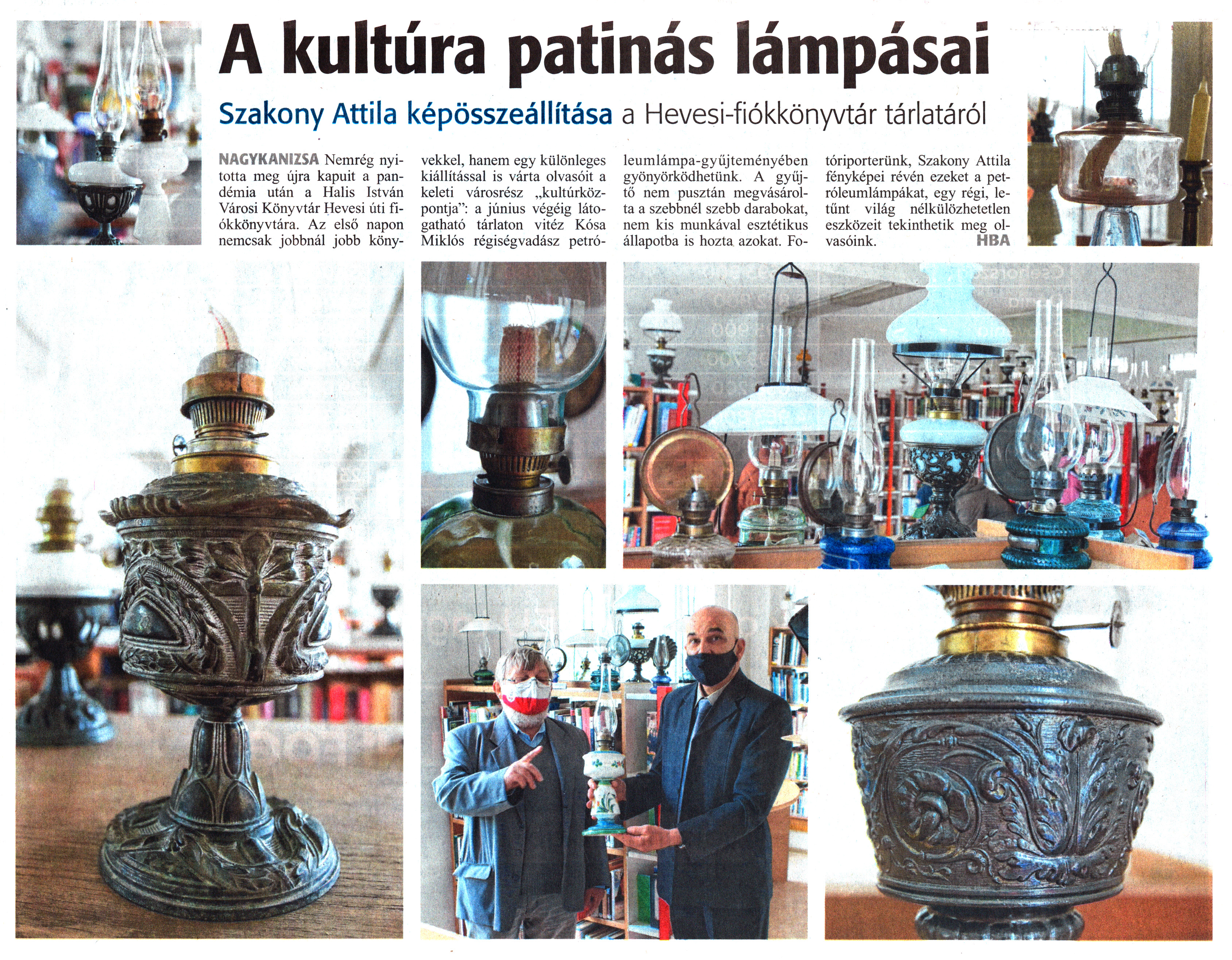 Nyilvános 1635 | 2363 | Zalai Hírlap 2021. május 26. 119. szám 5. oldal | A kultúra patinás lámpásai Szakony Attila képösszeállítása a Hevesi-fiókkönyvtár tárlatáról NAGYKANIZSA Nemrég nyitotta meg újra kapuit a pandémia után a Halis István Városi Könyvtár Hevesi úti fiókkönyvtára. Az első napon nemcsak jobbnál jobb könyvekkel, hanem egy különleges kiállítással is várta olvasóit a keleti városrész „kultúrközpontja": a június végéig látogatható tárlaton vitéz Kósa Miklós régiségvadász petróleumlámpa-gyűjteményében gyönyörködhetünk. A gyűjtő nem pusztán megvásárolta a szebbnél szebb darabokat, nem kis munkával esztétikus állapotba is hozta azokat. Fotóriporterünk, Szakony Attila fényképei révén ezeket a petróleumlámpákat, egy régi, letűnt világ nélkülözhetetlen eszközeit tekinthetik meg olvasóink. HBA |