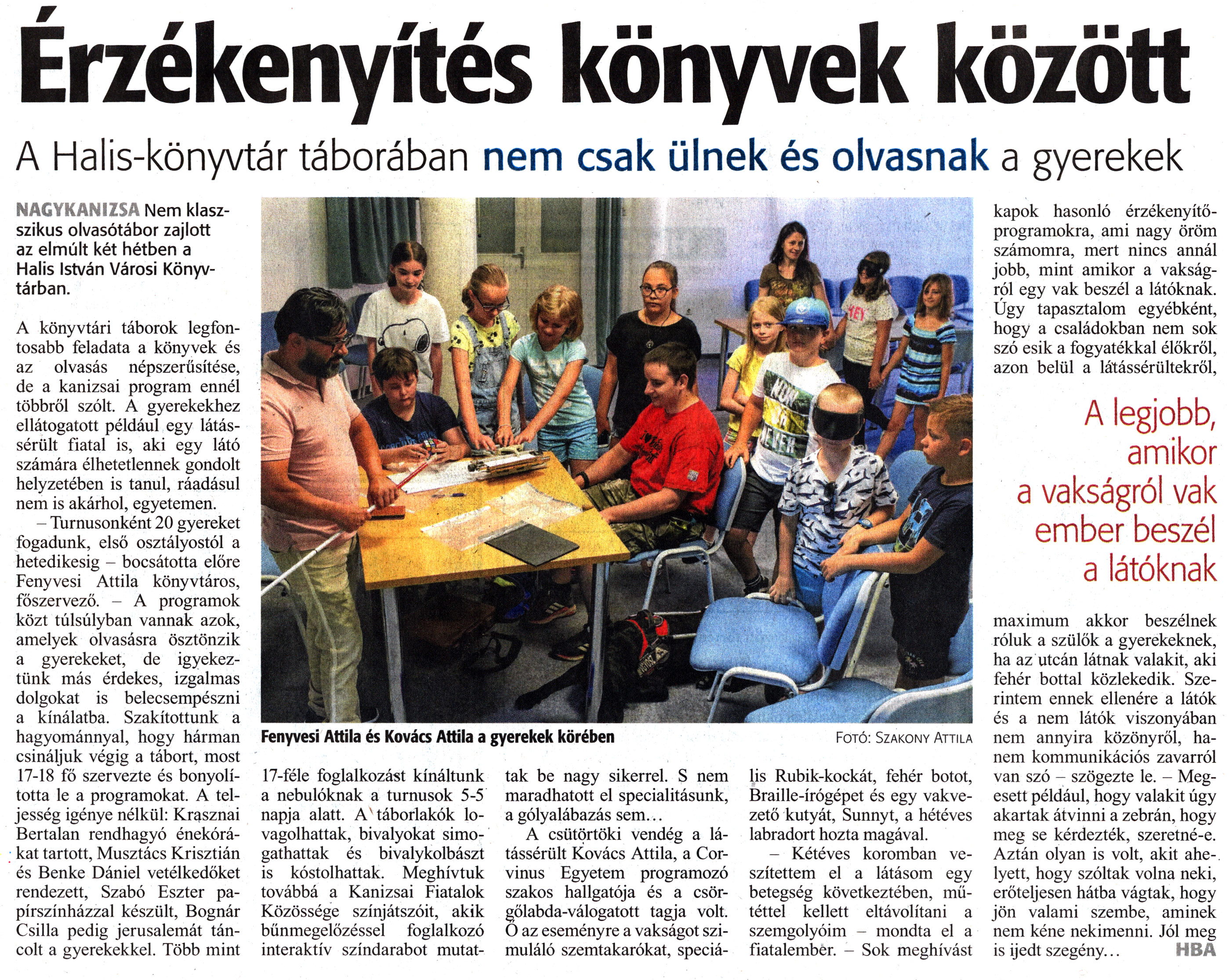 Nyilvános 1667 | 2090 | Zalai Hírlap 2021. július 3. 152. szám 3. oldal | Érzékenyítés könyvek között A Halis-könyvtár táborában nem csak ülnek és olvasnak a gyerekek NAGYKANIZSA Nem klasszikus olvasótábor zajlott az elmúlt két hétben a Halis István Városi Könyvtárban. A könyvtári táborok legfontosabb feladata a könyvek és az olvasás népszerűsítése, de a kanizsai program ennél többről szólt. A gyerekekhez ellátogatott például egy látássérült fiatal is, aki egy látó számára élhetetlennek gondolt helyzetében is tanul, ráadásul nem is akárhol, egyetemen. - Turnusonként 20 gyereket fogadunk, első osztályostól a hetedikesig - bocsátotta előre Fenyvesi Attila könyvtáros, főszervező. - A programok közt túlsúlyban vannak azok, amelyek olvasásra ösztönzik a gyerekeket, de igyekeztünk más érdekes, izgalmas dolgokat is belecsempészni a kínálatba. Szakítottunk a hagyománnyal, hogy hárman csináljuk végig a tábort, most 17-18 fő szervezte és bonyolította le a programokat. A teljesség igénye nélkül: Krasznai Bertalan rendhagyó énekórákat tartott, Musztács Krisztián és Benke Dániel vetélkedőket rendezett, Szabó Eszter papírszínházzal készült, Bognár Csilla pedig jerusalemát táncolt a gyerekekkel. Több mint 17-féle foglalkozást kínáltunk a nebulóknak a turnusok 5-5 napja alatt. A táborlakók lovagolhattak, bivalyokat simogathattak és bivalykolbászt is kóstolhattak. Meghívtuk továbbá a Kanizsai Fiatalok Közössége színjátszóit, akik bűnmegelőzéssel foglalkozó interaktív színdarabot mutattak be nagy sikerrel. S nem maradhatott el specialitásunk, a gólyalábazás sem... A csütörtöki vendég a látássérült Kovács Attila, a Corvinus Egyetem programozó szakos hallgatója és a csörgőlabda-válogatott tagja volt. Ő az eseményre a vakságot szimuláló szemtakarókat, speciális Rubik-kockát, fehér botot, Braille-írógépet és egy vakvezető kutyát, Sunnyt, a hétéves labradort hozta magával. - Kétéves koromban veszítettem el a látásom egy betegség következtében, műtéttel kellett eltávolítani a szemgolyóim - mondta el a fiatalember. - Sok meghívást kapok hasonló érzékenyítő-programokra, ami nagy öröm számomra, mert nincs annál jobb, mint amikor a vakságról egy vak beszél a látóknak. Úgy tapasztalom egyébként, hogy a családokban nem sok szó esik a fogyatékkal élőkről, azon belül a látássérültekről, maximum akkor beszélnek róluk a szülök a gyerekeknek, ha az utcán látnak valakit, aki fehér bottal közlekedik. Szerintem ennek ellenére a látók és a nem látók viszonyában nem annyira közönyről, hanem kommunikációs zavarról van szó - szögezte le. - Megesett például, hogy valakit úgy akartak átvinni a zebrán, hogy meg se kérdezték, szeretné-e. Aztán olyan is volt, akit ahelyett, hogy szóltak volna neki, erőteljesen hátba vágtak, hogy jön valami szembe, aminek nem kéne nekimenni. Jól meg is ijedt szegény... HBA Fenyvesi Attila és Kovács Attila a gyerekek körében Fotó: Szakony Attila |