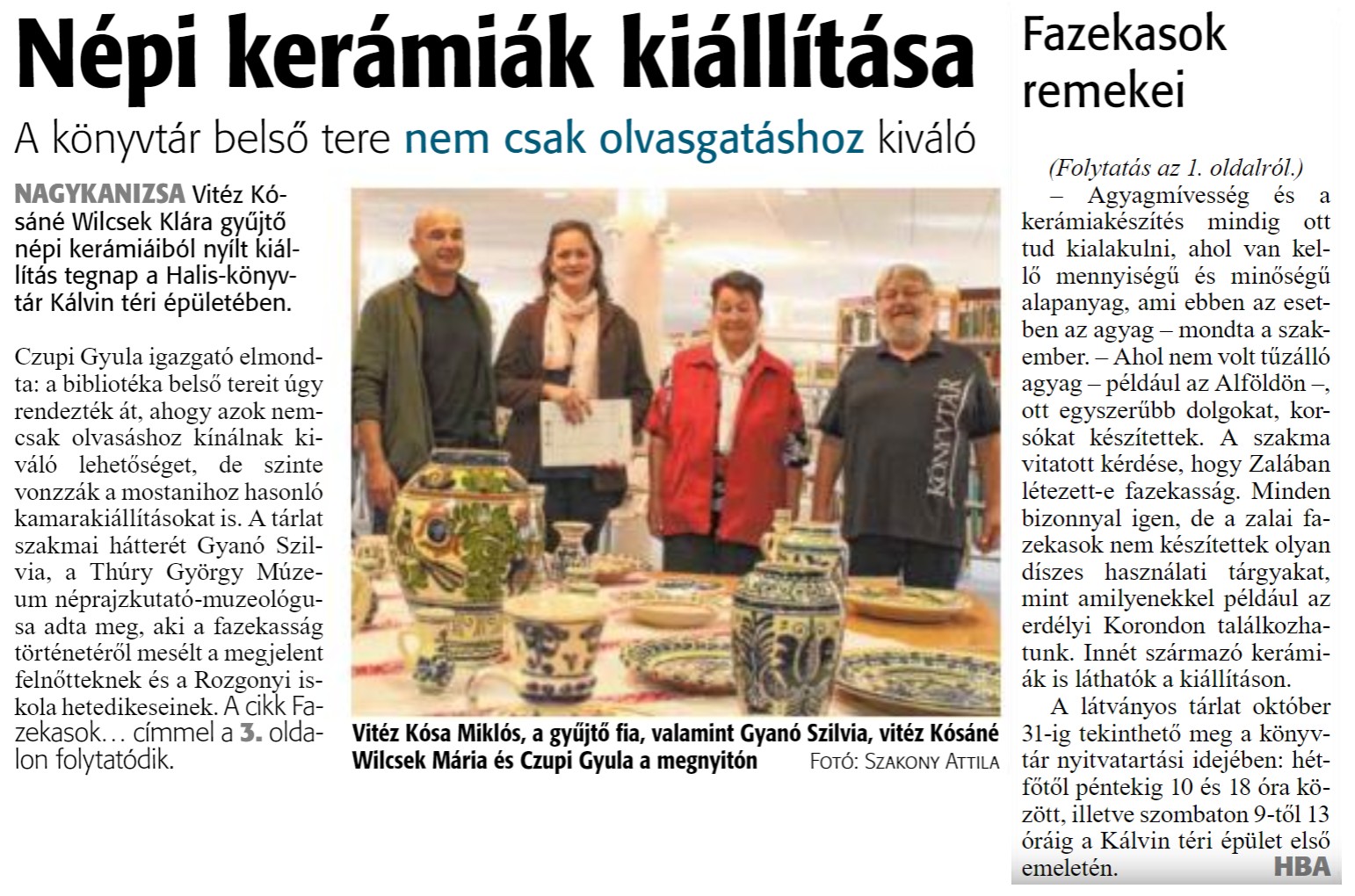 Nyilvános 1596 | 1890 | Népi kerámiák kiállítása | A könyvtár belső tere nem csak olvasgatáshoz kiváló NAGYKANIZSA Vitéz Kósáné Wilcsek Klára gyűjtő népi kerámiáiból nyílt kiállítás tegnap a Halis-könyvtár Kálvin téri épületében. Czupi Gyula igazgató elmondta: a bibliotéka belső tereit úgy rendezték át, ahogy azok nemcsak olvasáshoz kínálnak kiváló lehetőséget, de szinte vonzzák a mostanihoz hasonló kamarakiállításokat is. A tárlat szakmai hátterét Gyanó Szilvia, a Thúry György Múzeum néprajzkutató -muzeológusa adta meg, aki a fazekasság történetérő mesélt a megjelent felnőtteknek és a Rozgonyi iskola hetedikeseinek. A cikk Fazekasok. .. címmel a 3. oldalon folytatódik. Vitéz Kosa Miklós, a gyűjtő fia, valamint Gyanó Szilvia, vitéz Kósáné Wilcsek Mária és Czupi Gyula a megnyitón FOTÓ: SZAKONY ATTILA Fazekasok remekei (Folytatás az 1. oldalról.) - Agyagmíves ség és a kerámiakészítés mindig ott tud kialakulni, ahol van kellő mennyiségű és minőségű alapanyag, ami ebben az esetben az agyag - mondta a szakember. - Ahol nem volt tűzálló agyag - például az Alföldön ott egyszerűbb dolgokat, korsókat készítettek. A szakma vitatott kérdése, hogy Zalában létezett-e fazekasság. Minden bizonnyal igen, de a zalai fazekasok nem készítettek olyan díszes használati tárgyakat, mint amilyenekkel például az erdélyi Korondon találkozhatunk. Innét származó kerámiák is láthatók a kiállításon. A látványos tárlat október 31-ig tekinthető meg a könyvtár nyitvatartási idejében: hétfőtől péntekig 10 és 18 óra között, illetve szombaton 9-től 13 óráig a Kálvin téri épület első emeletén. HBA |