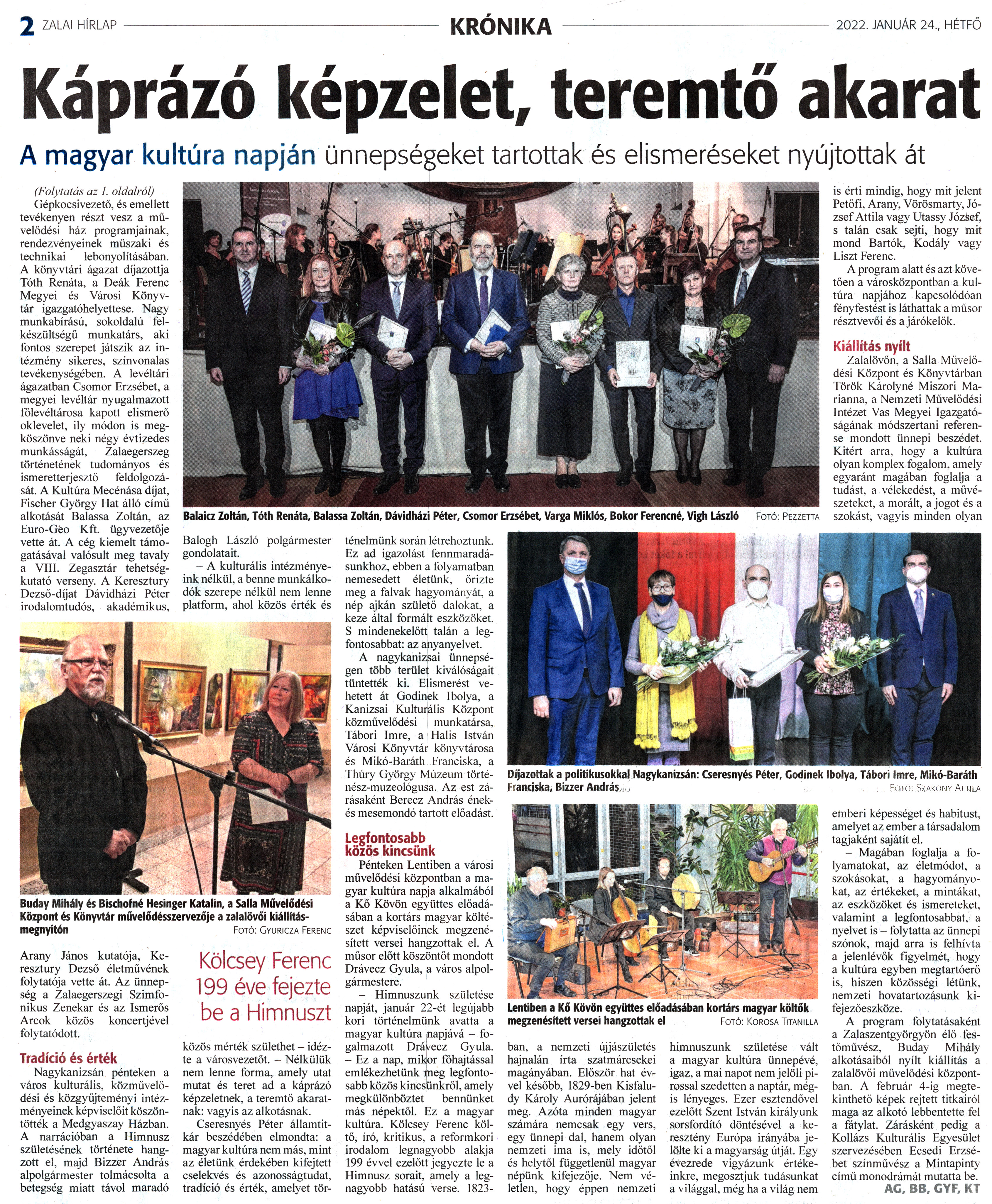 Nyilvános 1557 | 2476 | Zalai Hírlap 2022. január 24. 19. szám 2. oldal | Káprázó képzelet, teremtő akarat A magyar kultúra napján ünnepségeket tartottak és elismeréseket nyújtottak át (Folytatás az 1. oldalról) Gépkocsivezető, és emellett tevékenyen részt vesz a művelődési ház programjainak, rendezvényeinek műszaki és technikai lebonyolításában. A könyvtári ágazat díjazottja Tóth Renáta, a Deák Ferenc Megyei és Városi Könyvtár igazgatóhelyettese. Nagy munkabírású, sokoldalú felkészültségű munkatárs, aki fontos szerepet játszik az intézmény sikeres, színvonalas tevékenységében. A levéltári ágazatban Csomor Erzsébet, a megyei levéltár nyugalmazott főlevéltárosa kapott elismerő oklevelet, ily módon is megköszönve neki négy évtizedes munkásságát, Zalaegerszeg történetének tudományos és ismeretterjesztő feldolgozását. A Kultúra Mecénása díjat, Fischer György Hat álló című alkotását Balassa Zoltán, az Euro-Géo Kft. ügyvezetője vette át. A cég kiemelt támogatásával valósult meg tavaly a VIII. Zegasztár tehetségkutató verseny. A Keresztury Dezső-díjat Dávidházi Péter irodalomtudós, akadémikus. Arany János kutatója, Keresztury Dezső életművének folytatója vette át. Az ünnepség a Zalaegerszegi Szimfonikus Zenekar és az Ismerős Arcok közös koncertjével folytatódott. Tradíció és érték Nagykanizsán pénteken a város kulturális, közművelődési és közgyűjteményi intézményeinek képviselőit köszöntötték a Medgyaszay Házban. A narrációban a Himnusz születésének története hangzott el, majd Bizzer András alpolgármester tolmácsolta a betegség miatt távol maradó Balogh László polgármester gondolatait. - A kulturális intézményeink nélkül, a benne munkálkodók szerepe nélkül nem lenne platform, ahol közös érték és közös mérték születhet - idézte a városvezetőt. - Nélkülük nem lenne forma, amely utat mutat és teret ad a káprázó képzeletnek, a teremtő akaratnak: vagyis az alkotásnak. Cseresnyés Péter államtitkár beszédében elmondta: a magyar kultúra nem más, mint az életünk érdekében kifejtett cselekvés és azonosságtudat, tradíció és érték, amelyet történelmünk során létrehoztunk. Ez ad igazolást fennmaradásunkhoz, ebben a folyamatban nemesedett életünk, őrizte meg a falvak hagyományát, a nép ajkán születő dalokat, a keze által formált eszközöket. S mindenekelőtt talán a legfontosabbat: az anyanyelvet. A nagykanizsai ünnepségen több terület kiválóságait tüntették ki. Elismerést vehetett át Gödinek Ibolya, a Kanizsai Kulturális Központ közművelődési munkatársa, Tábori Imre, a Halis István Városi Könyvtár könyvtárosa és Mikó-Baráth Franciska, a Thúry György Múzeum történész-muzeológusa. Az est zárásaként Berecz András ének-és mesemondó tartott előadást. Legfontosabb közös kincsünk Pénteken Lentiben a városi művelődési központban a magyar kultúra napja alkalmából a Kő Kövön együttes előadásában a kortárs magyar költészet képviselőinek megzenésített versei hangzottak el. A műsor előtt köszöntőt mondott Drávecz Gyula, a város alpolgármestere. - Himnuszunk születése napját, január 22-ét legújabb kori történelmünk avatta a magyar kultúra napjává - fogalmazott Drávecz Gyula. - Ez a nap, mikor főhajtással emlékezhetünk meg legfontosabb közös kincsünkről, amely megkülönböztet bennünket más népektől. Ez a magyar kultúra. Kölcsey Ferenc költő, író, kritikus, a reformkori irodalom legnagyobb alakja 199 évvel ezelőtt jegyezte le a Himnusz sorait, amely a legnagyobb hatású verse. 1823-ban, a nemzeti újjászületés hajnalán írta szatmárcsekei magányában. Először hat évvel később, 1829-ben Kisfaludy Károly Aurórájában jelent meg. Azóta minden magyar számára nemcsak egy vers, egy ünnepi dal, hanem olyan nemzeti ima is, mely időtől és helytől függetlenül magyar népünk kifejezője. Nem véletlen, hogy éppen nemzeti himnuszunk születése vált a magyar kultúra ünnepévé, igaz, a mai napot nem jelöli pirossal szedetten a naptár, mégis lényeges. Ezer esztendővel ezelőtt Szent István királyunk sorsfordító döntésével a keresztény Európa irányába jelölte ki a magyarság útját. Egy évezrede vigyázunk értékeinkre, megosztjuk tudásunkat a világgal, még ha a világ nem is érti mindig, hogy mit jelent Petőfi, Arany, Vörösmarty, József Attila vagy Utassy József, s talán csak sejti, hogy mit mond Bartók, Kodály vagy Liszt Ferenc. A program alatt és azt követően a városközpontban a kultúra napjához kapcsolódóan fényfestést is láthattak a műsor résztvevői és a járókelők. Kiállítás nyílt Zalalövőn, a Salla Művelődési Központ és Könyvtárban Török Károly né Mi szőri Marianna, a Nemzeti Művelődési Intézet Vas Megyei Igazgatóságának módszertani referense mondott ünnepi beszédet. Kitért arra, hogy a kultúra olyan komplex fogalom, amely egyaránt magában foglalja a tudást, a vélekedést, a művészeteket, a morált, a jogot és a szokást, vagyis minden olyan emberi képességet és habitust, amelyet az ember a társadalom tagjaként sajátít el. - Magában foglalja a folyamatokat, az életmódot, a szokásokat, a hagyományokat, az értékeket, a mintákat, az eszközöket és ismereteket, valamint a legfontosabbat, a nyelvet is - folytatta az ünnepi szónok, majd arra is felhívta a jelenlévők figyelmét, hogy a kultúra egyben megtartóerő is, hiszen közösségi létünk, nemzeti hovatartozásunk kifejezőeszköze. A program folytatásaként a Zalaszentgyörgyön élő festőművész, Buday Mihály alkotásaiból nyílt kiállítás a zalalövői művelődési központban. A február 4-ig megtekinthető képek rejtett titkairól maga az alkotó lebbentette fel a fáty