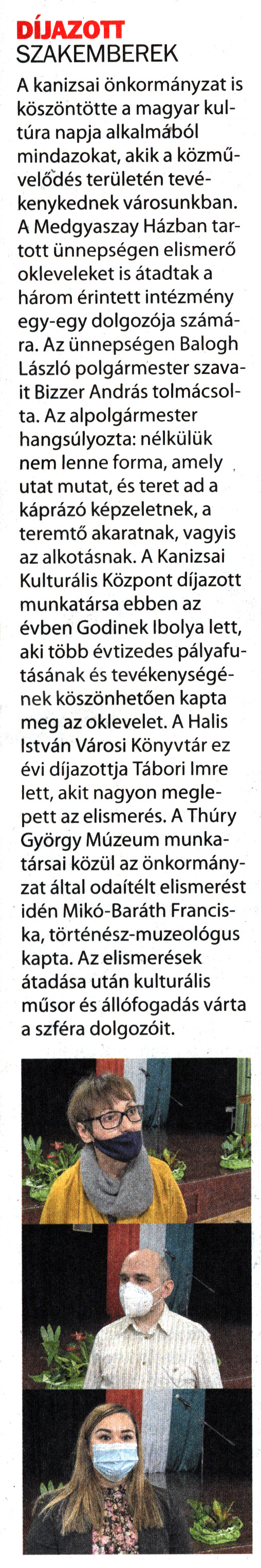 Nyilvános 1267 | 1623 | Kanizsa 2022. január 28. 2. szám 3. oldal | DÍJAZOTT SZAKEMBEREK A kanizsai önkormányzat is köszöntötte a magyar kultúra napja alkalmából mindazokat, akik a közművelődés területén tevékenykednek városunkban. A Medgyaszay Házban tartott ünnepségen elismerő okleveleket is átadtak a három érintett intézmény egy-egy dolgozója számára. Az ünnepségen Balogh László polgármester szavait Bizzer András tolmácsolta. Az alpolgármester hangsúlyozta: nélkülük nem lenne forma, amely utat mutat, és teret ad a káprázó képzeletnek, a teremtő akaratnak, vagyis az alkotásnak. A Kanizsai Kulturális Központ díjazott munkatársa ebben az évben Gödinek Ibolya lett, aki több évtizedes pályafutásának és tevékenységének köszönhetően kapta meg az oklevelet. A Halis István Városi Könyvtár ez évi díjazottja Tábori Imre lett, akit nagyon meglepett az elismerés. A Thúry György Múzeum munkatársai közül az önkormányzat által odaítélt elismerést idén Mikó-Baráth Franciska, történész-muzeológus kapta. Az elismerések átadása után kulturális műsor és állófogadás várta a szféra dolgozóit. |