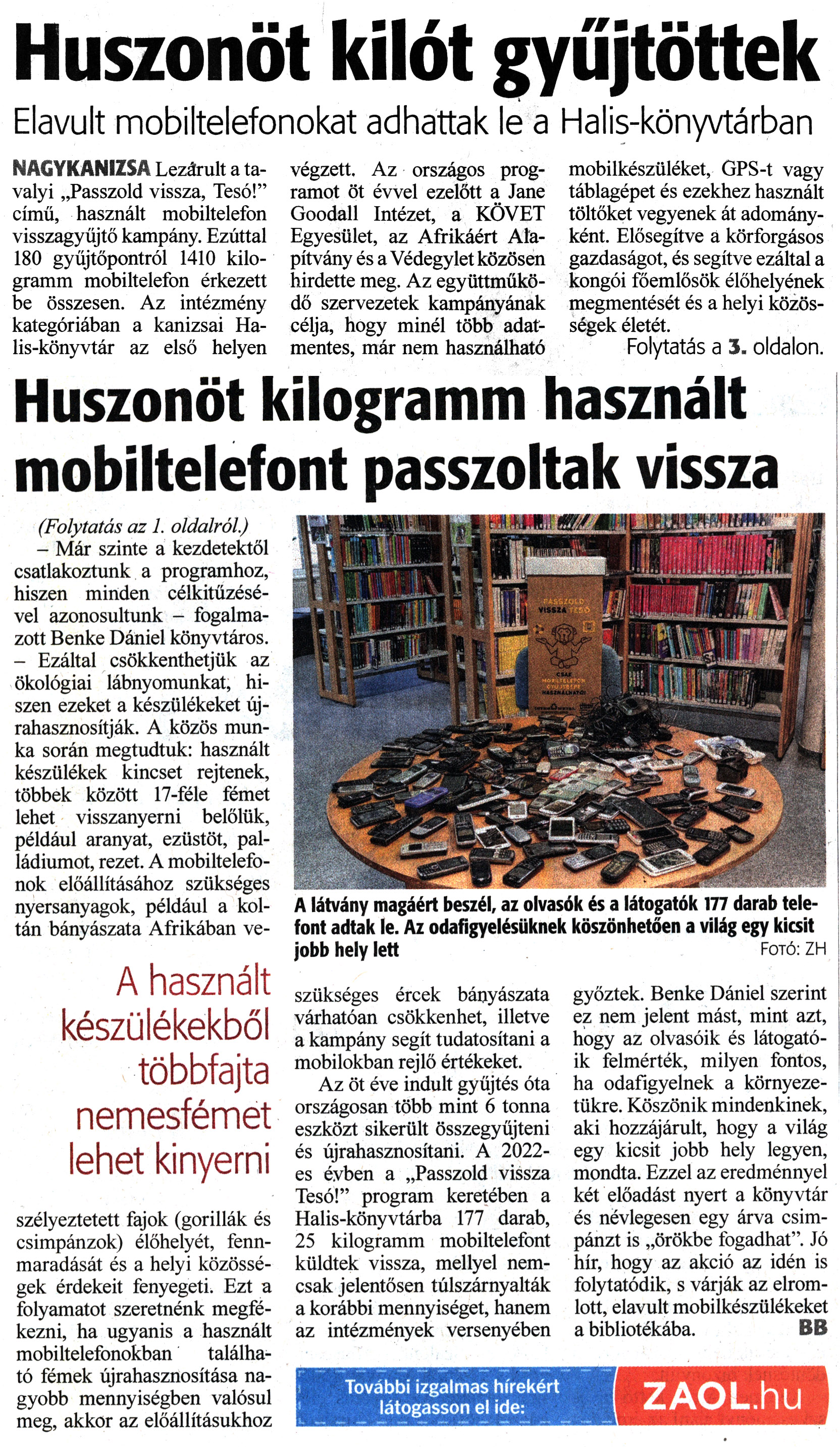 Nyilvános 959 | 1135 | Zalai Hírlap 2023. január 24. 20. szám, 1, 3. oldal | Huszonöt kilót gyűjtöttek Elavult mobiltelefonokat adhattak le a Halis-könyvtárban NAGYKANIZSA Lezárult a tavalyi „Passzold vissza, Tesó!" című, használt mobiltelefon visszagyűjtő kampány. Ezúttal 180 gyűjtőpontról 1410 kilogramm mobiltelefon érkezett be összesen. Az intézmény kategóriában a kanizsai Halis-könyvtár az első helyen végzett. Az országos programot öt évvel ezelőtt a Jane Goodall Intézet, a KÖVET Egyesület, az Afrikáért Alapítvány és a Védegylet közösen hirdette meg. Az együttműködő szervezetek kampányának célja, hogy minél több adatmentes, már nem használható mobilkészüléket, GPS-t vagy táblagépet és ezekhez használt töltőket vegyenek át adományként. Elősegítve a körforgásos gazdaságot, és segítve ezáltal a kongói főemlősök élőhelyének megmentését és a helyi közösségek életét. Folytatás a 3. oldalon. Huszonöt kilogramm használt mobiltelefont passzoltak vissza (Folytatás az 1. oldalról.) - Már szinte a kezdetektől csatlakoztunk a programhoz, hiszen minden célkitűzésével azonosultunk - fogalmazott Benke Dániel könyvtáros. - Ezáltal csökkenthetjük az ökológiai lábnyomunkat, hiszen ezeket a készülékeket újrahasznosítják. A közös munka során megtudtuk: használt készülékek kincset rejtenek, többek között 17-féle fémet lehet visszanyerni belőlük, például aranyat, ezüstöt, palládiumot, rezet. A mobiltelefonok előállításához szükséges nyersanyagok, például a kol-tán bányászata Afrikában veszélyeztetett fajok (gorillák és csimpánzok) élőhelyét, fennmaradását és a helyi közösségek érdekeit fenyegeti. Ezt a folyamatot szeretnénk megfékezni, ha ugyanis a használt mobiltelefonokban található fémek újrahasznosítása nagyobb mennyiségben valósul meg, akkor az előállításukhoz szükséges ércek bányászata várhatóan csökkenhet, illetve a kampány segít tudatosítani a mobilokban rejlő értékeket. Az öt éve indult gyűjtés óta országosan több mint 6 tonna eszközt sikerült összegyűjteni és újrahasznosítani. A 2022-es évben a „Passzold vissza Tesó!" program keretében a Halis-könyvtárba 177 darab, 25 kilogramm mobiltelefont küldtek vissza, mellyel nemcsak jelentősen túlszárnyalták a korábbi mennyiséget, hanem az intézmények versenyében győztek. Benke Dániel szerint ez nem jelent mást, mint azt, hogy az olvasóik és látogatóik felmérték, milyen fontos, ha odafigyelnek a környezetükre. Köszönik mindenkinek, aki hozzájárult, hogy a világ egy kicsit jobb hely legyen, mondta. Ezzel az eredménnyel két előadást nyert a könyvtár és névlegesen egy árva csimpánzt is „örökbe fogadhat". Jó hír, hogy az akció az idén is folytatódik, s várják az elromlott, elavult mobilkészülékeket a bibliotékába. BB A látvány magáért beszél, az olvasók és a látogatók 177 darab telefont adtak le. Az odafigyelésüknek köszönhetően a világ egy kicsit jobb hely lett Fotó: ZH További izgalmas hírekért látogasson el ide: ZAOL.hu |