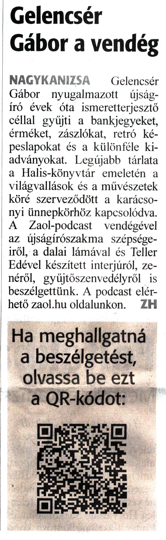 Nyilvános 1007 | 1249 | Zalai Hírlap 2023. december 13. 290. szám 1. oldal | Gelencsér Gábor a vendég NAGYKANIZSA Gelencsér Gábor nyugalmazott újságíró évek óta ismeretterjesztő céllal gyűjti a bankjegyeket, érméket, zászlókat, retró képeslapokat és a különféle kiadványokat. Legújabb tárlata a Halis-könyvtár emeletén a világvallások és a művészetek köré szerveződött a karácsonyi ünnepkörhöz kapcsolódva. A Zaol-podcast vendégével az újságírószakma szépségeiről, a dalai lámával és Teller Edével készített interjúról, zenéről, gyűjtőszenvedélyről is beszélgettünk. A podcast elérhető zaol.hu oldalunkon. ZH Ha meghallgatná a beszélgetést, olvassa be ezt a QR-kódot: |