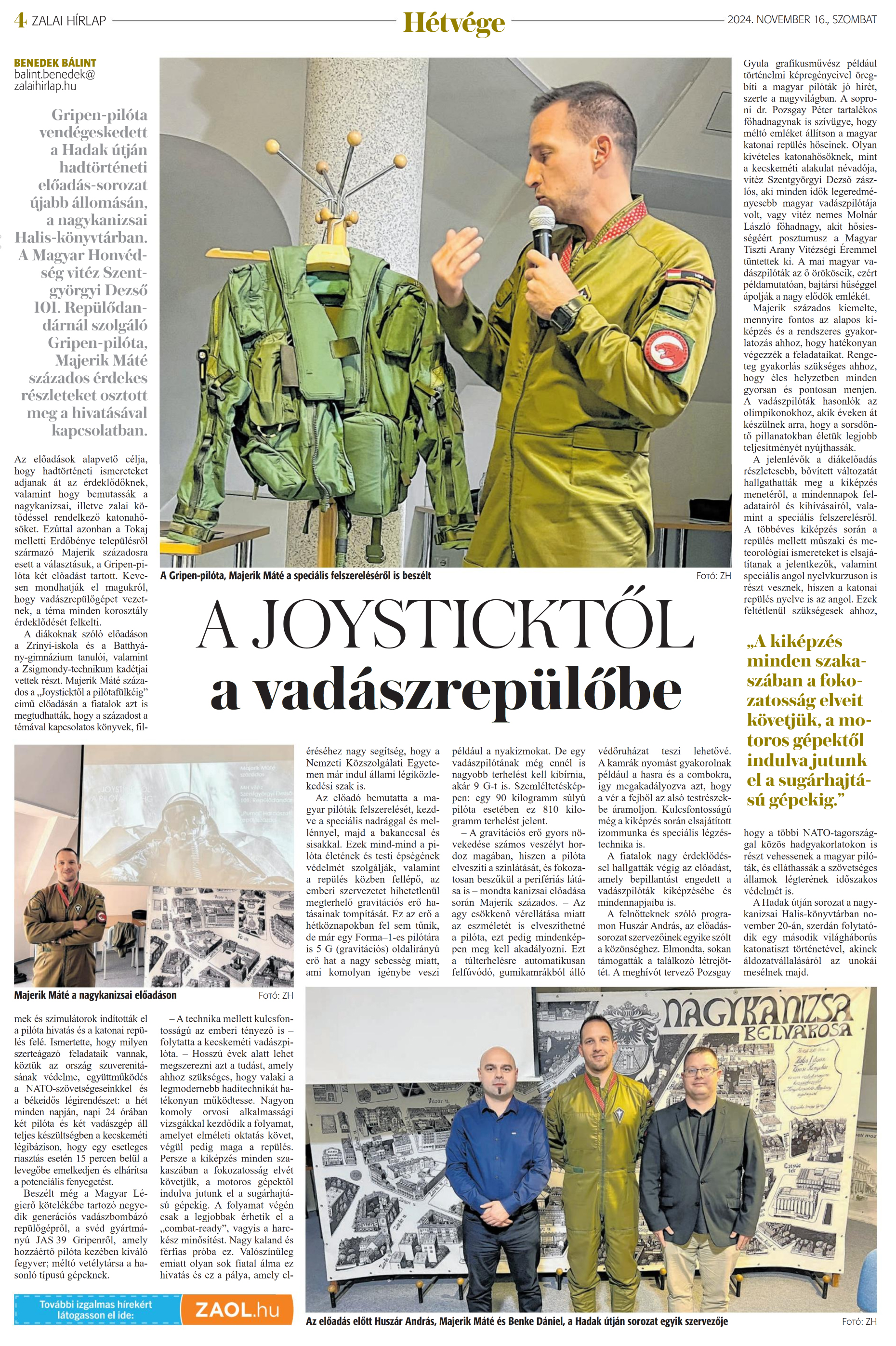 Nyilvános 858 | 955 | Zalai Hírlap 2024. november 16. 267. szám 4. oldal | A JOYSTICKTŐL a vadászrepülőbe BENEDEK BÁLINT balint.benedek@ zalaihirlap.hu Gripen-pilóta vendégeskedett a Hadak útján hadtörténeti előadás-sorozat ujabb állomásán, a nagykanizsai Halis-könyvtárban. A Magyar Honvédség vitéz Szent-györgyi Dezső 101. Repülődandárnál szolgáló Gripen-pilóta, Majerik Máté százados érdekes részleteket osztott meg a hivatásával kapcsolatban. Az előadások alapvető célja, hogy hadtörténeti ismereteket adjanak át az érdeklődőknek, valamint hogy bemutassák a nagykanizsai, illetve zalai kötődéssel rendelkező katonahősöket. Ezúttal azonban a Tokaj melletti Erdőbénye településről származó Majerik századosra esett a választásuk, a Gripen-pilóta két előadást tartott. Kevesen mondhatják el magukról, hogy vadászrepülőgépet vezetnek, a téma minden korosztály érdeklődését felkelti. A diákoknak szóló előadáson a Zrínyi-iskola és a Batthyány-gimnázium tanulói, valamint a Zsigmondy-technikum kadétjai vettek részt. Majerik Máté százados a „Joysticktől a pilótafülkéig" című előadásán a fiatalok azt is megtudhatták, hogy a századost a témával kapcsolatos könyvek, filmek és szimulátorok indították el a pilóta hivatás és a katonai repülés felé. Ismertette, hogy milyen szerteágazó feladataik vannak, köztük az ország szuverenitásának védelme, együttműködés a NATO-szövetségeseinkkel és a békeidős légirendészet: a hét minden napján, napi 24 órában két pilóta és két vadászgép áll teljes készültségben a kecskeméti légibázison, hogy egy esetleges riasztás esetén 15 percen belül a levegőbe emelkedjen és elhárítsa a potenciális fenyegetést. Beszélt még a Magyar Légierő kötelékébe tartozó negyedik generációs vadászbombázó repülőgépről, a svéd gyártmányú JAS 39 Gripenről, amely hozzáértő pilóta kezében kiváló fegyver; méltó vetélytársa a hasonló típusú gépeknek. -A technika mellett kulcsfontosságú az emberi tényező is - folytatta a kecskeméti vadászpilóta. - Hosszú évek alatt lehet megszerezni azt a tudást, amely ahhoz szükséges, hogy valaki a legmodernebb haditechnikát hatékonyan működtesse. Nagyon komoly orvosi alkalmassági vizsgákkal kezdődik a folyamat, amelyet elméleti oktatás követ, végül pedig maga a repülés. Persze a kiképzés minden szakaszában a fokozatosság elvét követjük, a motoros gépektől indulva jutunk el a sugárhajtású gépekig. A folyamat végén csak a legjobbak érhetik el a „combat-ready", vagyis a harckész minősítést. Nagy kaland és férfias próba ez. Valószínűleg emiatt olyan sok fiatal álma ez hivatás és ez a pálya, amely eléréséhez nagy segítség, hogy a Nemzeti Közszolgálati Egyetemen már indul állami légiközlekedési szak is. Az előadó bemutatta a magyar pilóták felszerelését, kezdve a speciális nadrággal és mellénnyel, majd a bakanccsal és sisakkal. Ezek mind-mind a pilóta életének és testi épségének védelmét szolgálják, valamint a repülés közben fellépő, az emberi szervezetet hihetetlenül megterhelő gravitációs erő hatásainak tompítását. Ez az erő a hétköznapokban fel sem tűnik, de már egy Forma-l-es pilótára is 5 G (gravitációs) oldalirányú erő hat a nagy sebesség miatt, ami komolyan igénybe veszi például a nyakizmokat. De egy vadászpilótának még ennél is nagyobb terhelést kell kibírnia, akár 9 G-t is. Szemléltetésképpen: egy 90 kilogramm súlyú pilóta esetében ez 810 kilogramm terhelést jelent. - A gravitációs erő gyors növekedése számos veszélyt hordoz magában, hiszen a pilóta elveszíti a színlátását, és fokozatosan beszűkül a perifériás látása is - mondta kanizsai előadása során Majerik százados. - Az agy csökkenő vérellátása miatt az eszméletét is elveszíthetné a pilóta, ezt pedig mindenképpen meg kell akadályozni. Ezt a túlterhelésre automatikusan felfúvódó, gumikamrákból álló védőruházat teszi lehetővé. A kamrák nyomást gyakorolnak például a hasra és a combokra, így megakadályozva azt, hogy a vér a fejből az alsó testrészekbe áramoljon. Kulcsfontosságú még a kiképzés során elsajátított izommunka és speciális légzéstechnika is. A fiatalok nagy érdeklődéssel hallgatták végig az előadást, amely bepillantást engedett a vadászpilóták kiképzésébe és mindennapjaiba is. A felnőtteknek szóló programon Huszár András, az előadássorozat szervezőinek egyike szólt a közönséghez. Elmondta, sokan támogatták a találkozó létrejöttét. A meghívót tervező Pozsgay Gyula grafikusművész például történelmi képregényeivel öregbíti a magyar pilóták jó hírét, szerte a nagyvilágban. A soproni dr. Pozsgay Péter tartalékos főhadnagynak is szívügye, hogy méltó emléket állítson a magyar katonai repülés hőseinek. Olyan kivételes katonahősöknek, mint a kecskeméti alakulat névadója, vitéz Szentgyörgyi Dezső zászlós, aki minden idők legeredményesebb magyar vadászpilótája volt, vagy vitéz nemes Molnár László főhadnagy, akit hősiességéért posztumusz a Magyar Tiszti Arany Vitézségi Éremmel tüntettek ki. A mai magyar vadászpilóták az ő örököseik, ezért példamutatóan, bajtársi hűséggel ápolják a nagy elődök emlékét. Majerik százados kiemelte, mennyire fontos az alapos kiképzés és a rendszeres gyakorlatozás ahhoz, hogy hatékonyan végezzék a feladataikat. Rengeteg gyakorlás szükséges ahhoz, hogy éles helyzetben minden gyorsan és pontosan menjen. A vadászpilóták hasonlók az olimpikonokhoz, akik éveken át készülnek arra, hogy a sorsdöntő pillanatokban életük legjobb teljesítményét nyújthassák. A jelenlévők a diákelőadás részletesebb, bővített változatát hallgathatták meg a 