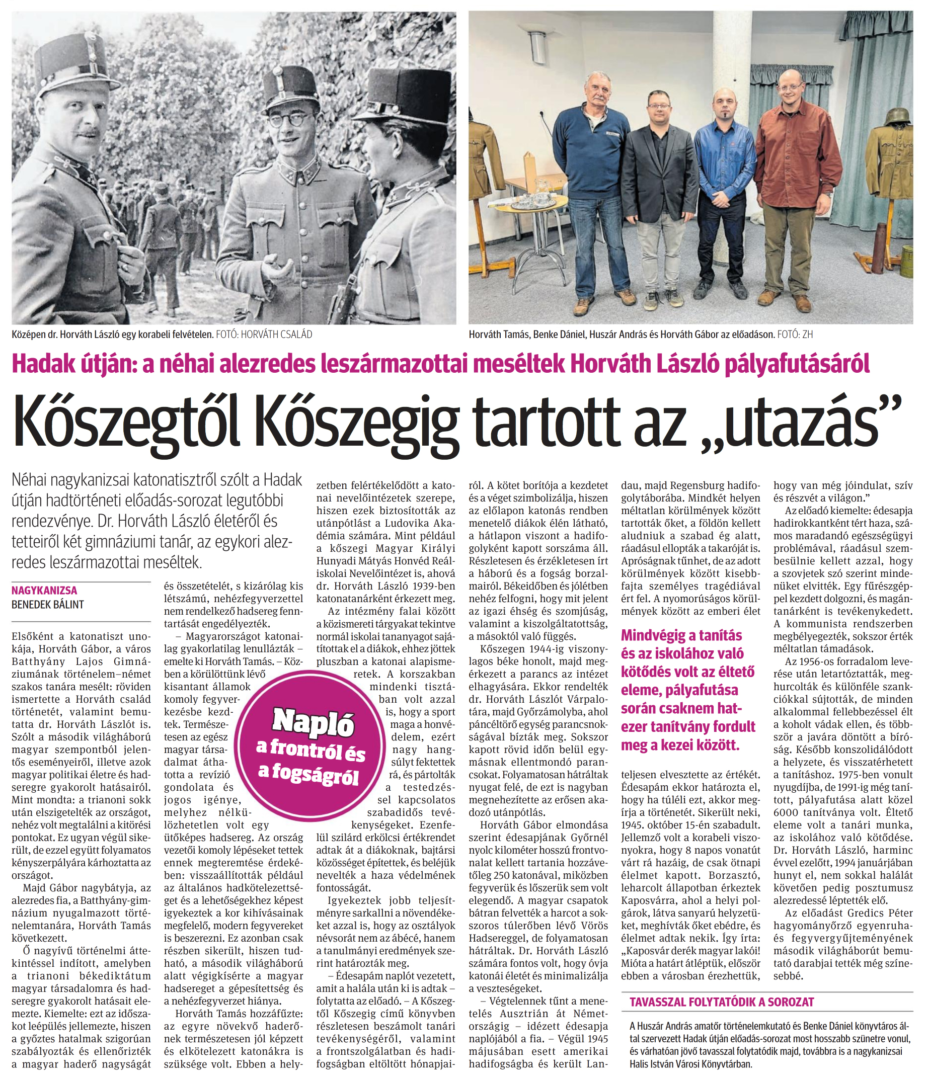 Nyilvános 906 | 1172 | Zalai Hírlap 2024. december 10. 287. szám 6. oldal | Hadak útján: a néhai alezredes leszármazottai meséltek Horváth László pályafutásáról Kőszegtől Kőszegig tartott az „utazás" Néhai nagykanizsai katonatisztről szólt a Hadak útján hadtörténeti előadás-sorozat legutóbbi rendezvénye. Dr. Horváth László életéről és tetteiről két gimnáziumi tanár, az egykori alezredes leszármazottai meséltek. NAGYKANIZSA BENEDEK BÁLINT Elsőként a katonatiszt unokája, Horváth Gábor, a város Batthyány Lajos Gimnáziumának történelem-német szakos tanára mesélt: röviden ismertette a Horváth család történetét, valamint bemutatta dr. Horváth Lászlót is. Szólt a második világháború magyar szempontból jelentős eseményeiről, illetve azok magyar politikai életre és hadseregre gyakorolt hatásairól. Mint mondta: a trianoni sokk után elszigetelték az országot, nehéz volt megtalálni a kitörési pontokat. Ez ugyan végül sikerült, de ezzel együtt folyamatos kényszerpályára kárhoztatta az országot. Majd Gábor nagybátyja, az alezredes fia, a Batthyány-gimnázium nyugalmazott történelemtanára, Horváth Tamás következett. Ő nagyívű történelmi áttekintéssel indított, amelyben a trianoni békediktátum magyar társadalomra és hadseregre gyakorolt hatásait elemezte. Kiemelte: ezt az időszakot leépülés jellemezte, hiszen a győztes hatalmak szigorúan szabályozták és ellenőrizték a magyar haderő nagyságát és összetételét, s kizárólag kis létszámú, nehézfegyverzettel nem rendelkező hadsereg fenntartását engedélyezték. - Magyarországot katonailag gyakorlatilag lenullázták - emelte ki Horváth Tamás. - Közben a körülöttünk lévő kisantant államok komoly fegyverkezésbe kezdtek. Természetesen az egész magyar társadalmat áthatotta a revízió gondolata és jogos igénye, melyhez nélkülözhetetlen volt egy ütőképes hadsereg. Az ország vezetői komoly lépéseket tettek ennek megteremtése érdekében: visszaállították például az általános hadkötelezettséget és a lehetőségekhez képest igyekeztek a kor kihívásainak megfelelő, modern fegyvereket is beszerezni. Ez azonban csak részben sikerült, hiszen tudható, a második világháború alatt végigkísérte a magyar hadsereget a gépesítettség és a nehézfegyverzet hiánya. Horváth Tamás hozzáfűzte: az egyre növekvő haderőnek természetesen jól képzett és elkötelezett katonákra is szüksége volt. Ebben a helyzetben felértékelődött a katonai nevelőintézetek szerepe, hiszen ezek biztosították az utánpótlást a Ludovika Akadémia számára. Mint például a kőszegi Magyar Királyi Hunyadi Mátyás Honvéd Reáliskolai Nevelőintézet is, ahová dr. Horváth László 1939-ben katonatanárként érkezett meg. Az intézmény falai között a közismereti tárgyakat tekintve normál iskolai tananyagot sajátítottak el a diákok, ehhez jöttek pluszban a katonai alapismeretek. A korszakban mindenki tisztában volt azzal is, hogy a sport maga a honvédelem, ezért nagy hangsúlyt fektettek rá, és pártolták a testedzéssel kapcsolatos szabadidős tevékenységeket. Ezenfelül szilárd erkölcsi értékrendet adtak át a diákoknak, bajtársi közösséget építettek, és beléjük nevelték a haza védelmének fontosságát. Igyekeztek jobb teljesítményre sarkallni a növendékeket azzal is, hogy az osztályok névsorát nem az ábécé, hanem a tanulmányi eredmények szerint határozták meg. - Édesapám naplót vezetett, amit a halála után ki is adtak - folytatta az előadó. - A Kőszegtől Kőszegig című könyvben részletesen beszámolt tanári tevékenységéről, valamint a frontszolgálatban és hadifogságban eltöltött hónapjairól. A kötet borítója a kezdetet és a véget szimbolizálja, hiszen az előlapon katonás rendben menetelő diákok élén látható, a hátlapon viszont a hadifogolyként kapott sorszáma áll. Részletesen és érzékletesen írt a háború és a fogság borzalmairól. Békeidőben és jólétben nehéz felfogni, hogy mit jelent az igazi éhség és szomjúság, valamint a kiszolgáltatottság, a másoktól való függés. Kőszegen 1944-ig viszonylagos béke honolt, majd megérkezett a parancs az intézet elhagyására. Ekkor rendelték dr. Horváth Lászlót Várpalotára, majd Győrzámolyba, ahol páncéltörő egység parancsnokságával bízták meg. Sokszor kapott rövid időn belül egymásnak ellentmondó parancsokat. Folyamatosan hátráltak nyugat felé, de ezt is nagyban megnehezítette az erősen akadozó utánpótlás. Horváth Gábor elmondása szerint édesapjának Győrnél nyolc kilométer hosszú frontvonalat kellett tartania hozzávetőleg 250 katonával, miközben fegyverük és lőszerük sem volt elegendő. A magyar csapatok bátran felvették a harcot a sokszoros túlerőben lévő Vörös Hadsereggel, de folyamatosan hátráltak. Dr. Horváth László számára fontos volt, hogy óvja katonái életét és minimalizálja a veszteségeket. - Végtelennek tűnt a menetelés Ausztrián át Németországig - idézett édesapja naplójából a fia. - Végül 1945 májusában esett amerikai hadifogságba és került Landau, majd Regensburg hadifogolytáborába. Mindkét helyen méltatlan körülmények között tartották őket, a földön kellett aludniuk a szabad ég alatt, ráadásul ellopták a takaróját is. Apróságnak tűnhet, de az adott körülmények között kisebbfajta személyes tragédiával ért fel. A nyomorúságos körülmények között az emberi élet teljesen elvesztette az értékét. Édesapám ekkor határozta el, hogy ha túléli ezt, akkor megírja a történetét. Sikerült neki, 1945. október 15-én szabadult. Jellemző volt a korabeli viszonyokra, hogy 8 napos vonatút várt rá hazáig, de csak ötnapi élelmet kapott. Borzasztó, leharcolt állapotban érkeztek Kaposv