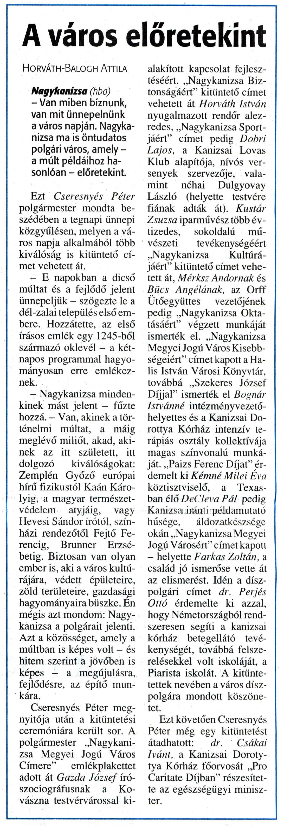 Nyilvános 1939 | 4381 | Zalai Hírlap 2011. május 14. 112. szám 4. oldal - A város előretekint | A cikk szövege: A város előretekint Horváth-Balogh Attila Nagykanizsa (hba) - Van miben bíznunk, van mit ünnepelnünk a város napján. Nagykanizsa ma is öntudatos polgári város, amely -a múlt példáihoz hasonlóan - előretekint. Ezt Cseresnyés Péter polgármester mondta beszédében a tegnapi ünnepi közgyűlésen, melyen a város napja alkalmából több kiválóság is kitüntető címet vehetett át. - E napokban a dicső múltat és a fejlődő jelent ünnepeljük - szögezte le a dél-zalai település első embere. Hozzátette, az első írásos emlék egy 1245-ből származó oklevél - a kétnapos programmal hagyományosan erre emlékeznek. - Nagykanizsa mindenkinek mást jelent - fűzte hozzá. - Van, akinek a történelmi múltat, a máig meglévő miliőt, akad, akinek az itt született, itt dolgozó kiválóságokat: Zemplén Győző európai hírű fizikustól Kaán Károlyig, a magyar természetvédelem atyjáig, vagy Hevesi Sándor írótól, színházi rendezőtől Fejtő Ferencig, Brunner Erzsébetig. Biztosan van olyan ember is, aki a város kultúrájára, védett épületeire, zöld területeire, gazdasági hagyományaira büszke. Én mégis azt mondom: Nagykanizsa a polgárait jelenti. Azt a közösséget, amely a múltban is képes volt - és hitem szerint a jövőben is képes - a megújulásra, fejlődésre, az építő munkára. Cseresnyés Péter megnyitója után a kitüntetési ceremóniára került sor. A polgármester „Nagykanizsa Megyei Jogú Város Címere" emlékplakettet adott át Gazda József író-szociográfusnak a Kovászna testvérvárossal ki- alakított kapcsolat fejlesztéséért. „Nagykanizsa Biztonságáért" kitüntető címet vehetett át Horváth István nyugalmazott rendőr alezredes, „Nagykanizsa Sportjáért" címet pedig Dobri Lajos, a Kanizsai Lovas Klub alapítója, nívós versenyek szervezője, valamint néhai Dulgyovay László (helyette testvére fiának adták át). Kustár Zsuzsa iparművész több évtizedes, sokoldalú művészeti tevékenységéért „Nagykanizsa Kultúrájáért" kitüntető címet vehetett át, Mérksz Andornak és Bücs Angélának, az Orff Ütőegyüttes vezetőjének pedig „Nagykanizsa Oktatásáért" végzett munkáját ismerték el. „Nagykanizsa Megyei Jogú Város Kisebbségeiért" címet kapott a Halis István Városi Könyvtár, továbbá „Szekeres József Díjjal" ismerték el Bognár Istvánné intézményvezető-helyettes és a Kanizsai Dorottya Kórház intenzív terápiás osztály kollektívája magas színvonalú munkáját. „Paizs Ferenc Díjat" érdemelt ki Kémné Milei Éva köztisztviselő, a Texasban élő DeCleva Pál pedig Kanizsa iránti példamutató hűsége, áldozatkészsége okán „Nagykanizsa Megyei Jogú Városért" címet kapott - helyette Farkas Zoltán, a család jó ismerőse vette át az elismerést. Idén a díszpolgári címet dr. Perjés Ottó érdemelte ki azzal, hogy Németországból rendszeresen segíti a kanizsai kórház betegellátó tevékenységét, továbbá felszerelésekkel volt iskoláját, a Piarista iskolát. A kitüntetettek nevében a város díszpolgára mondott köszönetet. Ezt követően Cseresnyés Péter még egy kitüntetést átadhatott: dr. Csákai Ivánt, a Kanizsai Dorottya Kórház főorvosát „Pro Caritate Díjban" részesítette az egészségügyi miniszter. |
