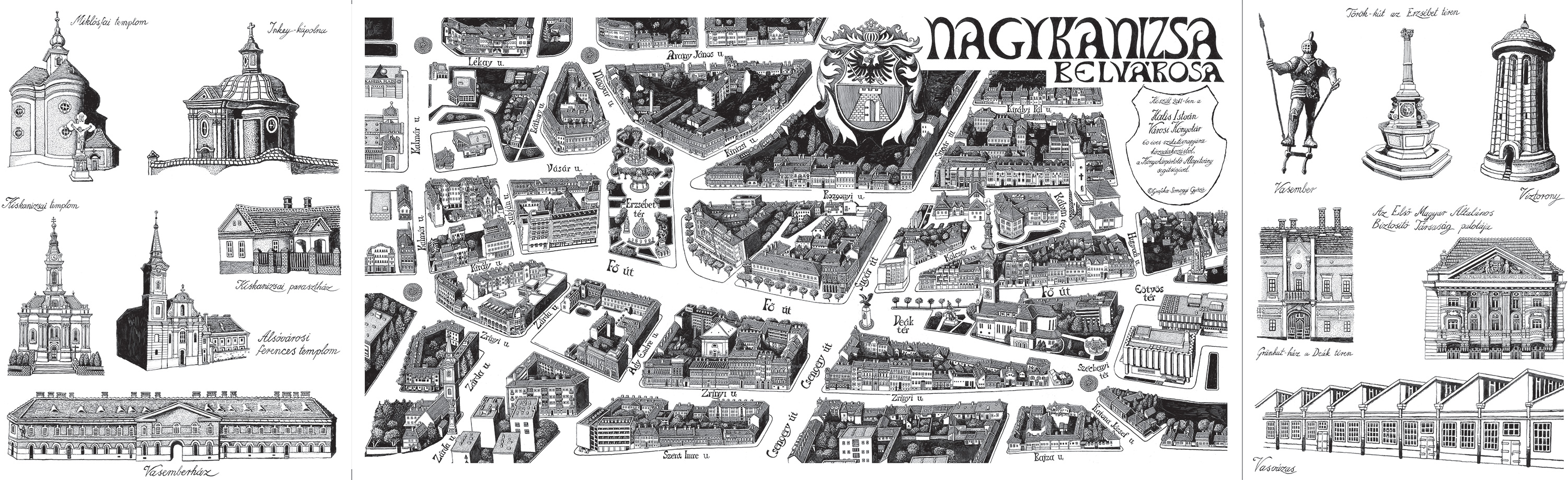 Nyilvános 3139 | 12179 | Nagykanizsa belvárosa madártávlati képe - Somogyi Győző alkotása - nagy méretben megtekinthető a könyvtárban, kis méretben meg is vásárolható a könyvtártól: | A 30x100 cm-es Nagykanizsa belvárosa madártávlati kép érvényes olvasói tagsággal rendelkezők számára 200 Ft-ba kerül, egyébként 300 Ft, fóliázott változatban 600 Ft (olvasóinknak 500 Ft). |
