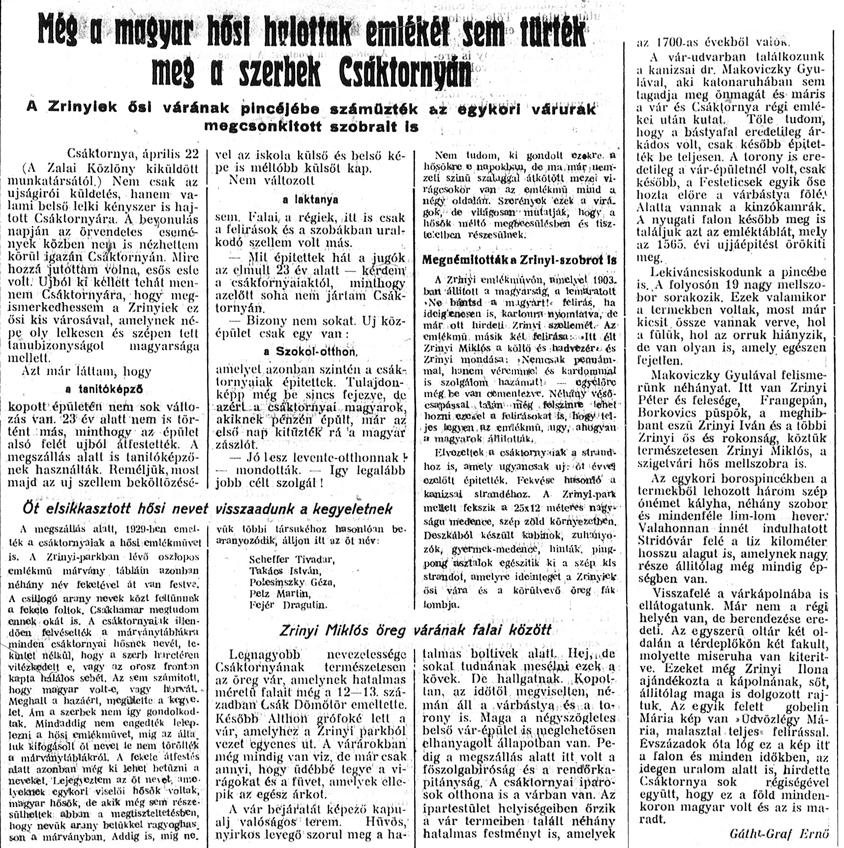 Nyilvános 1104 | 2272 | Zalai Közlöny 1941. április 22. 91. szám 1-2. oldal - Még a magyar hősi halottak... | Még a magyar hősi halottak emlékét sem tűrték meg a szerbek Csáktornyán A Zrínyiek ősi várának pincéjébe száműzték az egykori várurak megcsonkított szobrait is Csáktornya, április 22. (A Zalai Közlöny kiküldött munkatársától.) Nem csak az újságírói küldetés, hanem valami belső lelki kényszer is hajtott Csáktornyára. A bevonulás napján az örvendetes események közben nem is nézhettem körül igazán Csáktornyán. Mire hozzá jutottam volna, esős este volt. Újból ki kellett tehát mennem Csáktornyára, hogy megismerkedhessem a Zrínyiek ez ősi kis városával, amelynek népe oly lelkesen és szépen tett tanúbizonyságot magyarsága mellett. Azt már láttam, hogy a tanítóképző kopott épületén nem sok változás van. 23 év alatt nem is történt más, minthogy az épület alsó felét újból átfestették. A megszállás alatt is tanítóképzőnek használták. Reméljük, most majd az új szellem beköltözésével az iskola külső és belső képe is méltóbb külsői kap. Nem változott a laktanya sem. Falai a régiek, itt is csak a felírások és a szobákban uralkodó szellem volt más. – Mit építettek hát a jugók az elmúlt 23 év alatt – kérdem a csáktornyaiaktól, minthogy azelőtt soha nem jártam Csáktornyán. – Bizony nem sokat. Új középület csak egy van: a Szokol-otthon, amelyet azonban szintén a csáktornyaiak építettek. Tulajdonképp még be sincs fejezve, de azért a csáktornyai magyarok, akiknek pénzén épült, már az első nap kitűzték rá a magyar zászlót. – Jó lesz levente-otthonnak! – mondották. – Így legalább jobb célt szolgál! Öt elsikkasztott hősi nevet visszaadunk a kegyeletnek A megszállás alatt, 1929-ben emelték a csáktornyaiak a hősi emlékművet is. A Zrínyi-parkban lévő oszlopos emlékmű márvány tábláin azonban néhány név feketével át van festve. A csillogó arany nevek közt feltűnnek a fekete foltok. Csakhamar megtudom ennek okát is. A csáktornyaiak illendően felvésették a márványtáblákra minden csáktornyai hősnek nevét, tekintet nélkül, hogy a szerb harctéren vitézkedett-e, vagy az orosz fronton kapta halálos sebét. Az sem számított, hogy magyar volt-e, vagy horvát. Meghalt a hazáért, megillette a kegyelet. Ám a szerbek nem így gondolkodtak. Mindaddig nem engedték leleplezni a hősi emlékművet, míg az általuk kifogásolt öt nevet le nem törölték a márványtáblákról. A fekete átfestés alatt azonban még ki lehet betűzni a neveket. Lejegyeztem az öt nevet, amelyeknek egykori viselői hősök voltak, magyar hősök, de akik még sem részesülhettek abban a megtiszteltetésben, hogy nevük arany betűkkel ragyoghasson a márványban. Addig is, míg nevük többi társukéhoz hasonlóan bearanyozódik, álljon itt az öt név: Scheffer Tivadar, Takács István, Polesinszky Géza, Petz Martin, Fejér Dragutin. Nem tudom, ki gondolt ezekre a hősökre e napokban, de ma már nemzeti színű szalaggal átkötött mezei virágcsokor van az emlékmű mind a négy oldalán. Szerények ezek a virágok, de világosan mutatják, hogy a hősök méltó megbecsülésben és tiszteletben részesülnek. Megnémították a Zrínyi-szobrot is A Zrínyi emlékművön, amelyet 1903-ban állított a magyarság, a lemaratott „Ne bántsd a magyart!” felírás, ha ideiglenesen is, kartonra nyomtatva, de már ott hirdeti Zrínyi szellemét. Az emlékmű másik két felírása: „Itt élt Zrínyi Miklós a költő és hadvezér” és Zrínyi mondása: „Nemcsak pennámmal, hanem véremmel és kardommal is szolgálom hazámat!” - egyelőre még be van cementezve. Néhány vésőcsapással talán még felszínre lehet hozni ezeket a felírásokat is, hogy teljes legyen az emlékmű, úgy, ahogyan a magyarok állították. Elvezettek a csáktornyaiak a strandhoz is, amely ugyancsak új: öt évvel ezelőtt építették. Fekvése hasonló a kanizsai strandéhoz. A Zrínyi-park mellett fekszik a 25x12 méteres nagyságú medence, szép zöld környezetben. Deszkából készült kabinok, zuhanyozók, gyermek-medence, hinták, pingpong asztalok egészítik ki a szép kis strandot, amelyre ideinteget a Zrínyiek ősi vára és a körülvevő öreg fák lombja. Zrínyi Miklós öreg várának falai között Legnagyobb nevezetessége Csáktornyának természetesen az öreg vár, amelynek hatalmas méretű falait még a 12—13. században Csák Dömötör emeltette. Később Althon grófoké lett a vár, amelyhez a Zrínyi parkból vezet egyenes út. A várárokban még mindig van víz, de már csak annyi, hogy üdébbé tegye a virágokat és a füvet, amelyek ellepik az egész árkot. A vár bejáratát képező kapualj valóságos terem. Hűvös, nyirkos levegő szorul meg a hatalmas boltívek alatt. Hej, de sokat tudnának mesélni ezek a kövek. De hallgatnak. Kopottan, az időtől megviselten, némán áll a várbástya és a torony is. Maga a négyszögletes belső vár-épület is, meglehetősen elhanyagolt állapotban van. Pedig a megszállás alatt itt volt a főszolgabíróság és a rendőrkapitányság. A csáktornyai iparosok otthona is a várban van. Az ipartestület helyiségeiben őrzik a vár termeiben talált néhány hatalmas festményt is, amelyek az 1700-as évekből valók. A vár-udvarban találkozunk a kanizsai dr. Makoviczky Gyulával, aki katonaruhában sem tagadja meg önmagát és máris a vár és Csáktornya régi emlékei után kutat. Tőle tudom, hogy a bástyafal eredetileg árkádos volt, csak később építették be teljesen. A torony is eredetileg a vár-épületnél volt, csak később, a Festeticsek egyik őse hozta előre a várbástya fölé. Alatta vannak a kínzókamrák. A nyugati falon később meg is találjuk azt az emléktáblát, mely az 1565. évi újjáépí