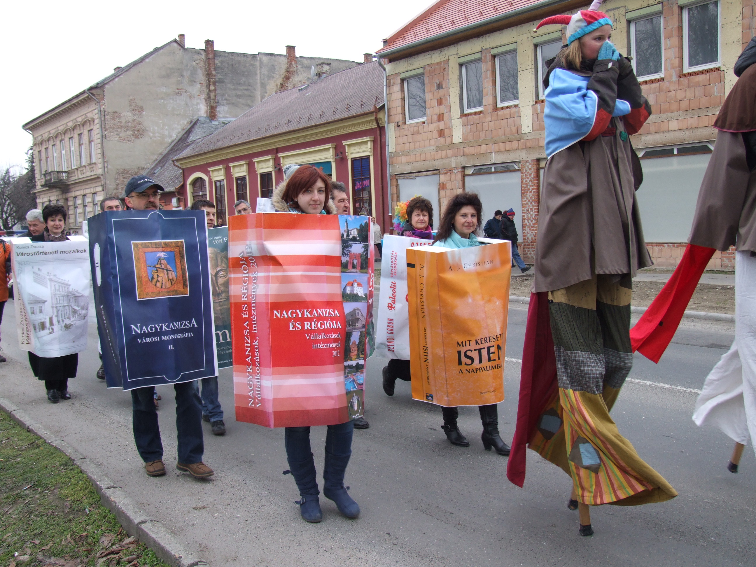 Nyilvános 1305 | 1625 | 2013. február 9. A farsangi fánkfesztiválra készülve felhívásban kértük olvasóinkat, hogy öltsék magukra kedves könyvüket. Egy „könyvespolcnyi” jelentkező vette magára kedves olvasmányát, az ő vonulásukról készültek ezek a képek. A környezetükben néhol láthatók a Nagykanizsai Gólyalábasok, akik szintén a könyvtárhoz kötődnek. A „felvonuló kötetek” a könyvtár épületében még megtekinthetők. | |