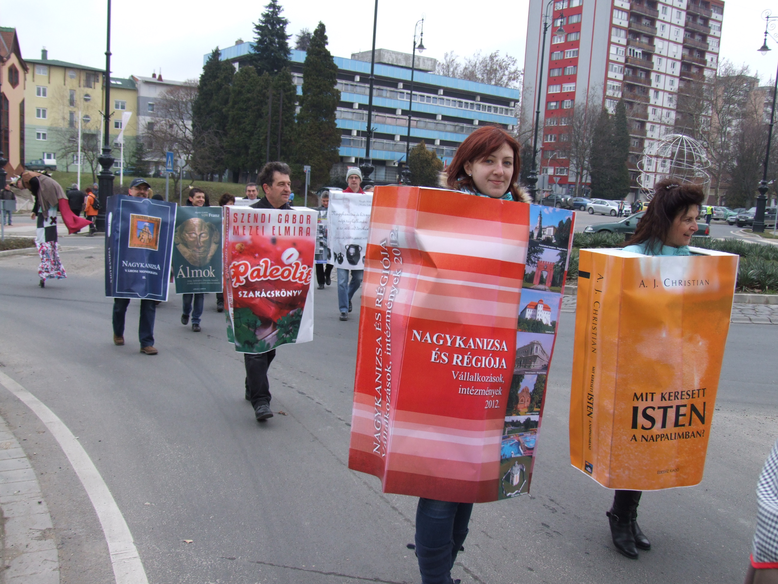 Nyilvános 1372 | 1764 | 2013. február 9. A farsangi fánkfesztiválra készülve felhívásban kértük olvasóinkat, hogy öltsék magukra kedves könyvüket. Egy „könyvespolcnyi” jelentkező vette magára kedves olvasmányát, az ő vonulásukról készültek ezek a képek. A környezetükben néhol láthatók a Nagykanizsai Gólyalábasok, akik szintén a könyvtárhoz kötődnek. A „felvonuló kötetek” a könyvtár épületében még megtekinthetők. | |