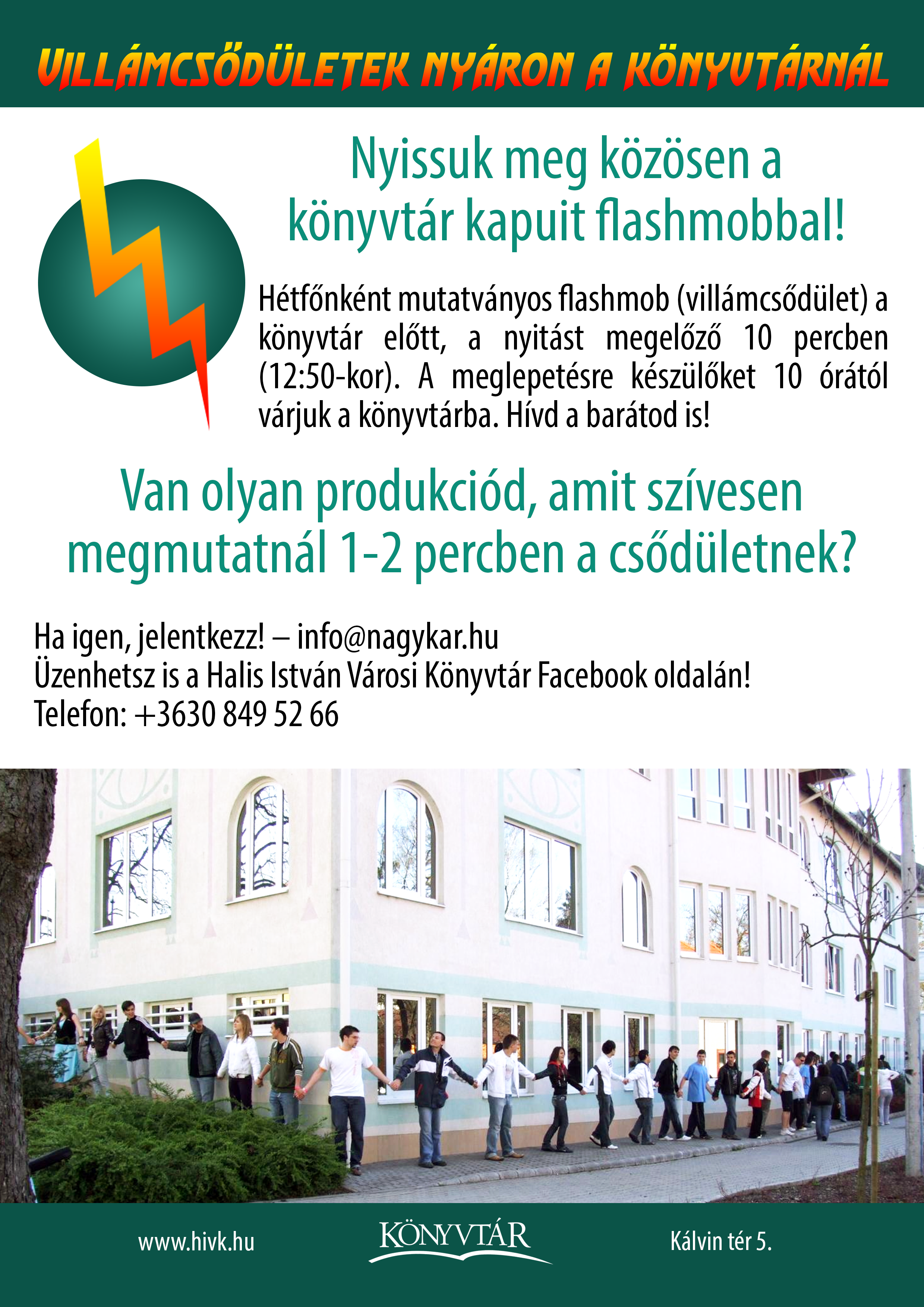 Nyilvános 1995 | 4258 | Villámcsődületek nyáron a könyvtárnál | Nyissuk meg közösen a könyvtár kapuit flashmobbal! Hétfőnként mutatványos flashmob (villámcsődület) a könyvtár előtt, a nyitást megelőző 10 percben (12:50-kor). A meglepetésre készülőket 10 órától várjuk a könyvtárba. Hívd a barátod is! Van olyan produkciód, amit szívesen megmutatnál 1-2 percben a csődületnek? Ha igen, jelentkezz! – info@nagykar.hu Üzenhetsz is a Halis István Városi Könyvtár Facebook oldalán! Telefon: +3630 849 52 66 www.hivk.hu Kálvin tér 5. |