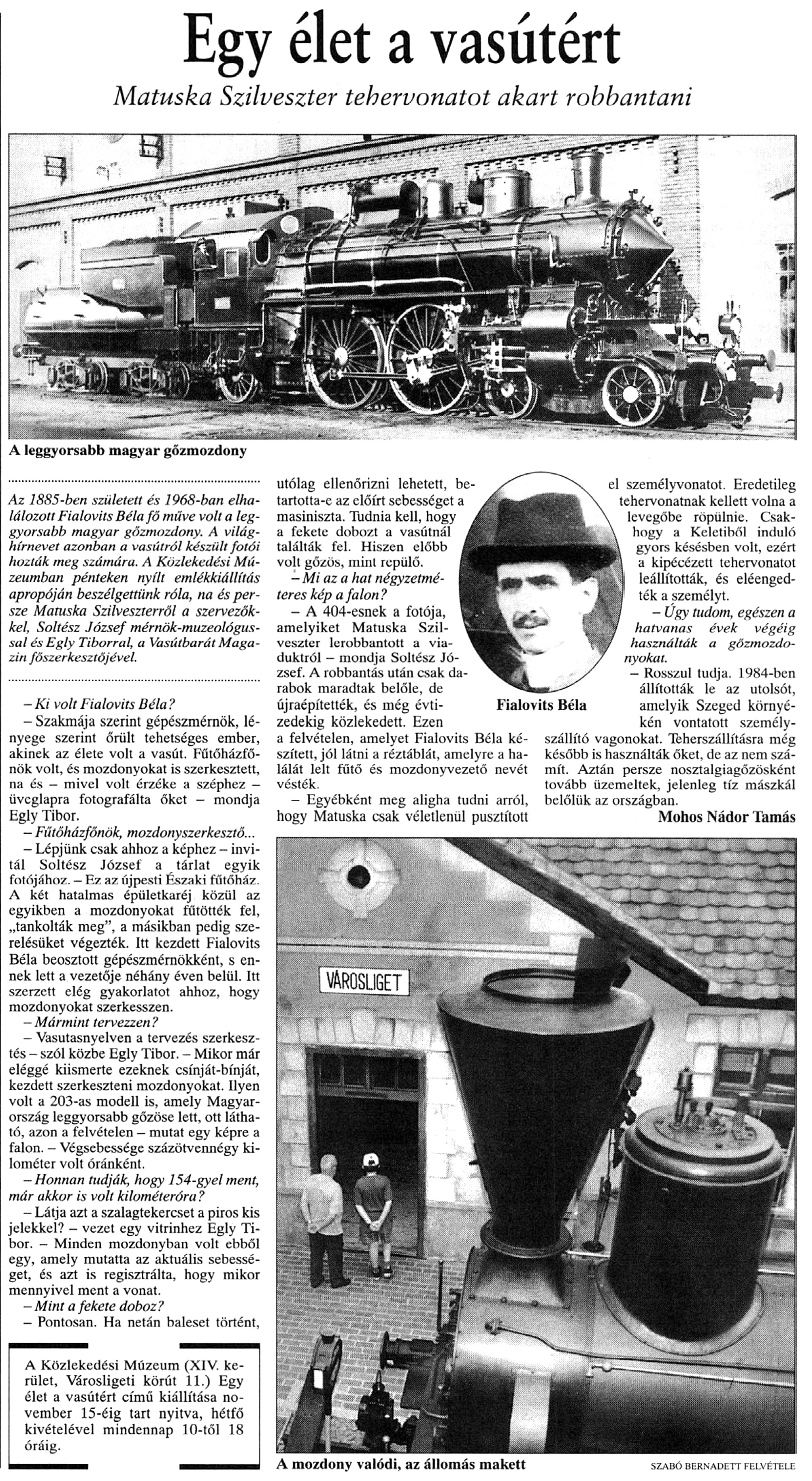 Nyilvános 1769 | 2797 | Népszabadság 1999. július 13. 28. oldal | Egy élet a vasútért Matuska Szilveszter tehervonatot akart robbantani A leggyorsabb magyar gőzmozdony Az 1885-ben született és 1968-ban elhalálozott Fialovits Béla fő műve volt a leggyorsabb magyar gőzmozdony. A világhírnevet azonban a vasútról készült fotói hozták meg számára. A Közlekedési Múzeumban pénteken nyílt emlékkiállítás apropóján beszélgettünk róla, na és persze Matuska Szilveszterről a szervezőkkel, Soltész József mérnök-muzeológussal és Egly Tiborral, a Vasútbarát Magazin főszerkesztőjével. - Ki volt Fialovits Béla ? - Szakmája szerint gépészmérnök, lényege szerint őrült tehetséges ember, akinek az élete volt a vasút. Fűtőházfőnök volt, és mozdonyokat is szerkesztett, na és - mivel volt érzéke a széphez — üveglapra fotografálta őket - mondja Egly Tibor. - Fűtőházfőnök, mozdony szerkesztő... - Lépjünk csak ahhoz a képhez - invitál Soltész József a tárlat egyik fotójához. — Ez az újpesti Északi fűtőház. A két hatalmas épületkaréj közül az egyikben a mozdonyokat fűtötték fel, „tankolták meg”, a másikban pedig szerelésüket végezték. Itt kezdett Fialovits Béla beosztott gépészmérnökként, s ennek lett a vezetője néhány éven belül. Itt szerzett elég gyakorlatot ahhoz, hogy mozdonyokat szerkesszen. - Mármint tervezzen ? - Vasutasnyelven a tervezés szerkesztés - szól közbe Egly Tibor. - Mikor már eléggé kiismerte ezeknek csínját-bínját, kezdett szerkeszteni mozdonyokat. Ilyen volt a 203-as modell is, amely Magyarország leggyorsabb gőzöse lett, ott látható, azon a felvételen - mutat egy képre a falon. — Végsebessége százötvennégy kilométer volt óránként. -Honnan tudják, hogy 154-gyel ment, már akkor is volt kilométeróra? - Látja azt a szalagtekercset a piros kis jelekkel? - vezet egy vitrinhez Egly Tibor. - Minden mozdonyban volt ebből egy, amely mutatta az aktuális sebességet, és azt is regisztrálta, hogy mikor mennyivel ment a vonat. - Mint a fekete doboz? - Pontosan. Ha netán baleset történt, utólag ellenőrizni lehetett, betartotta-e az előírt sebességet a masiniszta. Tudnia kell, hogy a fekete dobozt a vasútnál találták fel. Hiszen előbb volt gőzös, mint repülő. -Mi az a hat négyzetméteres kép a falon? - A 404-esnek a fotója, amelyiket Matuska Szilveszter lerobbantott a viaduktról — mondja Soltész József. A robbantás után csak darabok maradtak belőle, de újraépítették, és még évtizedekig közlekedett. Ezen a felvételen, amelyet Fialovits Béla készített, jól látni a réztáblát, amelyre a halálát lelt fűtő és mozdonyvezető nevét vésték. - Egyébként meg aligha tudni arról, hogy Matuska csak véletlenül pusztított el személyvonatot. Eredetileg tehervonatnak kellett volna a levegőbe röpülnie. Csakhogy a Keletiből induló gyors késésben volt, ezért a kipécézett tehervonatot leállították, és elengedték a személyt. - Úgy tudom, egészen a hatvanas évek végéig használták a gőzmozdonyokat. - Rosszul tudja. 1984-ben állították le az utolsót, amelyik Szeged környékén vontatott személyszállító vagonokat. Teherszállításra még később is használták őket, de az nem számít. Aztán persze nosztalgiagőzösként tovább üzemeltek, jelenleg tíz mászkál belőlük az országban. Mohos Nádor Tamás A Közlekedési Múzeum (XIV. kerület, Városligeti körút 11.) Egy élet a vasútért című kiállítása november 15-éig tart nyitva, hétfő kivételével mindennap 10-től 18 óráig. A mozdony valódi, az állomás makett szabó Bernadett felvétele |