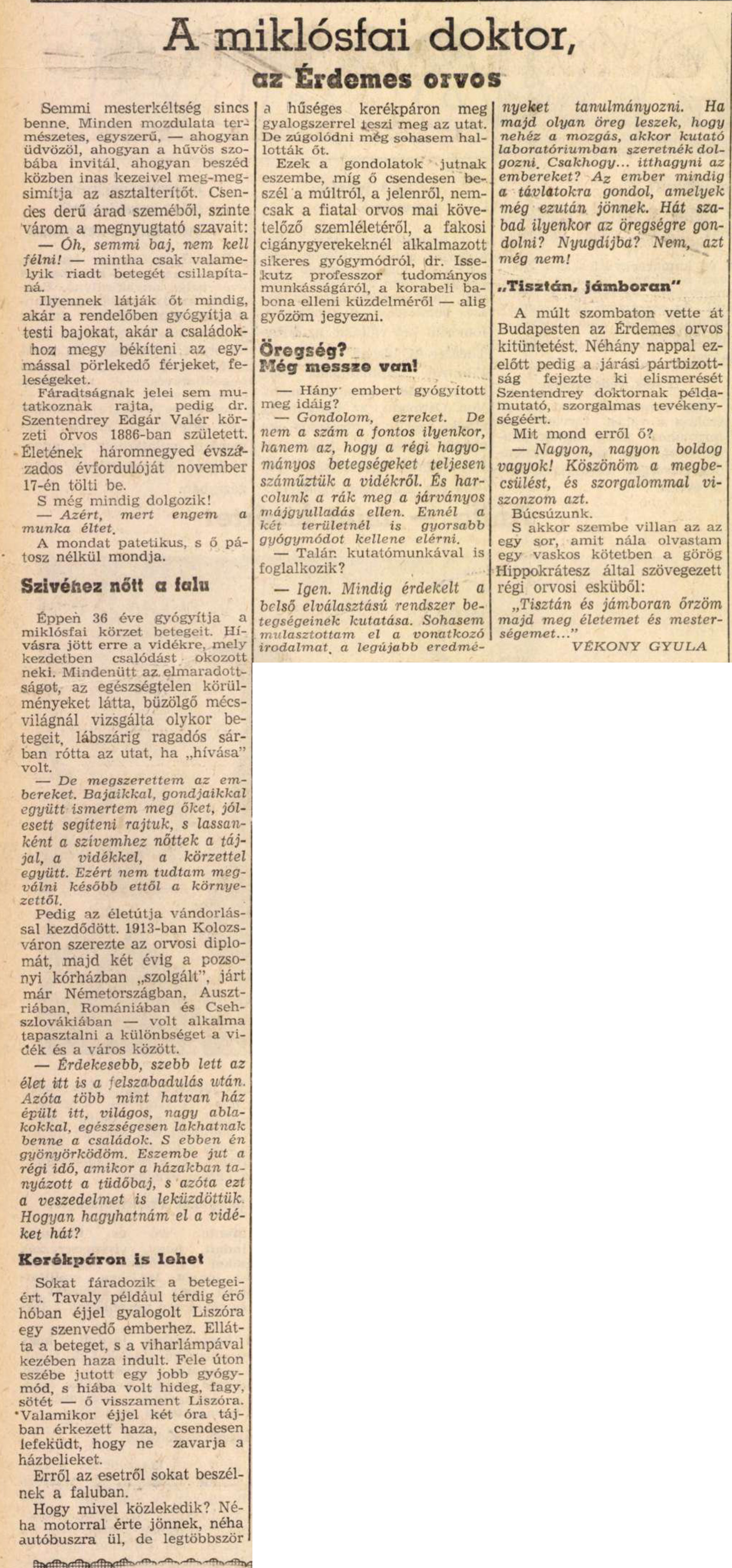 Nyilvános 1751 | 2700 | Zalai Hírlap 1961. július 9. 8. oldal | A miklósfai doktor, az Érdemes orvos Semmi mesterkéltség sincs benne. Minden mozdulata természetes, egyszerű, — ahogyan üdvözöl, ahogyan a hűvös szobába invitál, ahogyan beszéd közben inas kezeivel meg-megsimítja az asztalterítőt. Csendes derű árad szeméből, szinte várom a megnyugtató szavait: — Óh, semmi baj, nem kell félni! — mintha csak valamelyik riadt betegét csillapítaná. Ilyennek látják őt mindig, akár a rendelőben gyógyítja a testi bajokat, akár a családokhoz megy békíteni az egymással pörlekedő férjeket, feleségeket. Fáradtságnak jelei sem mutatkoznak rajta, pedig dr. Szentendrey Edgár Valér körzeti orvos 1886-ban született. Életének háromnegyed évszázados évfordulóját november 17-én tölti be. S még mindig dolgozik! — Azért, mert engem a munka éltet. A mondat patetikus, s ő pátosz nélkül mondja. Szívéhez nőtt a falu Éppen 36 éve gyógyítja a miklósfai körzet betegeit. Hívásra jött erre a vidékre, mely kezdetben csalódást okozott neki. Mindenütt az elmaradottságot, az egészségtelen körülményeket látta, büzölgő mécsvilágnál vizsgálta olykor betegeit, lábszárig ragadós sárban rótta az utat, ha „hívása” volt. — De megszerettem az embereket. Bajaikkal, gondjaikkal együtt ismertem meg őket, jólesett segíteni rajtuk, s lassanként a szívemhez nőttek a tájjal, a vidékkel, a körzettel együtt. Ezért nem tudtam megválni később ettől a környezettől. Pedig az életútja vándorlással kezdődött. 1913-ban Kolozsváron szerezte az orvosi diplomát, majd két évig a pozsonyi kórházban „szolgált”, járt már Németországban, Ausztriában, Romániában és Csehszlovákiában — volt alkalma tapasztalni a különbséget a vidék és a város között. — Érdekesebb, szebb lett az élért itt is a felszabadulás után. Azóta több mint hatvan ház épült itt, világos, nagy ablakokkal, egészségesen lakhatnak benne a családok. S ebben én gyönyörködöm. Eszembe jut a régi idő, amikor a házakban tanyázott a tüdőbaj, s azóta ezt a veszedelmet is leküzdöttük. Hogyan hagyhatnám el a vidéket hát? Kerékpáron is lehet Sokat fáradozik a betegeiért. Tavaly például térdig érő hóban éjjel gyalogolt Liszóra egy szenvedő emberhez. Ellátta a beteget, s a viharlámpával kezében haza indult. Fele úton eszébe jutott egy jobb gyógymód, s hiába volt hideg, fagy, sötét — ő visszament Liszóra. "Valamikor éjjel két óra tájban érkezett haza, csendesen lefeküdt, hogy ne zavarja a házbelieket. Erről az esetről sokat beszélnek a faluban. Hogy mivel közlekedik? Néha motorral érte jönnek, néha autóbuszra ül, de legtöbbször a hűséges kerékpáron meg gyalogszerrel teszi meg az utat. De zúgolódni még sohasem hallották őt. Ezek a gondolatok jutnak eszembe, míg ő csendesen beszél a múltról, a jelenről, nemcsak a fiatal orvos mai követelőző szemléletéről, a fakosi cigánygyerekeknél alkalmazott sikeres gyógymódról, dr. Issekutz professzor tudományos munkásságáról, a korabeli babona elleni küzdelméről — alig győzöm jegyezni. Öregség? Még messze van! — Hány embert gyógyított meg idáig? — Gondolom, ezreket. De nem a szám a fontos ilyenkor, hanem az, hogy a régi hagyományos betegségeket teljesen száműztük a vidékről. És harcolunk a rák meg a járványos májgyulladás ellen. Ennél a két területnél is gyorsabb gyógymódot kellene elérni. — Talán kutatómunkával is foglalkozik? — Igen. Mindig érdekelt a belső elválasztású rendszer betegségeinek kutatása. Sohasem mulasztottam el a vonatkozó irodalmat, a legújabb eredményeket tanulmányozni. Ha majd olyan öreg leszek, hogy nehéz a mozgás, akkor kutató laboratóriumban szeretnék dolgozni. Csakhogy... itthagyni az embereket? Az ember mindig a távlatokra gondol, amelyek még ezután jönnek. Hát szabad ilyenkor az öregségre gondolni? Nyugdíjba? Nem, azt még nem! „Tisztán, jámboran" A múlt szombaton vette át Budapesten az Érdemes orvos kitüntetést. Néhány nappal ezelőtt pedig a járási, pártbizottság fejezte ki elismerését Szentendrey doktornak példamutató, szorgalmas tevékenységéért. Mit mond erről ő? — Nagyon, nagyon boldog vagyok! Köszönöm a megbecsülést, és szorgalommal viszonzom azt. Búcsúzunk. S akkor szembe villan az az egy sor, amit nála olvastam egy vaskos kötetben a görög Hippokrátesz által szövegezett régi orvosi esküből: „Tisztán és jámboran őrzöm majd meg életemet és mesterségemet...” VÉKONY GYULA |