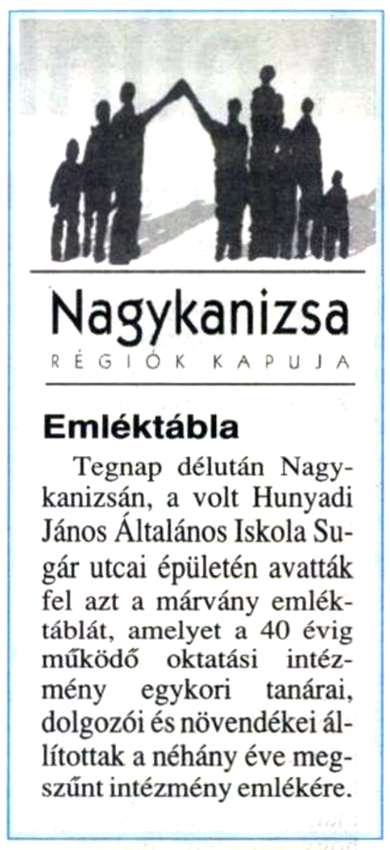 Nyilvános 1685 | 2814 | Zalai Hírlap 2000. június 9. 5. oldal | Emléktábla Tegnap délután Nagykanizsán, a volt Hunyadi János Általános Iskola Sugár utcai épületén avatták fel azt a márvány emléktáblát, amelyet a 40 évig működő oktatási intézmény egykori tanárai, dolgozói és növendékei állítottak a néhány éve megszűnt intézmény emlékére. |