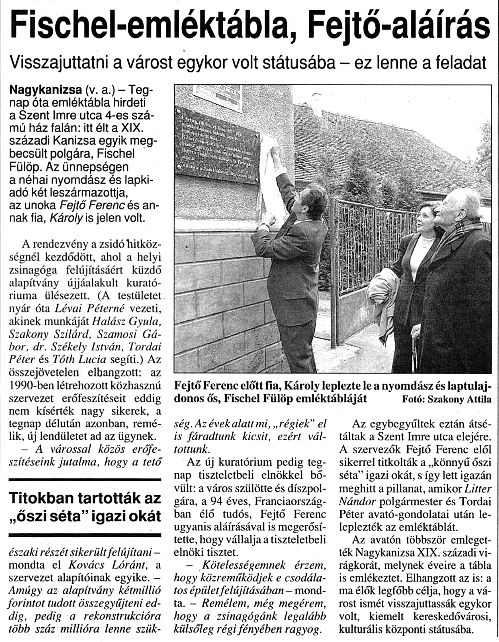 Nyilvános 1395 | 1850 | Zalai Hirlap 2003. október 14. 5. oldal | Fischel-emléktábla, Fejtő-aláírás Visszajuttatni a várost egykor volt státusába - ez lenne a feladat Nagykanizsa (v. a.) - Tegnap óta emléktábla hirdeti a Szent Imre utca 4-es számú ház falán: itt élt a XIX. századi Kanizsa egyik megbecsült polgára, Fischel Fülöp. Az ünnepségen a néhai nyomdász és lapkiadó két leszármazottja, az unoka Fejtő Ferenc és annak fia, Károly is jelen volt. A rendezvény a zsidó hitközségnél kezdődött, ahol a helyi zsinagóga felújításáért küzdő alapítvány újjáalakult kuratóriuma ülésezett. (A testületet nyár óta Lévai Péterné vezeti, akinek munkáját Halász Gyula, Szakony Szilárd, Szamosi Gábor, dr. Székely István, Tordai Péter és Tóth Lucia segíti.) Az összejövetelen elhangzott: az 1990-ben létrehozott közhasznú szervezet erőfeszítéseit eddig nem kísérték nagy sikerek, a tegnap délután azonban, remélik, új lendületet ad az ügynek. - A várossal közös erőfeszítéseink jutalma, hogy a tető északi részét sikerült felújítani - mondta el Kovács Lóránt, a szervezet alapítóinak egyike. - Amúgy az alapítvány kétmillió forintot tudott összegyűjteni eddig, pedig a rekonstrukcióra több száz millióra lenne szükség. Az évek alatt mi, „régiek” el is fáradtunk kicsit, ezért váltottunk. Az új kuratórium pedig tegnap tiszteletbeli elnökkel bővült: a város szülötte és díszpolgára, a 94 éves, Franciaországban élő tudós, Fejtő Ferenc ugyanis aláírásával is megerősítette, hogy vállalja a tiszteletbeli elnöki tisztet. - Kötelességemnek érzem, hogy közreműködjek e csodálatos épület felújításában - mondta. - Remélem, még megérem, hogy a zsinagógánk legalább külsőleg régi fényében ragyog. Az egybegyűltek eztán átsétáltak a Szent Imre utca elejére. A szervezők Fejtő Ferenc elől sikerrel titkolták a„könnyű őszi séta” igazi okát, s így lett igazán meghitt a pillanat, amikor Litter Nándor polgármester és Tordai Péter avató-gondolatai után leleplezték az emléktáblát. Az avatón többször emlegették Nagykanizsa XIX. századi virágkorát, melynek éveire a tábla is emlékeztet. Elhangzott az is: a ma élők legfőbb célja, hogy a várost ismét visszajuttassák egykor volt, kiemelt kereskedővárosi, kulturális központi státusába. Fejtő Ferenc előtt fia, Károly leplezte le a nyomdász és laptulajdonos ős, Fischel Fülöp emléktábláját Fotó: Szakony Attila |