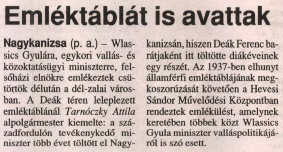 Nyilvános 1323 | 1572 | Zalai Hirlap 2002. március 16. 5. oldal | Emléktáblát is avattak Nagykanizsa (p. a.) - Wlassics Gyulára, egykori vallás- és közoktatásügyi miniszterre, felsőházi elnökre emlékeztek csütörtök délután a dél-zalai városban. A Deák téren leleplezett emléktáblánál Tarnóczky Attila alpolgármester kiemelte: a századfordulón tevékenykedő miniszter több évet töltött el Nagykanizsán, hiszen Deák Ferenc barátjaként itt töltötte diákéveinek egy részét. Az 1937-ben elhunyt államférfi emléktáblájának megkoszorúzását követően a Hevesi Sándor Művelődési Központban rendeztek emlékülést, amelynek keretében többek közt Wlassics Gyula miniszter valláspolitikájáról is szó esett. |
