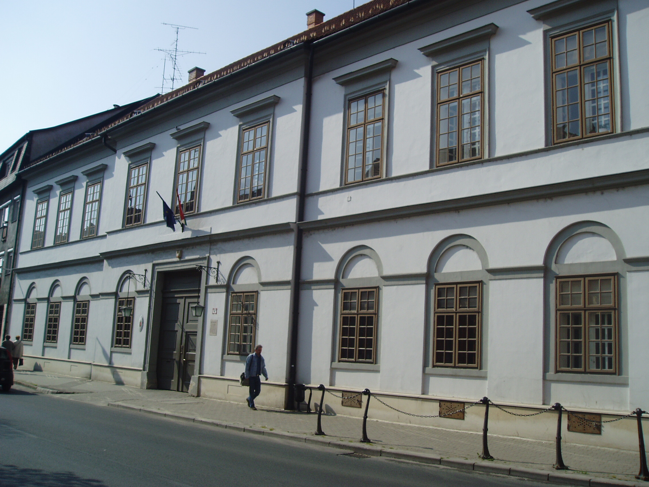 Nyilvános 849 | 1665 | Pápa, Fő utca 17. Régi Megyeháza | A két utcára néző egyemeletes középületet 1824-ben építették klasszicista stílusban. 1732-ig Veszprém vármegyének nem volt hivatalos központja, s a megyegyűléseket elsősorban Pápán és Veszprémben tartották. 1732-ben Veszprémben felépítették a megyeházát a püspök által ajándékozott telken. Pápa azonban, ragaszkodván ősi jogaihoz, 1824-ben szintén épített egy megyeházát. Az épülethez jeles irodalmi emlék is fűződik: a pápai kollégium (lásd: Pápa, Petőfi u. 13.) önképzőköre 1842. június 30-án itt tartotta egyik ünnepi összejövetelét, amelyen részt vett Petőfi Sándor és Jókai Mór is. Petőfi - akkor még Petrovics Sándor az 1841/42-es tanévben a pápai református kollégium diákja volt. Szorosan vett iskolai tanulmányai mellett pályájára döntő hatással volt az iskola önképzőkörének - Képzőtársaságának - tevékenysége, amelyben az ugyancsak Pápán diákoskodó Jókaival, Orlai Petrich Somával és más jeles diákokkal vett részt. Az 1842. június 30-i ünnepségen az arra érdemesített diákok saját verseikkel, elbeszéléseikkel, szavalatokkal mutatkoztak be a város közönségének. Eszterházy Károly, Pápa ura pénzjutalmat is kitűzött a legjobb teljesítmények jutalmazására. Ez alkalommal Petőfi két verse is elhangzott diáktársai tolmácsolásában: Lehel című balladája, illetve a Szín és való (lásd még: Pápa, Fő tér 15.) című verse. Ő maga viszont más költőktől szavalt (akkoriban még színész szeretett volna lenni). Különösen nagy sikert aratott egy korabeli divatos verssel, Szalkay Máté: Ólmos botok című költeményével. Kölcsönkért jelmezben - lobogós ingben, pitykés nadrágban, kezében fütyköst forgatva - remekül eljátszotta a maradi korteseket parodizáló verset. Lehel című balladájával két arany pályadíjat nyert, s a jelen lévő Eszterházy grófnak annyira tetszett az Ólmos botok előadása, hogy jutalmát megtoldotta még egy arannyal. A műsoron Jókai is jelen volt, neki két elbeszéléséből olvastak fel diáktársai részleteket. A fénykép 2007 áprilisában készült. Felh. irod.: Németh Adél - Szabó Lajos: Pápa. Bp. Panoráma, 1989 "A kényes úrfi s a rongyos baka". Tanulmányok két halhatatlan pápai diákról. Pápa, Pápai Református Gyűjtemények, 2001 |