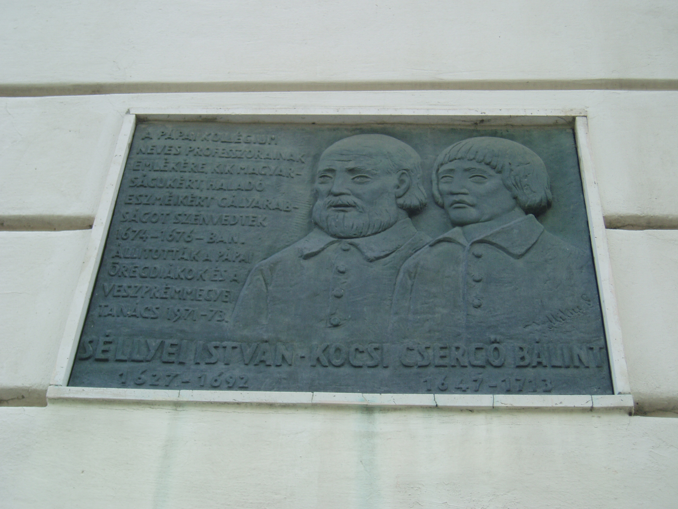 Nyilvános 813 | 1466 | Pápa, Március 15. tér 9. Pápai Református Kollégium Gimnáziuma | A híres pápai Református Kollégium első épülete 1531 és 1752 között a mai Ruszek közben, a Lábasház épületének helyén állott. 1752-ben - Mária Terézia rendeletének következtében, amely megszüntette a szabad vallásgyakorlást - harminckét évig csak a közeli Adásztevelen működhetett. 1784-ben, II. József türelmi rendeletének köszönhetően térhetett vissza az iskola Pápára, s hamarosan felépült a ma Ókollégiumként ismert épület (lásd: Pápa, Petőfi u. 13.), amelyben 1794-ben indulhatott meg az oktatás. Az intézmény 1857-ig működött ott, ekkor átköltözött a Március 15. tér 13-15. számú házba, az ún. Nátus-ba, majd 1895-ben utolsó végleles helyére, ide, a Március 15. tér 9. számú monumentális új épületbe. A képen látható dombormű Séllyei István (1669-1692) gályarab prédikátor, dunántúli püspök, valamint Kocsi Csergő Bálint (1647-1711), szintén gályarabságra ítélt író, lelkész, tanár emlékét őrzi. Miután Ruyter holland tengernagy segítségével (lásd még: Debrecen, Emlékkert: Gálayarabok emlékoszlopa) kiszabadultak még életben lévő társaikkal együtt, hazatérve fellendítették az iskolát. Az emléktábla Mikus Sándor alkotása. A fénykép 2007 áprilisában készült. Felh. irod.: Németh Adél - Szabó Lajos: Pápa. Bp. Panoráma, 1989 http://refi-papa.hu |
