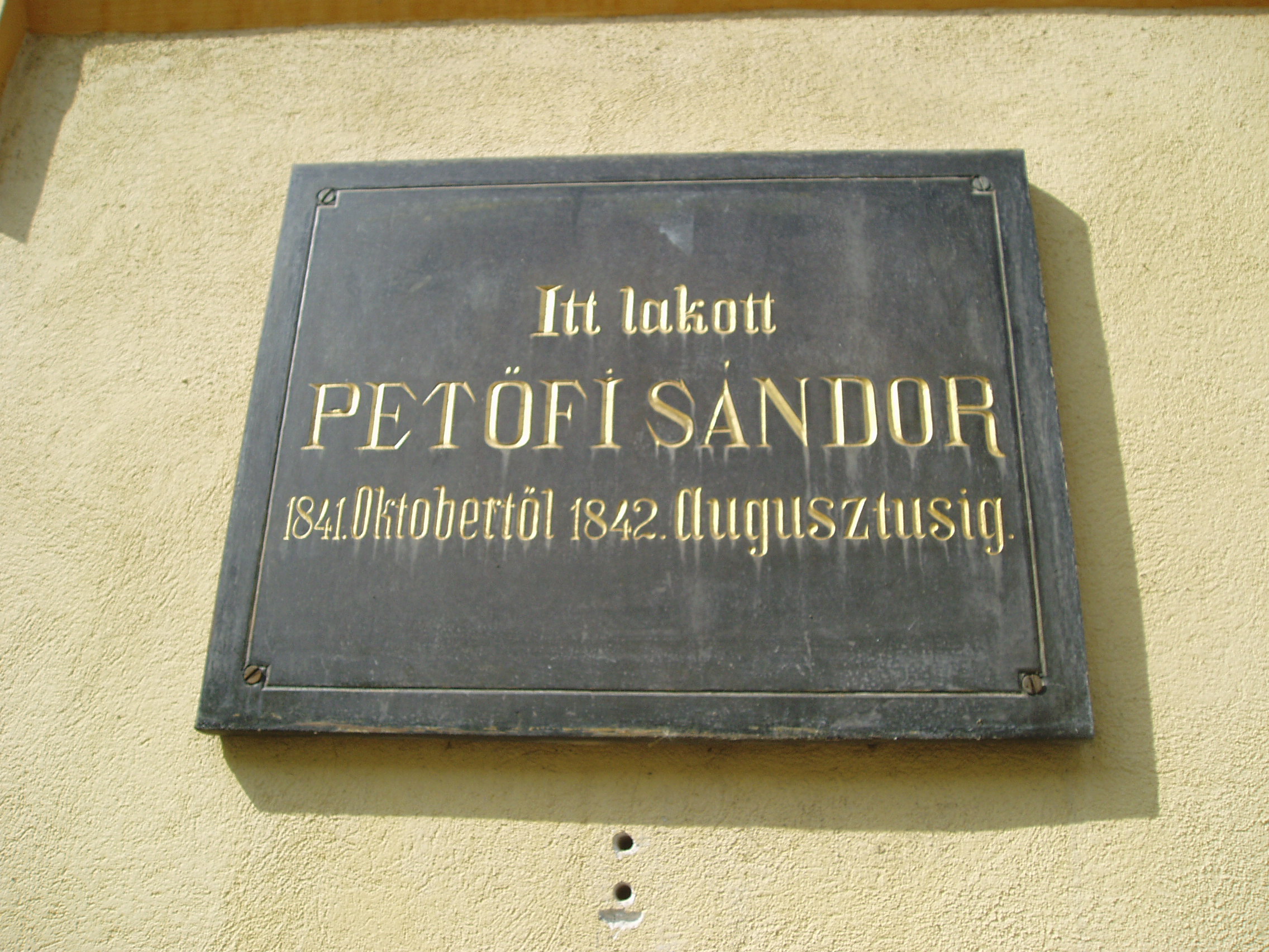 Nyilvános 881 | 1908 | Pápa, Petőfi utca 11. | Klasszicista stílusban épült, műemlék jellegű lakóház áll az Ókollégium tőszomszédságában. Itt volt pápai diák korában Petőfi Sándor harmadik szállása, itt lakott a leghosszabb ideig. A ferences templommal (lásd: Pápa, Barát u. 1.) szemben lévő fűtetlen szobájából költözött ide, mégpedig az iskola igazgatóságának tudta nélkül, amiért megrovásban részesült. A házon lévő két feliratos tábla szerint 1841 októbere és 1842 augusztusa között lakott itt; a kezdő dátum azonban kérdéses, hiszen Orlai Petrich Soma szerint 1841 telén a ferences templommal átellenben, egy fűtetlen szobában laktak, s a zord időjárás miatt költöztek át ide, az iskola szomszédságába. Ekkoriban került be Petőfi és Orlai szűk baráti körébe Jókai Mór, aki majdnem annyit tartózkodott itt, mint saját lakásán (lásd: Pápa, Jókai u. 13.) Jókai nagy szeretettel emlékezett ezekre az együttlétekre: "Mindegyikünknek volt saját kedvenc szenvedélye: Orlayé a költészet, Petőfié a színpad, enyém a festőecset. Ha Orlay írt tüneményes regényjeleneteket, Petőfi meg elszavalta azokat, én képeket festettem hozzájuk... Egymásnak őszinte bámulói voltunk: Orlay megközelíté előttünk Jósika Miklóst, Petőfi is csak egy fokkal állt alább Egressynél [Egressy Gábor]..." Orlai így emlékezett: "Kis szobánknak egyetlen ablaka az utcára szolgált. De e kis helyen a 41. és 42. év telén és a reá következő nyár folyamán sok szépemlékű napokat éltünk át. Itt építgettük jövendőnk ábrándvárait, gyakran éjfelekig ... Néha e kis szobát a jóbarátok vidám zaja töltötte be, kik iskola előtt és után örömest tértek be hozzánk..." Ittlakásának idején, 1842 májusában jelent meg az Athenaeum c. országos folyóiratban A borozó című verse - elképzelhető, hogy ebben a házban írta, hiszen innét küldte el Pestre. Pápán is jelentek meg nyomtatásban versei - egyelőre név nélkül, a helyi Népbarát című közhasznú kalendárium 1843. évi kötetében. Erre az időre esett nagysikerű részvétele a Képzőtársaság nyilvános rendezvényén (lásd: Pápa, Fő u. 17.), ahol 3 arany pályadíjat nyert. Az eseményt a szállásával szemben lévő Három rózsa nevű kocsmában barátaival meg is ünnepelte... Ittlakásának időszakára esik választott új, halhatatlanná vált vezetéknevének felvétele is. Mint Nádasdy Lajos nyugalmazott református lelkész, helytörténész fogalmazott: "Petrovics Sándor Kiskőrösön született. Petőfi Sándor Pápán." A fénykép 2007 áprilisában készült. Felh. irod.: Németh Adél - Szabó Lajos: Pápa. Bp. Panoráma, 1989 Petőfi emlékhelyek a Kérpát-medencében. Kiskőrös, 1996, Petőfi Sándor Társaság "A kényes úrfi s a rongyos baka". Tanulmányok két halhatatlan pápai diákról. Pápa, 2001, Pápai Református Gyűjtemények |