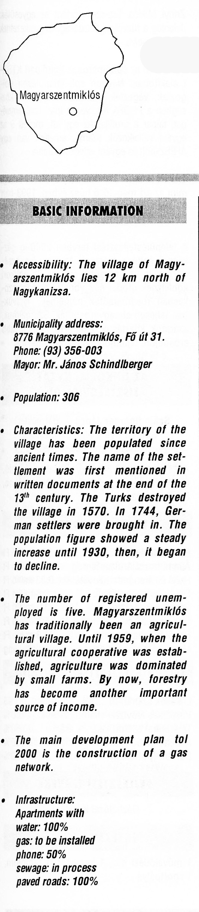 Nyilvános 2416 | 6373 | Magyarszentmiklós | BASIC INFORMATION Accessibility: The village of Magyarszentmiklós lies 12 km north of Nagykanizsa. Municipality address: 8776 Magyarszentmiklós, Fő út 31. Phone: (93) 356-003 Mayor: Mr. János Schindlberger Population: 306 Characteristics: The territory of the village has been populated since ancient times. The name of the settlement was first mentioned in written documents at the end of the 13th century. The Turks destroyed the village in 1570. In 1744, German settlers were brought in. The population figure showed a steady increase until 1930, then, it began to decline. The number of registered unemployed is five. Magyarszentmiklós has traditionally been an agricultural village. Until 1959, when the agricultural cooperative was established, agriculture was dominated by small farms. By now, forestry has become another important source of income. The main development plan tol 2000 is the construction of a gas network. Infrastructure: Apartments with water: 100% gas: to be installed phone: 50% sewage: in process paved roads: 100% This text came from the following book: Title: Handbook of Zala county (Zala megye kézikönyve) Series: County handbooks of Hungary (Magyarország megyei kézikönyvei) Chief editor: Hóbor József Publisher: (Hatvan), CEBA-Hungary Ltd, 1998 ETO: 908.439.121(035) ; 050.8(439.121) ISBN: 963-9089-18-2 Pages: 488-1040 p. Remark: Closed on: 1998. márc. 31. |
