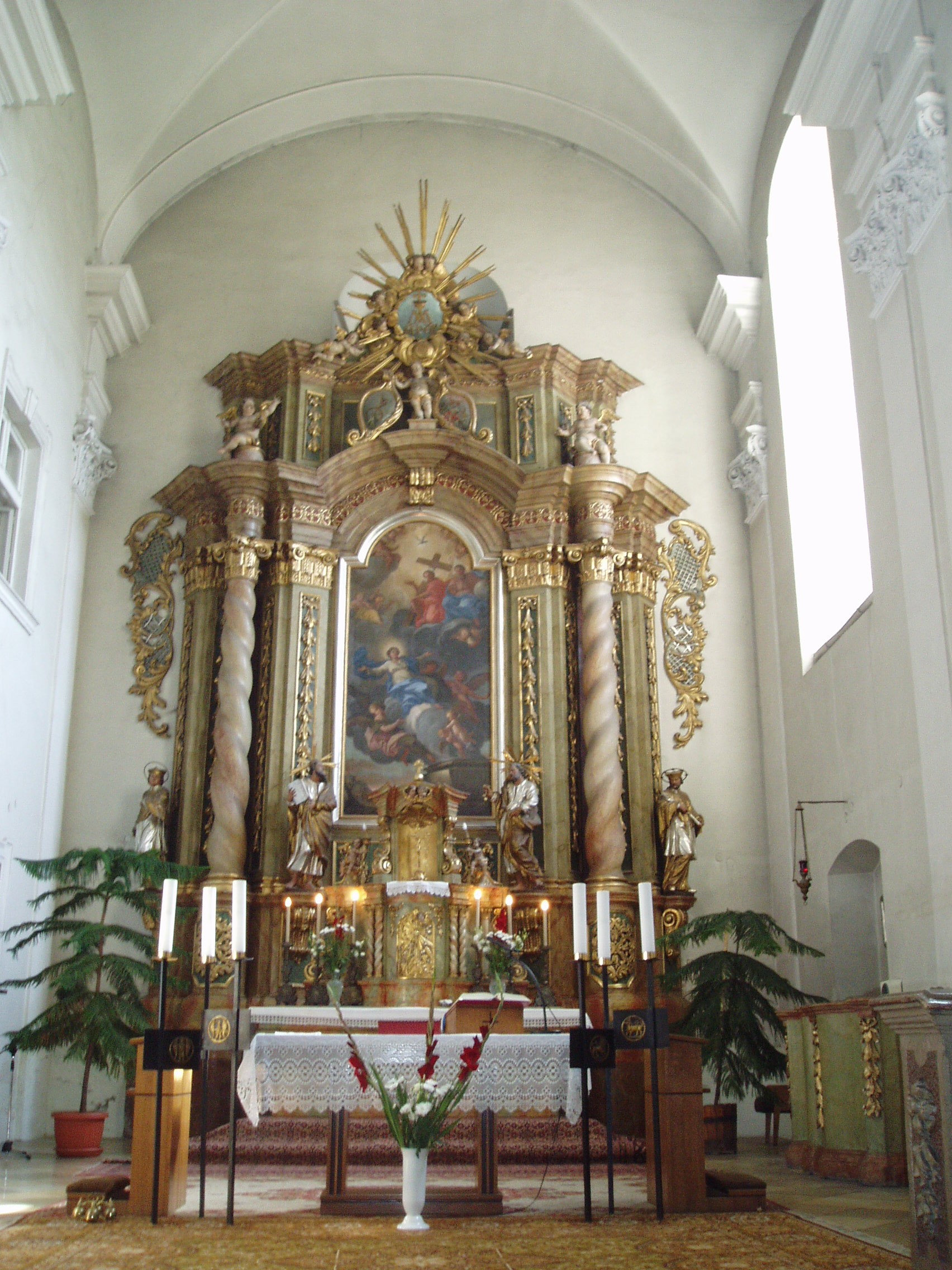 Nyilvános 1067 | 1616 | Kecskemét, Jókai utca 1. Piarista templom | A műemléki védelemmel óvott piarista templom és rendház a város legszebb barokk épületegyüttese. A piarista atyákat a város egyik földesura, gróf Koháry István telepítette le Kecskeméten a XVIII. század elején, s 1712-ben alapítványt is tett templomuk, rendházuk és iskolájuk felépítésére. Az épületegyüttes fokozatosan, több ütemben készült el. A templomot nagy valószínűséggel Mayerhoffer András tervezte. Mint Heltai Nándor helytörténész írja, a templom máig őrzi a reneszánszot felváltó új stílus, a barokk kezdeti frissességét, derűjét. A képen a Felvidéken készített, a Szentháromságot ábrázoló főoltár látható. A fénykép 2006 augusztusában készült. Felh. irod.: Heltai Nándor: Kecskemét. Kecskeméti Lapok, 1998 |