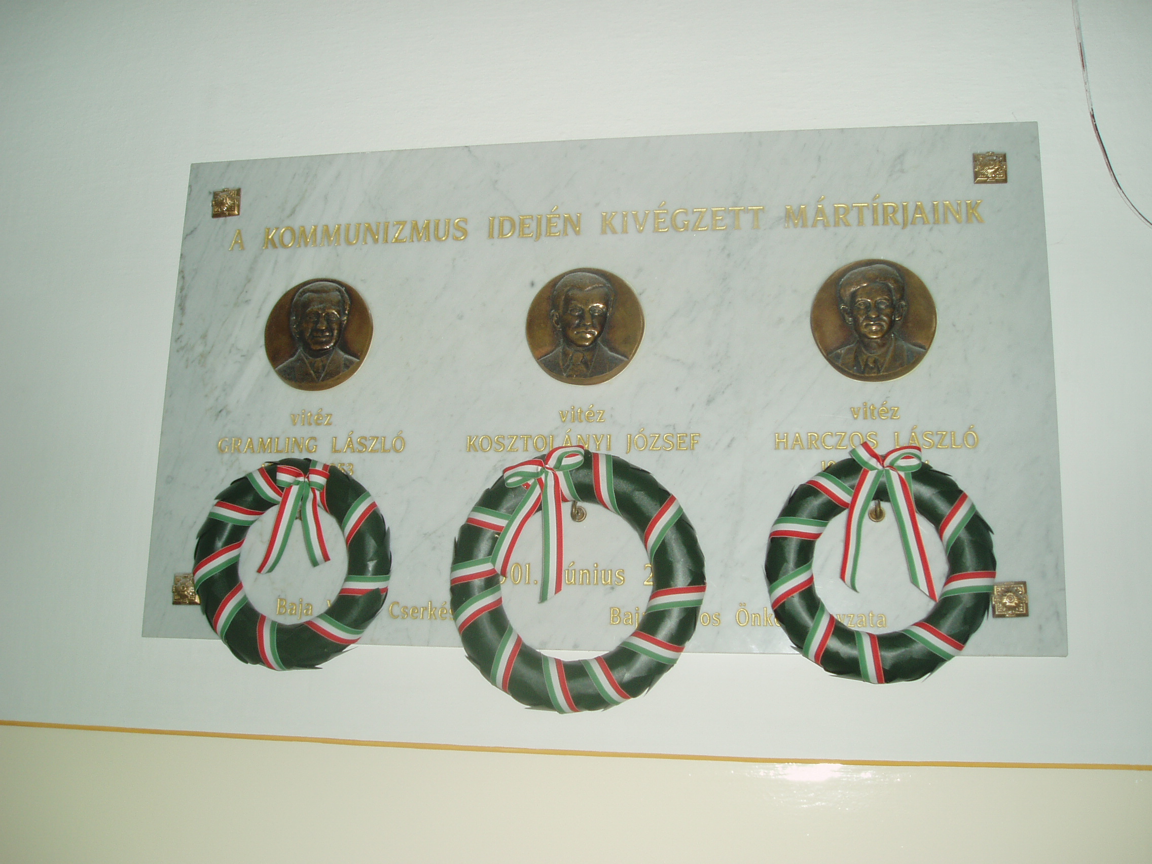 Nyilvános 1004 | 1541 | Baja, Szent Imre tér 5. III. Béla Gimnázium | Vitéz Gramling László, vitéz Kosztolányi József és vitéz Harczos László emléktáblája az előcsarnok falán, akik a koncepciós perek áldozatául estek. Egykor mindhárman a gimnázium cserkészcsapatának tagjai voltak. A fénykép 2007 októberében készült. www.bajatv.hu |