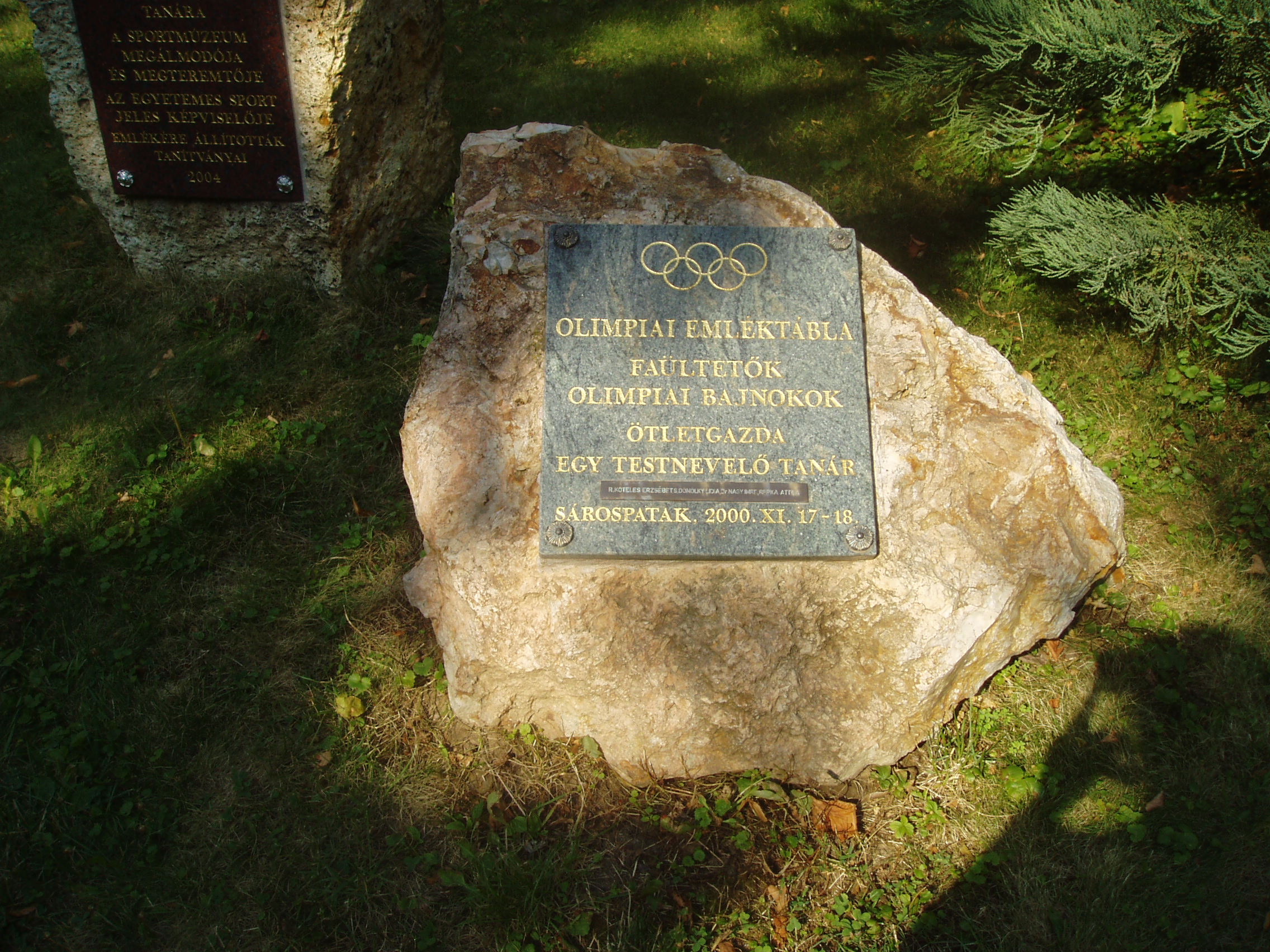 Nyilvános 978 | 1586 | Sárospatak, Iskolakert: A pataki diákok emlékezete | A Református Kollégium (lásd: Sárospatak, Rákóczi u. 1.) bejáratával szemben találjuk az Iskolakertnek nevezett parkot. Az 1980-as években természetvédelmi területté nyilvánított Iskolakert sajátos nemzeti érték, mely egyedülálló az országban. Sétányai mentén Patakhoz kötődő jeles személyiségek szobrai állnak. Az iskolakertben álló műemlék tornacsarnok közelében is elhelyeztek néhány feliratos emlékkövet. A képen a 2000-ben felállított Olimpiai emléktábla látható. A fénykép 2007 augusztusában készült. Felh. irod.: Látnivalók Borsod-Abaúj-Zemplén megyében. Miskolc, Well-PRess, 1995 |