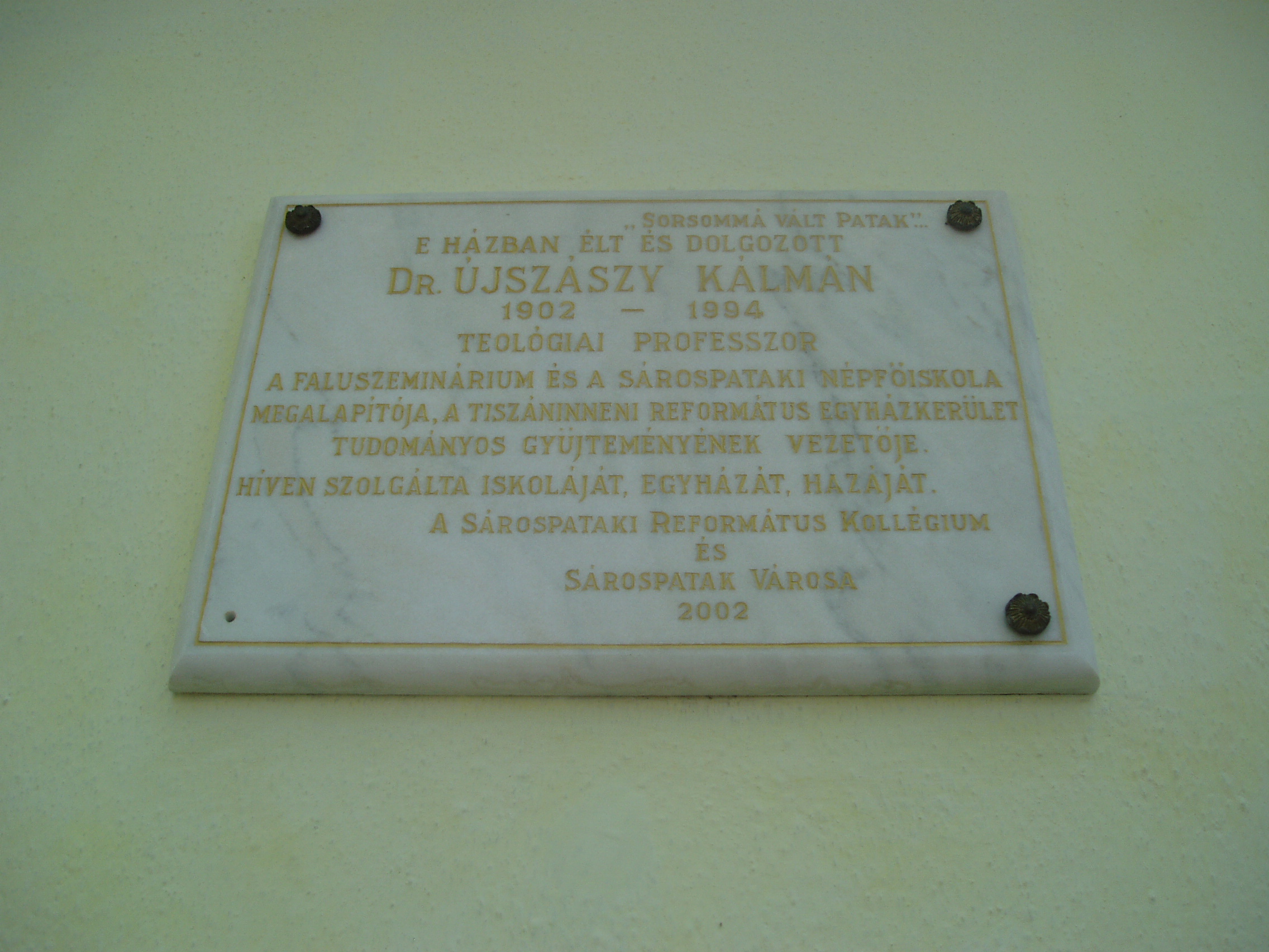 Nyilvános 934 | 1485 | Sárospatak, Kazinczy utca 11. | 1817 és 1834 között ebben az épületben működött a Református Kollégium nyomdája. A ház később sok jeles közéleti, és főként az irodalom és művészet terén működő személyiség kiröpítő fészke lett. A hagyomány szerint többször megszállt benne Kossuth Lajos. A későbbi évtizedekben az Újszászy család tulajdonába került. Itt élt Dr. Újszászy Kálmán (1902-1994) teológiai professzor, akinek révén a kis ház Patak egyik szellemi központjává vált. Újszászy Kálmán Budapesten született 1902. december 13-án; a gimnáziumot is a fővárosban végezte el. 1921-től a sárospataki teológiára járt, 1931-ben ott lett teológiai akadémiai tanár, ezt megelőzően egy-egy évig Glasgow, Basel, Athén protestáns tanintézeteinek hallgatója volt. A pataki teológián a filozófiai-pedagógiai tanszéket vezette, 1932-ben filozófiai doktorátust szerzett Debrecenben, 1939-ben Szegeden egyetemi magántanári képesítést nyert A falunevelés szellemi alapjai című értekezésével. 1931-től a Sárospatakon kibontakozó faluszeminárium, 1936-től a népfőiskola egyik irányítója, 1944-1946 között a főiskola rektora volt. A népfőiskola 1948-ban - kényszerűen - megszűnt, a református intézmények közül a tanítóképzőt 1950-ben, a gimnáziumot 1952-ben államosították. 1951-ben megszüntették a teológiát is, amely 1992-ben kezdte meg újra a működést. Újszászy professzor 1948 után a kollégium főkönyvtárosa, 1951-től a Tiszáninneni Református Egyházkerület Tudományos Gyűjteményeinek szervezője, 1952-től a Magyarországi Református Egyház zempléni egyházmegyéjének gondnoka, 1964-től 1990-ig pedig a Tiszáninneni Egyházkerület főgondnoka volt. Emellett 1969-től ügyvezető elnöke, 1971-ben pedig elnöke az Országos Református Gyűjteményi Tanácsnak. A fénykép 2007 augusztusában készült. Felh. irod.: Balassa Iván: Sárospatak történeti helyrajza, XVI-XX. század. Miskolc, Borsod-Abaúj-Zemplén Megyei Levéltár, 1994 Takács Béla: A sárospataki nyomda története. Bp. Magyar Helikon, 1978 Benda Kálmán beszélgetése a 90 esztendős Újszászy Kálmánnal. = Confessio 1993. 3. |