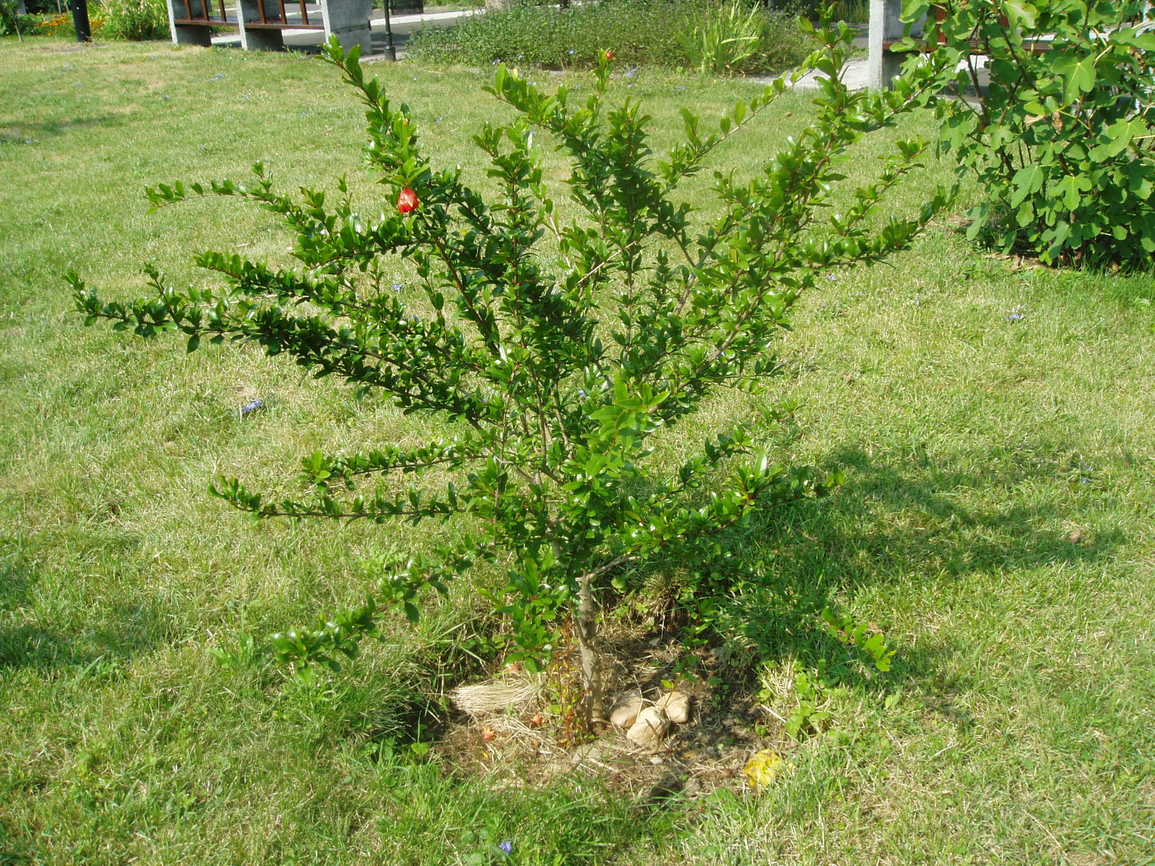 Nyilvános 977 | 1476 | Sárospatak, Rákóczi utca 1. Református Kollégium | A Kollégium udvarán, a Berna-sor előtt alakították ki a Bibliai kertet. Mintegy ötven féle, a Bibliában említett növény található itt. Az eligazodást alaprajz és a növények jegyzéke segíti. A képen egy kis gránátalmafa látható. A fénykép 2007 augusztusában készült. |