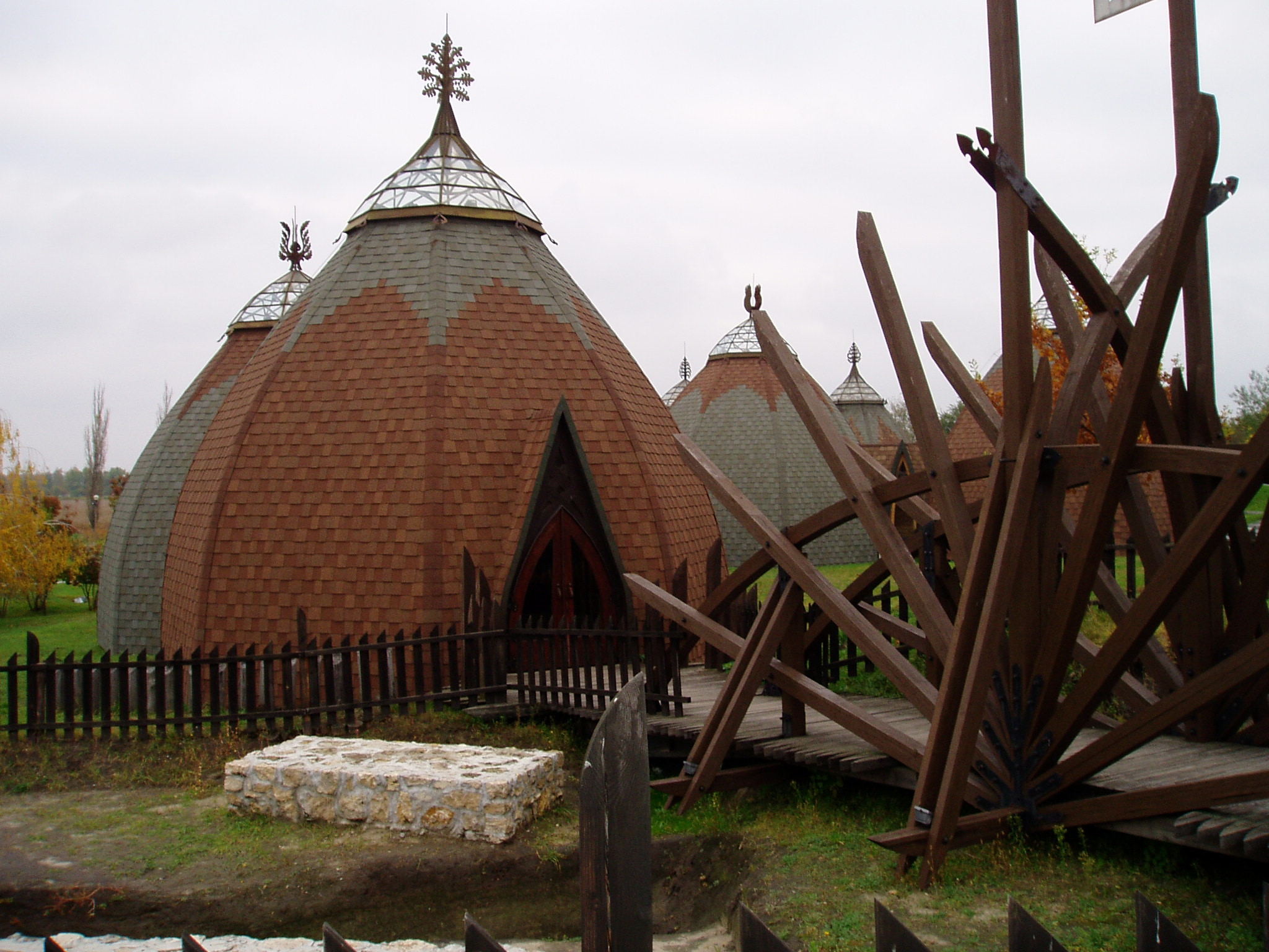 Nyilvános 1111 | 2070 | Ópusztaszer, Nemzeti Történelmi Emlékpark | Az Ópusztaszeri Nemzeti Történeti Emlékparkot az 1970-es évek legelején Erdei Ferenc szociográfus, a Magyar Tudományos Akadémia akkori főtitkára kezdeményezésére kezdték megtervezni és kialakítani. Mire 1995-re befejeződött a Feszty-körkép felújítása, Magyarország népszerű múzeumi kiállítóhelyei közül is az egyik leglátogatottabb lett. A történelmi emlékpark építészeti emlékei a honfoglaló ősök életmódját idézik. Az építészeti kialakításuk miatt is kedvelt, jurta-formájú kiállítóházakat Csete György és Dulánszky Jenő tervezte. Berendezésüket a honfoglalás kori ötvösművészetnek a motívumai ihlették. A fénykép 2004 októberében készült. Felh. irod.: www.vendegvaro.hu www.opusztaszer.hu |