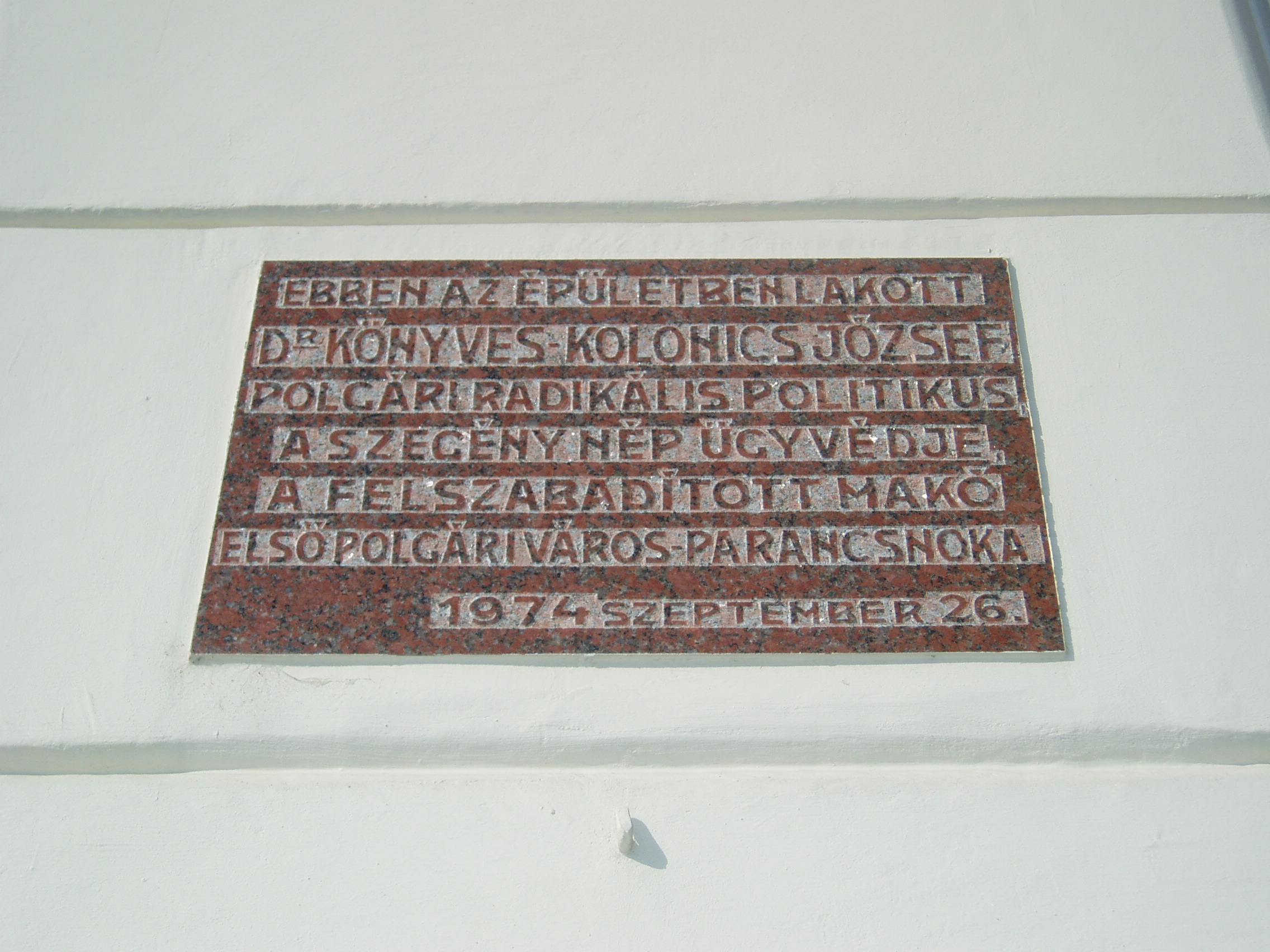 Nyilvános 976 | 1459 | Makó, József Attila utca 2. | Ebben a házban lakott Könyves Kolonics József (1884-1955) polgári radikális politikus, a szegények ügyvédje, 1945 után Makó első polgári városparancsnoka. Emléktábláját születésnek 90. évfordulóján állították. A fénykép 2007 júliusában készült. |