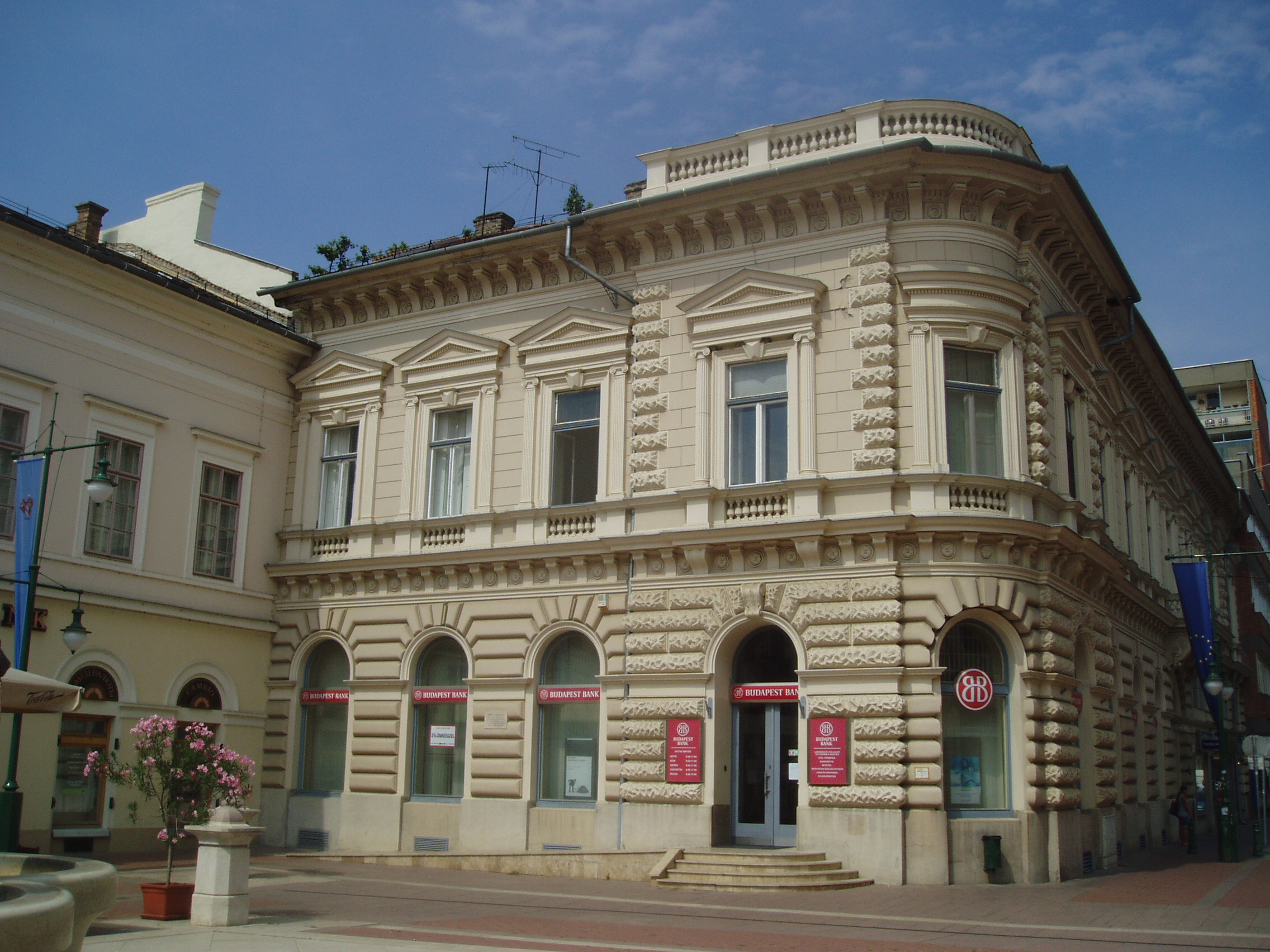 Nyilvános 944 | 1348 | Szeged, Klauzál tér 4. | A tér nyugati oldalán kiszögellő eklektikus épületben hajdan híres kávéház működött. Tulajdonosa Ströbl József, Tömörkény István anyai nagybátyja volt. A fénykép 2007 júliusában készült. Felh. irod.: Péter László: Szeged. Bp. Panoráma, 1981 |