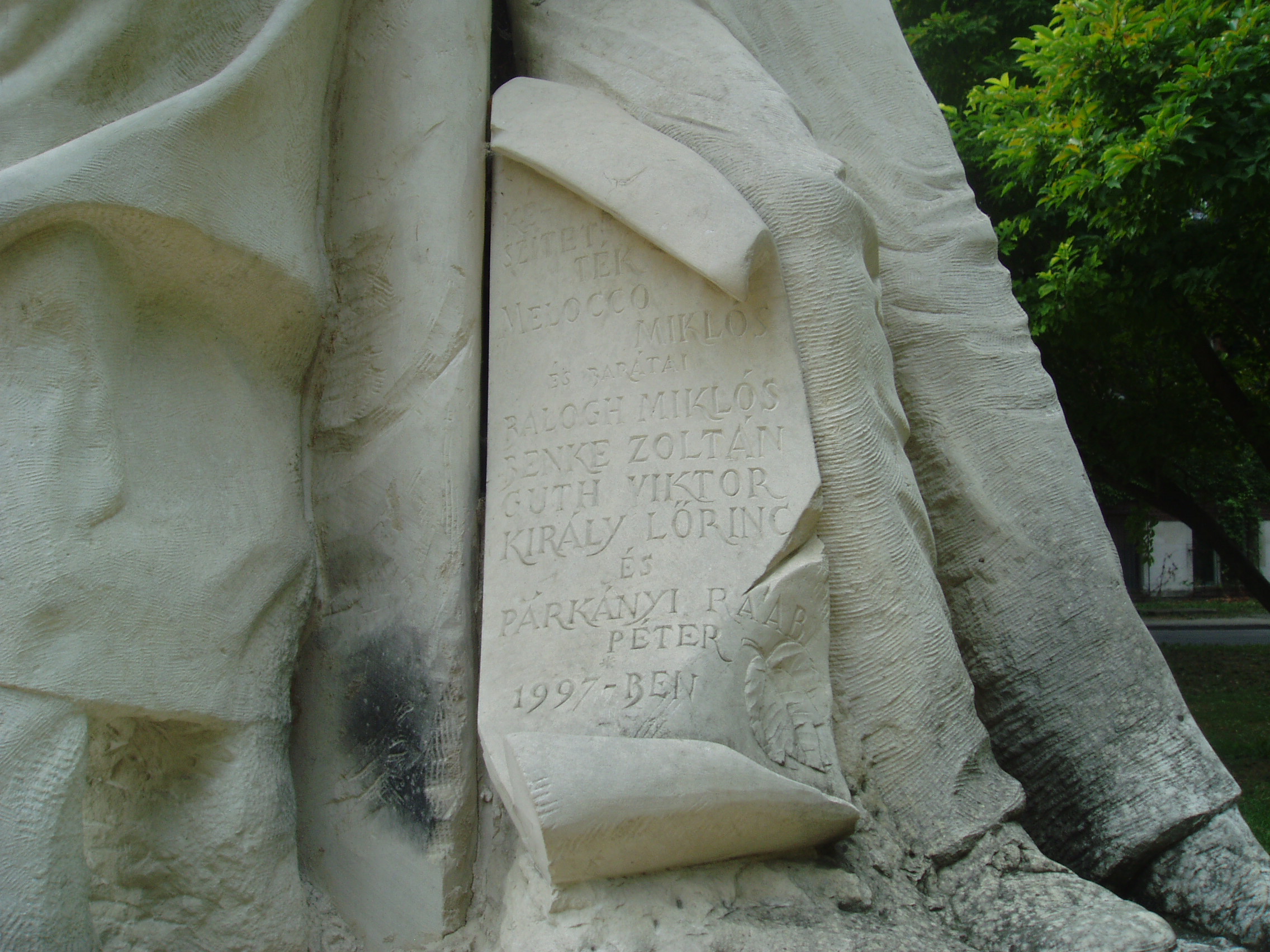 Nyilvános 954 | 1482 | Szeged, Rerrich tér: Melocco Miklós 1956-os emlékműve | Szeged egyik legelzártabb terén, egy nagy oktatási épület és a Dóm tér között áll Melocco Miklós bolgár mészkőből faragott 1956-os emlékműve, amelyen egy óriás lepkét, a szabadság szimbólumát emelik magasba az 56-os forradalom vértanúi. Alkotója így vallott a szoborcsoportról: "A felnagyított rovarban van valami a szörnyből, hatalmas fej összetett szemekkel, pödörnyelvvel, erős rágókkal, ijesztő, mint egy tank. Nekem ez a szabadság lepkéje. De a Szabadság cserben hagyta a szabadságharcosokat. Voltaképpen uszító volt, felbujtó, pillanatokra mindenki érezte, mi ez, de beszélni már nem tudott róla, mert annyira gyorsan illanó dolog. Talán nem is létezik, mint az abszolút igazság. Mégis olyan toborzó erejűnek mutatkozott 1956-ban, hogy érdemes volt meghalni is érte. ... ... nem az úgynevezett sztárokat, a forradalom arisztokráciáját, Nagy Imrét, Malétert akartam ‘56-ból megörökíteni, mert az másmilyen szobrot követelt volna, hanem az utca népét, akiket magam is ismertem, ismerem. ... A szoborcsoportoknak nevet, fejezetcímeket, mint a regényekben szokás, nem adtam. De van benne szerelmes pár, vagy ember pár; van bajtárs, ahogy Komondi Sándor megragadja Csűrös Zoltánt, aki összeesik. Egy-egy arc több típust is képvisel. Van ott egy elegáns úr, aki visszafordulna, de a tömeg nem engedi. Börtönben is ült valamikor, de ő csak győztes akart lenni, nem hősi halott. A szobor hátsó részen ott fekszik Danner János alakja, akin átlépnek, mert nem veszik észre, hogy meghalt. Észrevétlenül vált halott hőssé. Nem volt sem időm, sem pénzem arra, hogy szót ejtsek a pocsék emberről, a gyáváról, aki elbújva várta ki a fejleményeket. Én csak a szépet akartam megmutatni..." A fénykép 2007 júliusában készült. Felh. irod.: Buka Adrienne: A szabadság pillangója. Melocco Miklós a szegedi '56-os emlékműről. = www.sulinet.hu |
