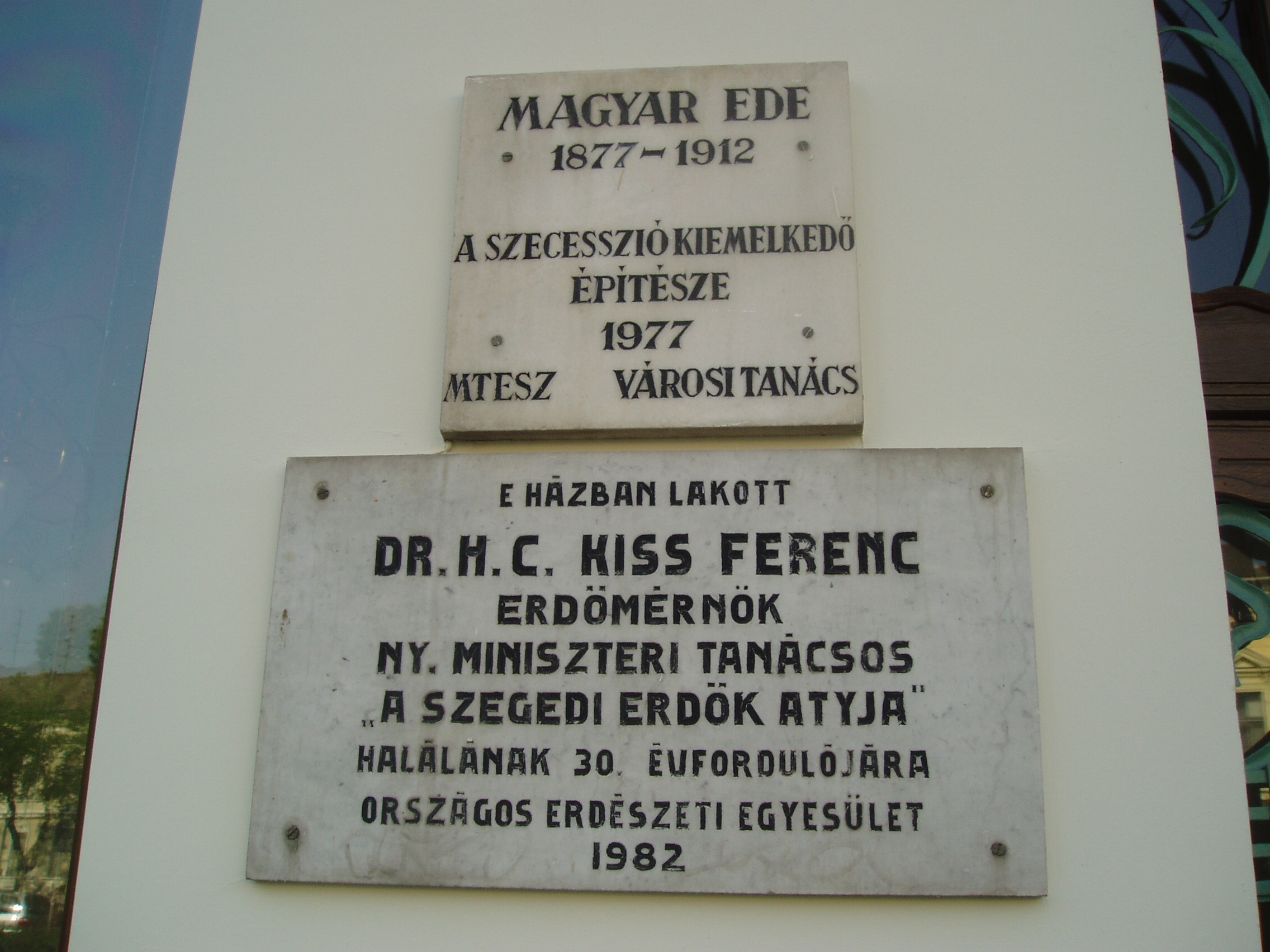Nyilvános 1020 | 1399 | Szeged, Tisza Lajos körút 56. Reök-palota | A Reök-palota 1907-ben épült szecessziós stílusban Magyar Ede (1878-1912) tervei szerint. Az annakidején lakóházként funkcionáló épület lakója volt Kiss Ferenc főerdőtanácsos. 1860-ban született a Sopron megyei Szilsárkányban, egyszerű parasztszülők nyolcadik gyermekeként. A selmecbányai Erdészeti Akadémián szerzett erdőmérnöki oklevelet, majd 1885-ben erdőtisztként Szegedre került, hogy felügyelje a város körüli, állami kezelésbe adott erdőket. Szívügye volt az Alföld homokterületeinek betelepítése, nem véletlenül nevezték "a szegedi erdők atyjának". A palotán Magyar Ede építész emléktábláját is elhelyezték. A fénykép 2007 júliusában készült. Felh. irod.: Péter László: Szeged. Bp. Panoráma, 1981 www.puszta.com/hun/programs/cikk/reok_palota_ujjaszuletese |