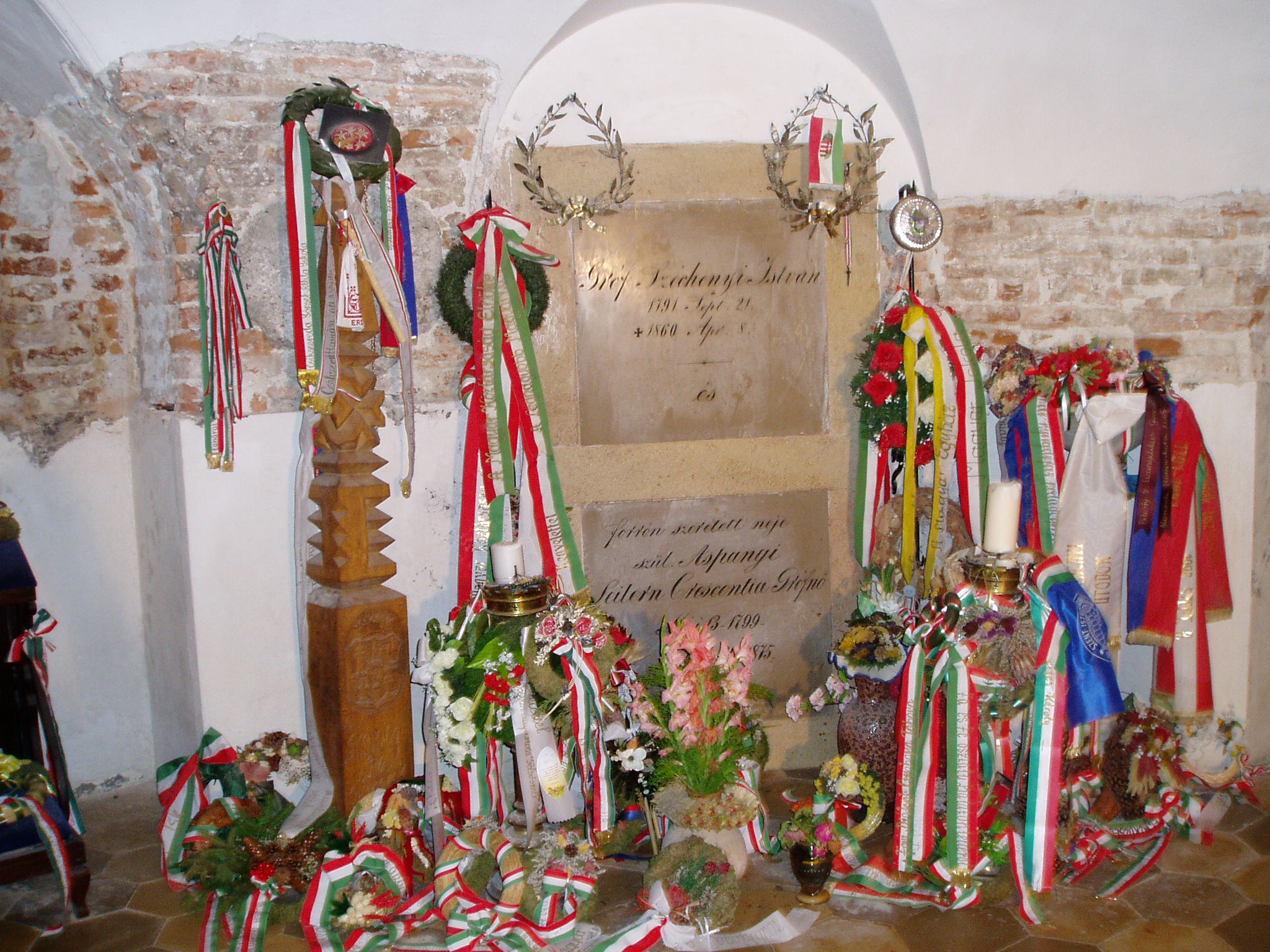 Nyilvános 1406 | 8880 | Nagycenk, Mauzóleum: Széchenyi István és felesége sírja | A Széchényi család nyughelyét a temető létesítésével egyidőben Széchényi Ferenc építtette 1778-ban. A barokk stílusú sírkápolnát 1806-10 között klasszicista előtérrel bővítették. A téglalap alakú előcsarnok kazettás mennyezetét ion oszlopok tartják. Az ovális alaprajzú kápolnát kupola fedi, több kutató véleménye szerint Dorffmeister István freskóival. Innen jutunk a kriptába, a család számos jeles tagjának végső nyughelyére, ahol koszorúszalagok tömege övezi Széchenyi István és felesége, Seilern Crescencia sírkamrájának zárólapját. A fénykép 2005 júliusában készült. Felh. irod.: Látnivalók Győr-Moson-Sopron megyében. Miskolc, Well-PRess, 2000 |