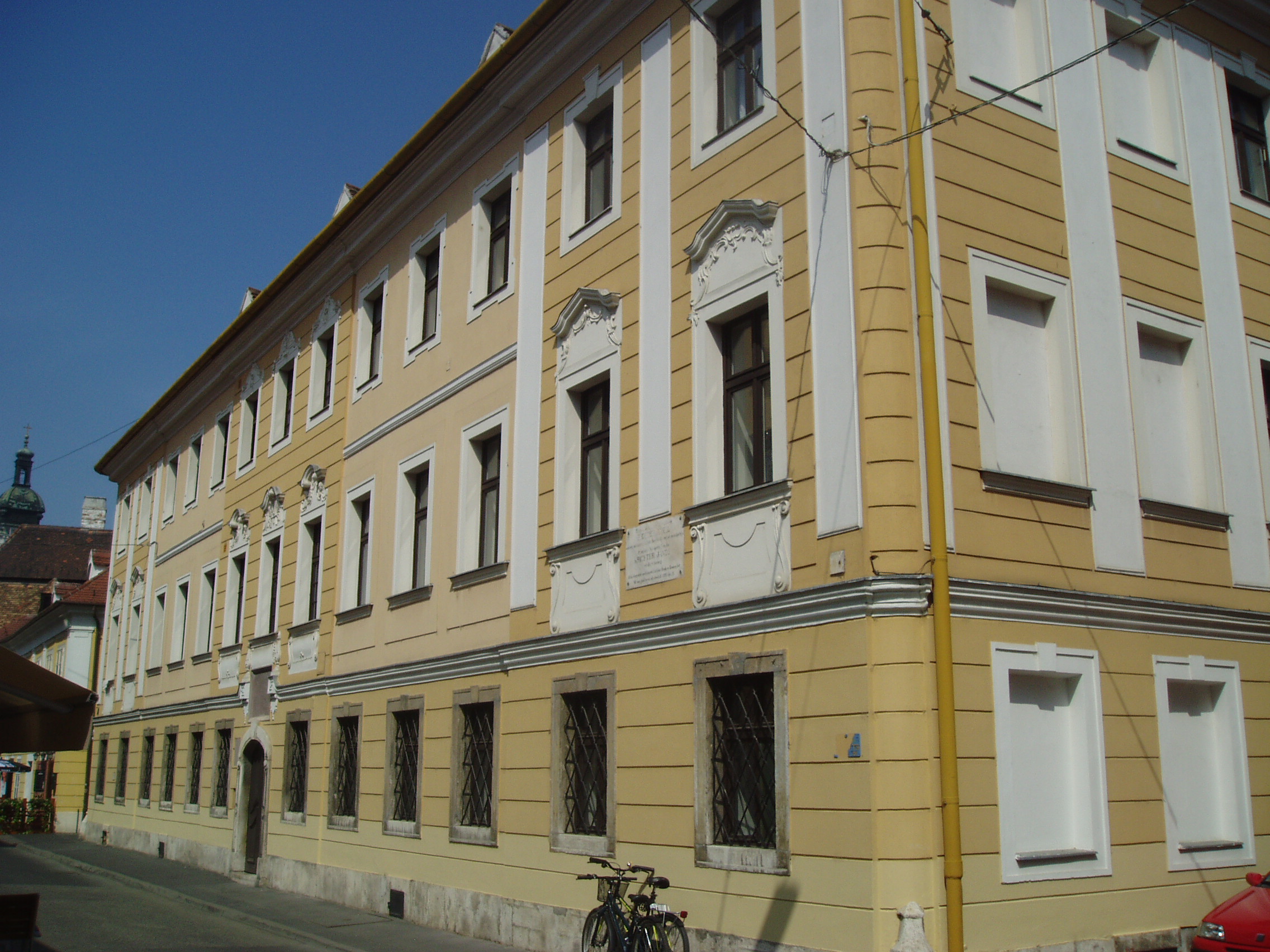 Nyilvános 1089 | 1737 | Győr, Apáca utca 5. Káptalani zenészek háza | A XVI. század első felében ezen a telken a városháza állott. Abban rendezték be a a székeskáptalan által fenntartott XVI–XVII. századi „magyar iskolát”, amelyet káptalandombi otthonából a német katonaság üldözött el. Az ekkor már kétemeletes épület az iskola mellett a székesegyházi (lásd: Győr, Káptalandomb: Székesegyház) muzsikusoknak is otthona lett, mint a Káptalani zenészek háza. Lakott benne Istvánffy Benedek, aki 1778 előtt működött a székesegyház zenei vezetőjeként, majd 1832 és 1854 között itt lakott Richter Antal. Felesége nagyszerű énekesnő volt. 1843. április 4-én ebben a házban született fiuk, Richter János (Hans Richter), a későbbi legendás Wagner–karmester. A felvétel 2008 május végén készült. Felh. irod.: Cziglényi László: Győr. Bp. Panoráma, 1981 Orbánné Horváth Márta: Emlékművek, emléktáblák győri kislexikona. Győr, Városi Könyvtár, 2001 Vavrinecz Veronika: Richter Antal (1802–1854) élete és működése. 2003, Szkarabeusz Kiadó |