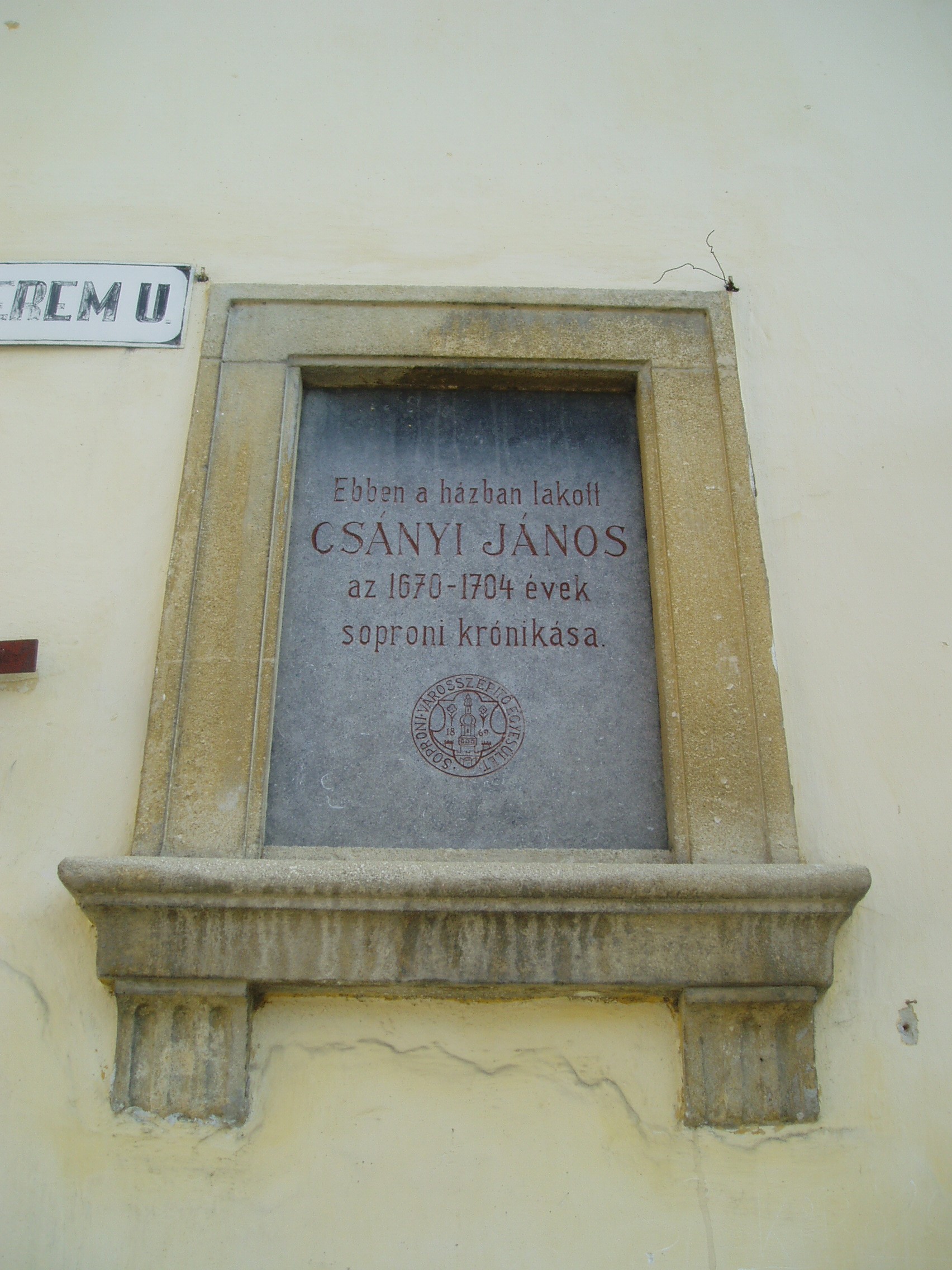 Nyilvános 966 | 1462 | Sopron, Fövényverem utca 1. | A Bécsi külváros jellegzetes utcájának 1. számú háza a XVII. század második felében Csányi János soproni krónikásé volt. Mai formáját a XVIII. század elején kaphatta, bár homlokzatát a XIX. és a XX. században erősen átalakították. Csányi János (Hanns Tschány) egy, a XVII. század második és a XVIII. század első felében élt soproni evangélikus polgár volt. Sopron város tanácsának tagjaként működött, hivatalából azonban — nem tudni milyen okból — 1683-ban elbocsátották. Ezután bányamesterként dolgozott. E pozíciójában — más bányavárosokhoz hasonlóan — a bányaigazgatás teendőit látta el. Naplójának eredeti címe a kissé cirkalmas "Verzaichnus Etlicher Historien so von den 1670 Jahr her geschehen Ihn den Königreich Ungern, und absonderlich bey unser Stath Oedenburg welche ich Hanns Tschány zur sonderlicher Nachricht den Nachkömlingen hab aufgeschrieben" volt. A krónikás megörökítette a városban történt lényeges eseményeket, többek között a Haley-üstökös 1682 augusztusában történő feltűnését is. A napló az 1670-es esztendőben indul, és 1704-ben zárul, de már az utolsó évet fia, Csányi György Fülöp jegyezte. A feljegyzések nyomtatásban is megjelentek 1858-ban Pesten Paur Iván gondozásában, magyarázó előszóval a Magyar Történelmi Tár V. kötetében, valamint 1934-ben Sopronban, Ungarische Chronik vom Jahre 1670 bis 1704. Kivonat Hans Tschány’s… krónikás könyvéből címmel. A fénykép 2008 júniusában készült. Felh. irod.: Czellár Katalin: Sopron. 3. jav. kiad. Bp. Panoráma, 2000 http://csillagaszattortenet.csillagaszat.hu/magyar_17-18._sz._csillagaszata/csanyi_20080213.html |