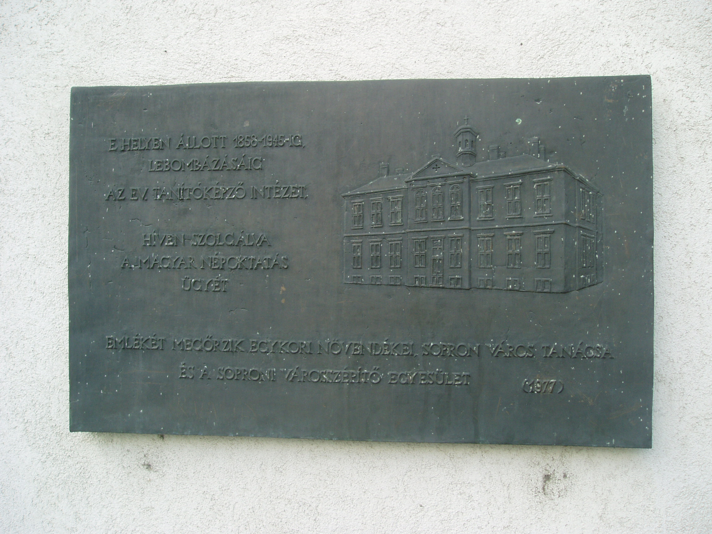 Nyilvános 982 | 1262 | Sopron, Frankenburg utca 24. | A Frankenburg utca és a Deák tér sarkán állt egykor soproni evangélikus tanítóképző intézet. A modern utódépületen elhelyezett emléktáblán az 1945-ben lebombázott iskolaépület ábrázolása látható. A fénykép 2008 júniusában készült. |