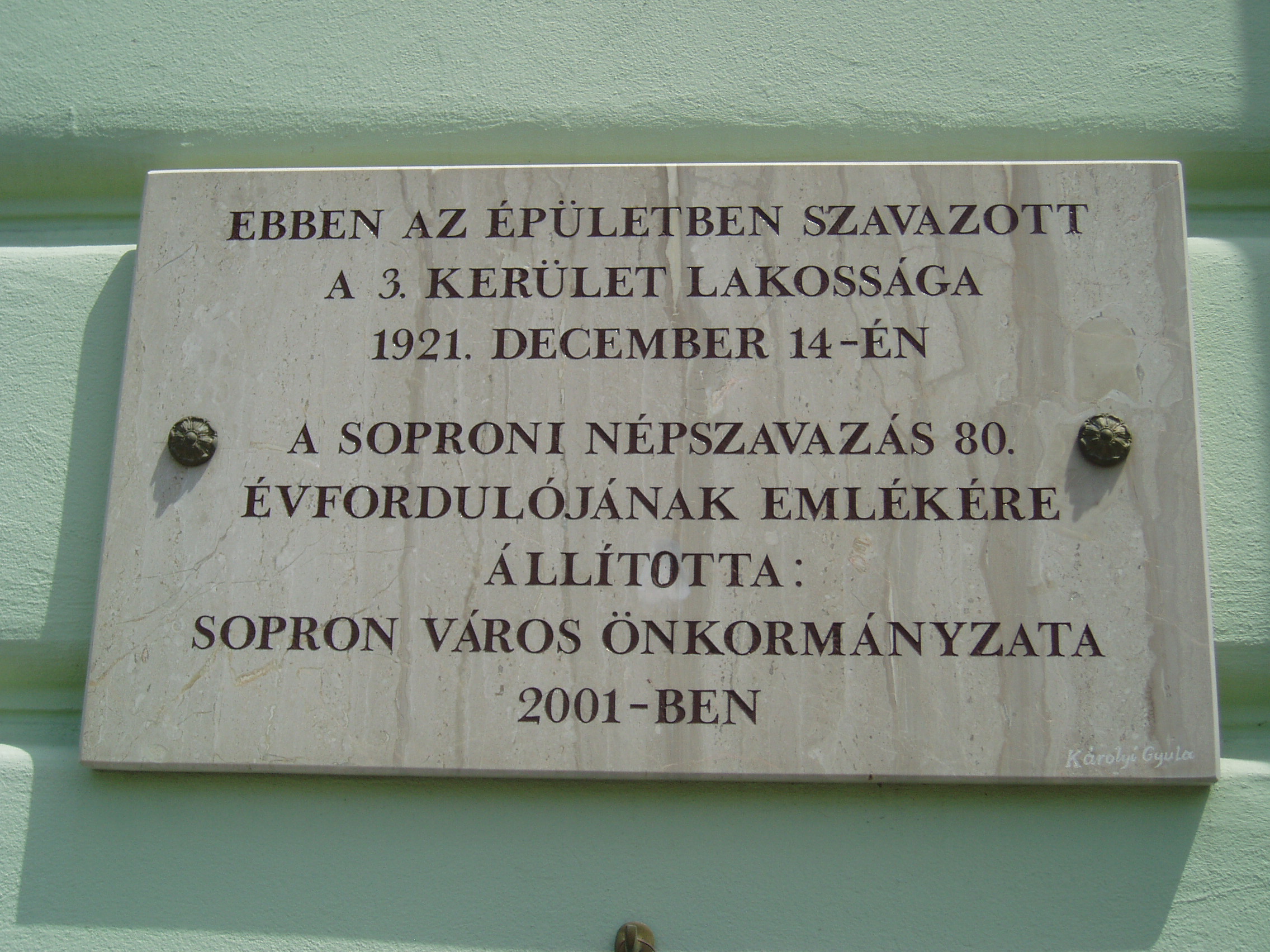 Nyilvános 940 | 1437 | Sopron, Halász utca 25. | A Petőfi Sándor Általános Iskola falán emléktábla hirdeti, hogy valaha helyén az a kaszárnya állt, amelyben 1839/40 telén katonáskodott Petőfi Sándor. Egy másik tábla arra emlékezik, hogy a mai iskolaépület volt az egyik helyszíne a soproni népszavazásnak 1921. december 14-én. A fénykép 2008 júniusában készült. |